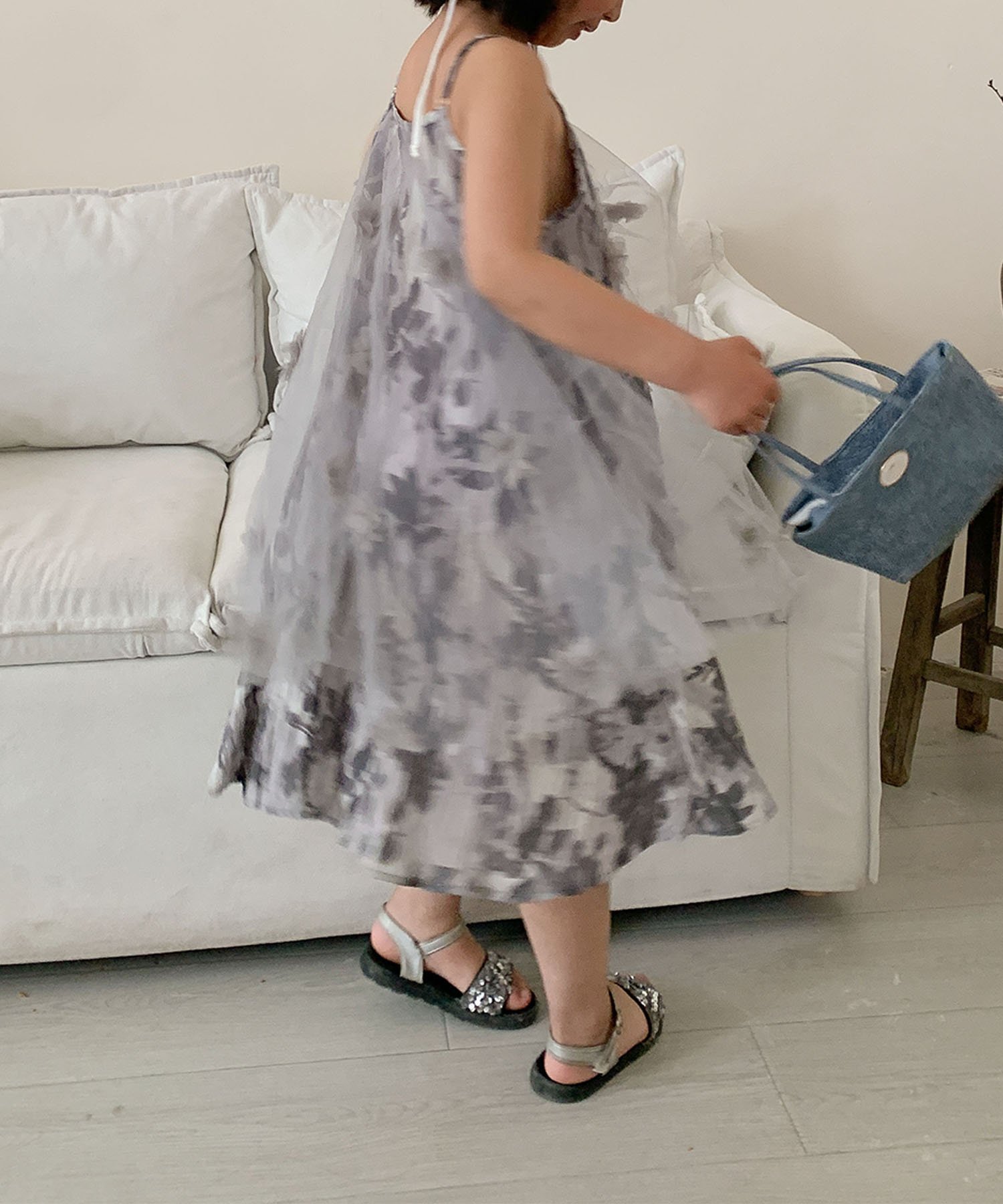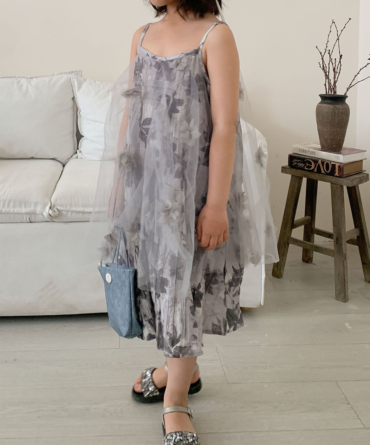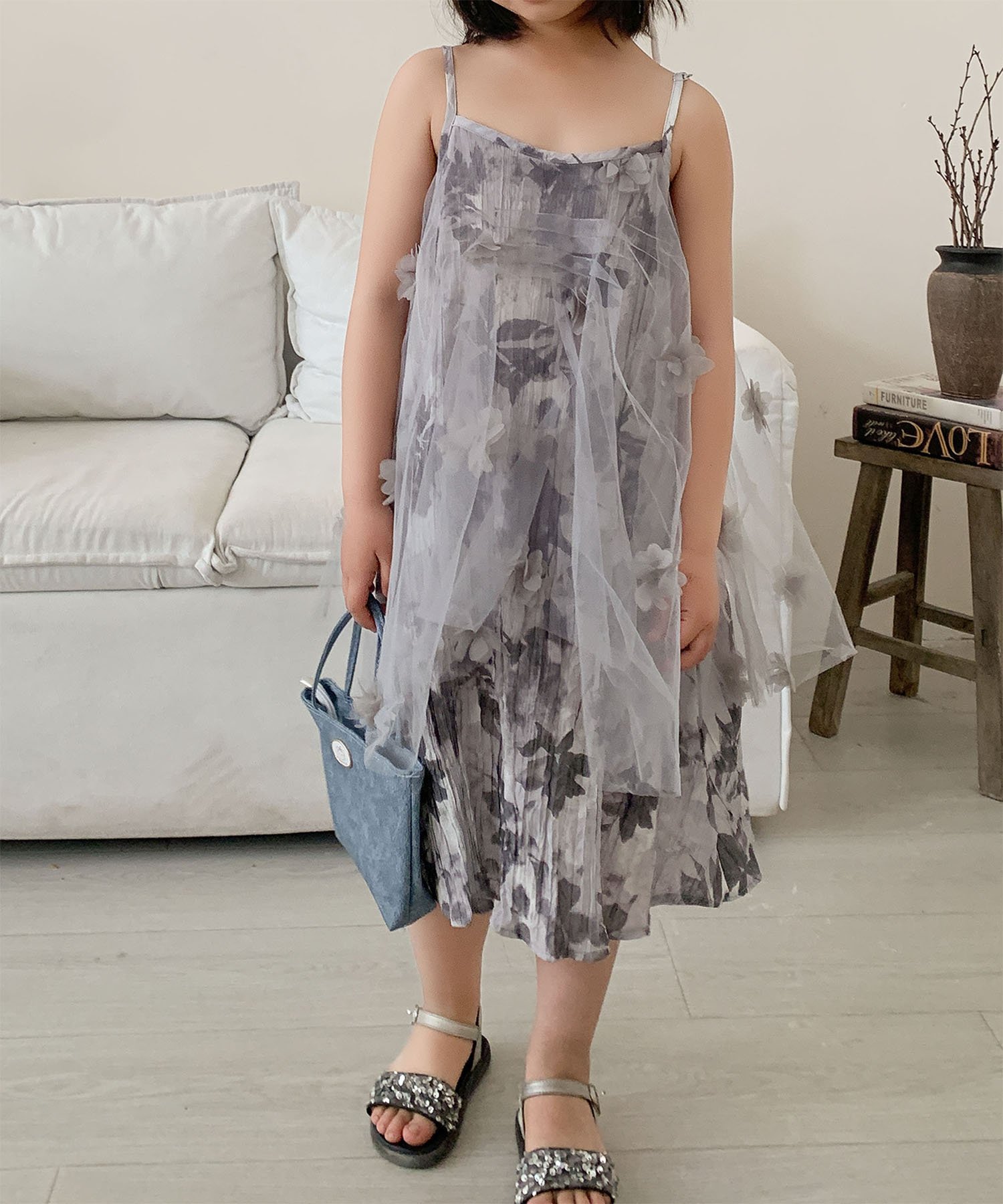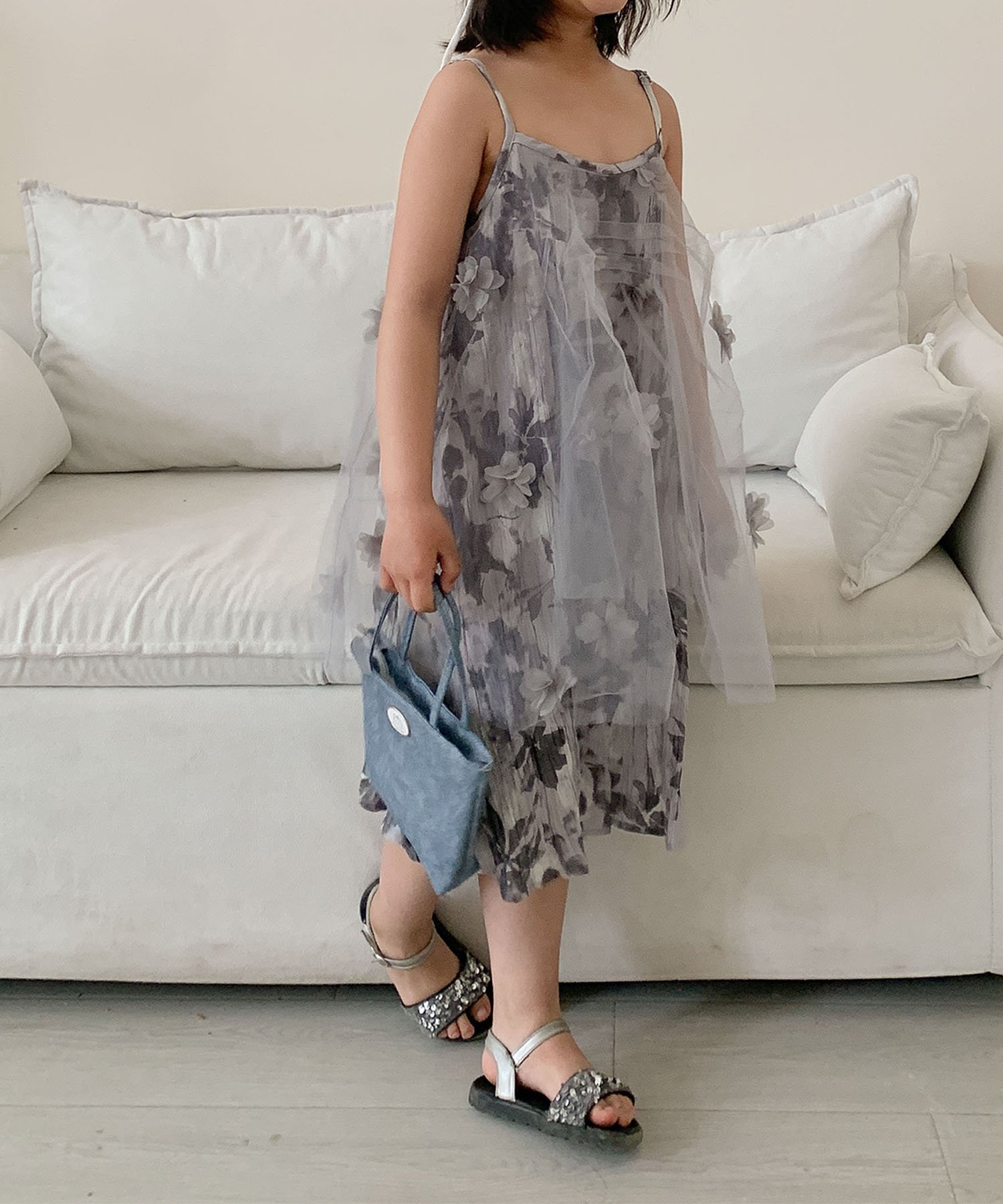 Это платье-комбинация, напоминающее платье, украшено нежным цветочным узором, наложенным на легкий и воздушный шифон. Мягкий силуэт колышется при каждом движении, что делает его идеальным дополнением к образу вашей дочери.