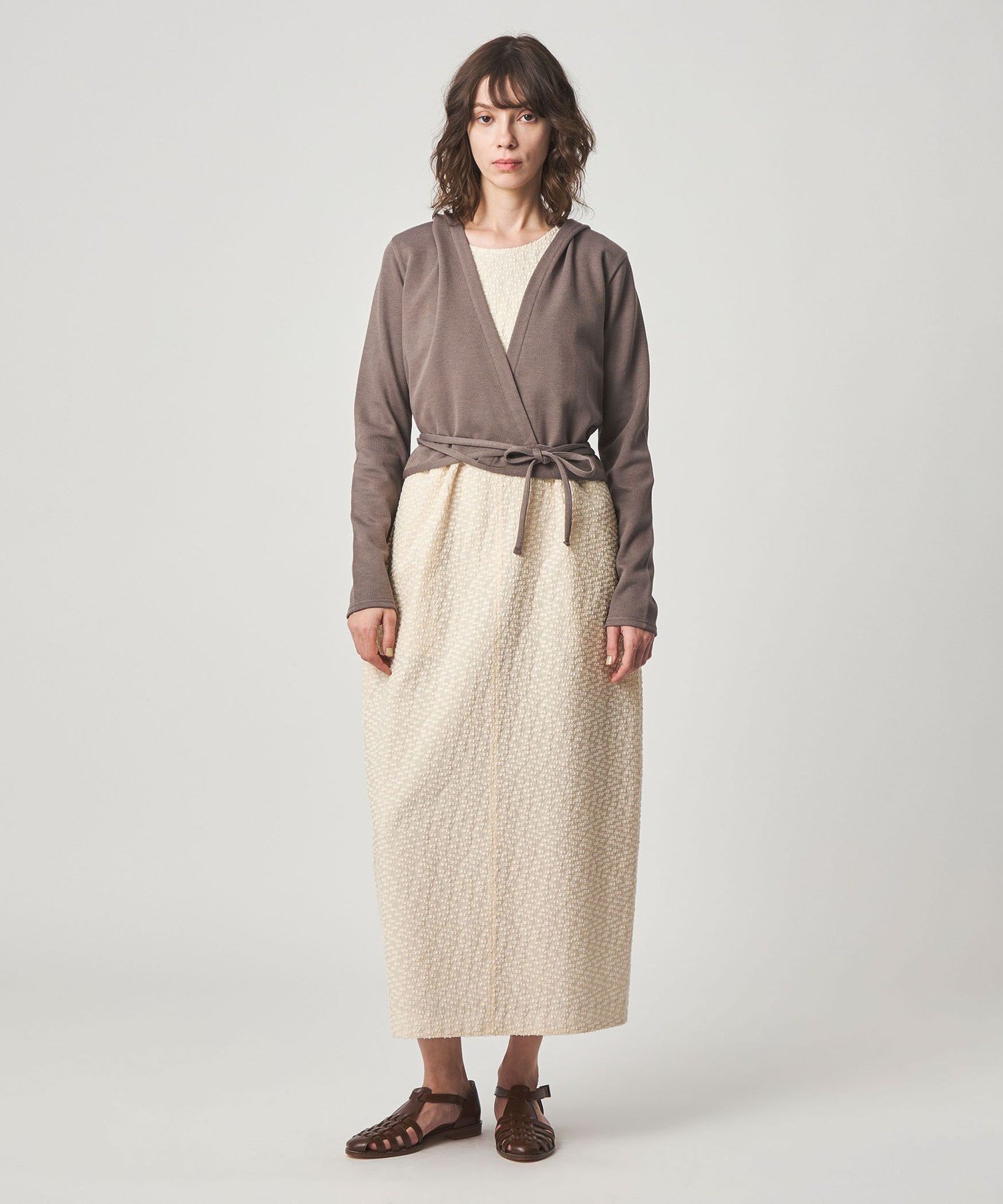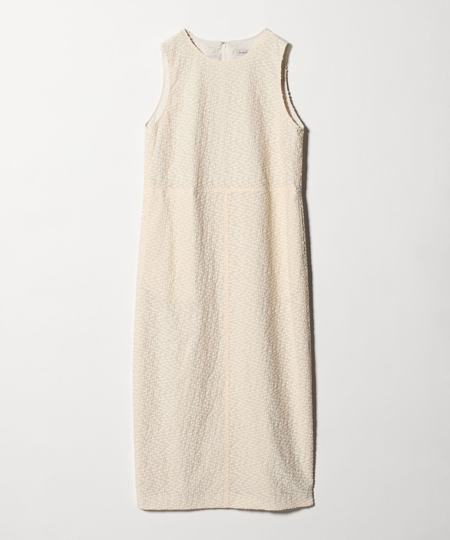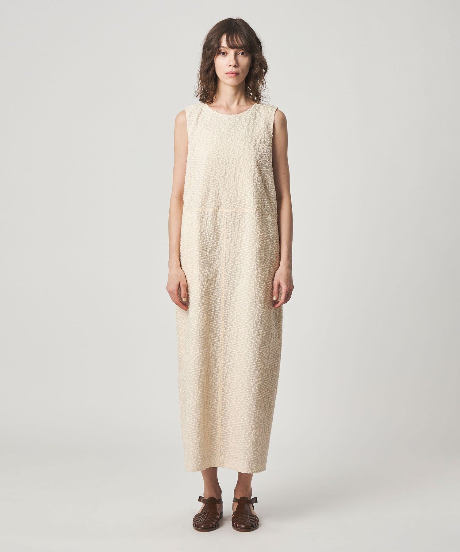 Это платье без рукавов сшито из жаккардовой ткани, украшенной небольшим ленточным мотивом. Ткань обладает нежной прозрачностью, но при этом имеет оптимальную плотность и легкость. Юбка имеет слегка округлый, похожий на кокон силуэт, а простой дизайн без рукавов подчеркивает текстуру материала. Длинная длина также создает элегантное впечатление. Идеально подходит для повседневных образов с топом из сшитой на заказ ткани или для особых случаев, это платье универсально и подходит для самых разных случаев. В этой же серии также доступен жакет-блузон.