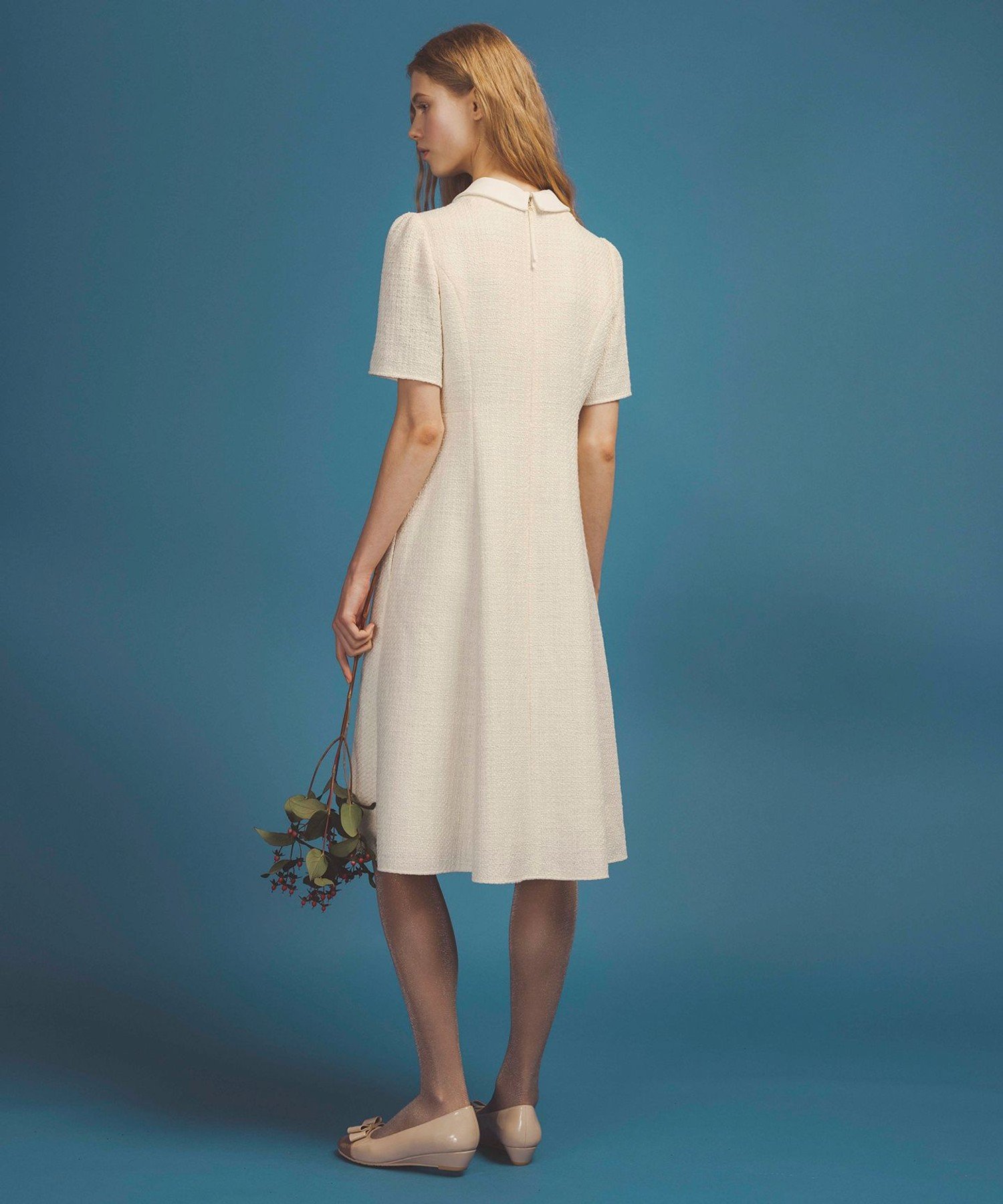 Дизайн отличается съемным воротником, что делает его универсальным. С классическим воротником оно создает аккуратный и опрятный образ, идеально подходящий для торжественных случаев. Без воротника оно создает чистый, утонченный образ, придавая ему более зрелый и шикарный вид. Этот превосходный двусторонний воротник позволяет свободно менять образ в зависимости от случая и настроения. Силуэт представляет собой расклешенную линию умеренной, мягкой формы. Она естественно подчеркивает талию, а юбка слегка расклешена, создавая изысканный и элегантный образ с женственной элегантностью. Хотя оно достаточно эффектно, чтобы дополнить образ само по себе, его также можно сочетать с различными аксессуарами и слоями, создавая разнообразные образы, что делает его универсальным предметом одежды, подходящим как для работы, так и для отдыха. [Материал] Этот изысканный твид изготовлен с использованием различных декоративных нитей. Он прост в уходе и имеет богатую текстуру. Воротник изготовлен из экологически чистого, устойчивого материала. Он средней плотности, хорошо драпируется и обладает эластичностью. Это двойной атлас с воздушной текстурой и изысканным блеском.