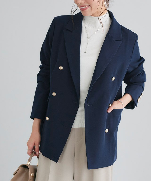 Классический пиджак, который можно носить как на работе, так и в свободное время. Двубортный дизайн и золотистые пуговицы с узором добавляют классический и модный вид. Он создает аккуратный и опрятный образ, что делает его полезным элементом гардероба. Мы также рекомендуем носить его в комплекте с брюками из того же материала.