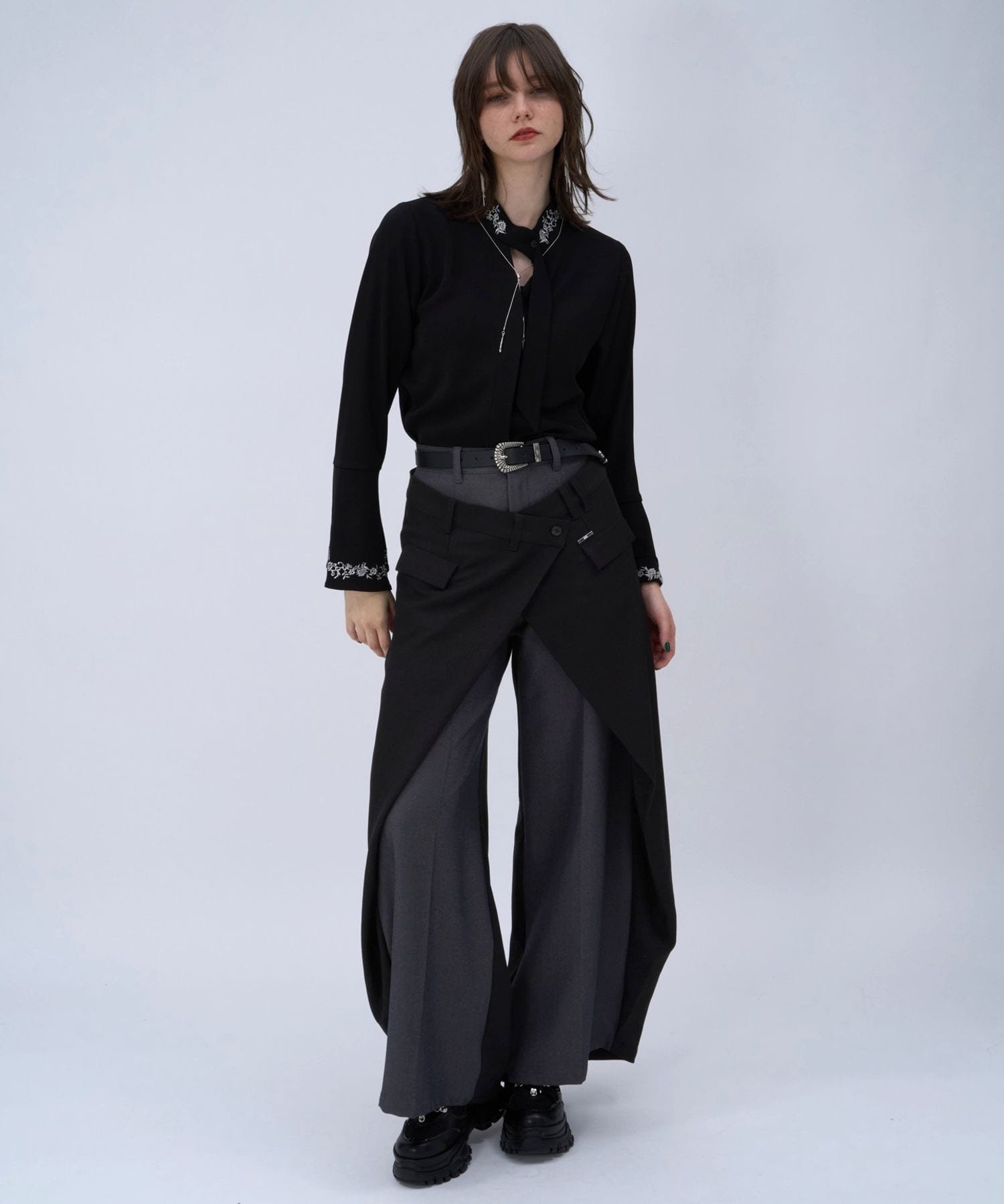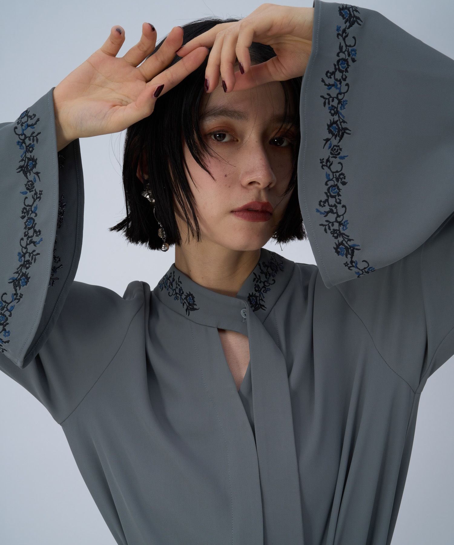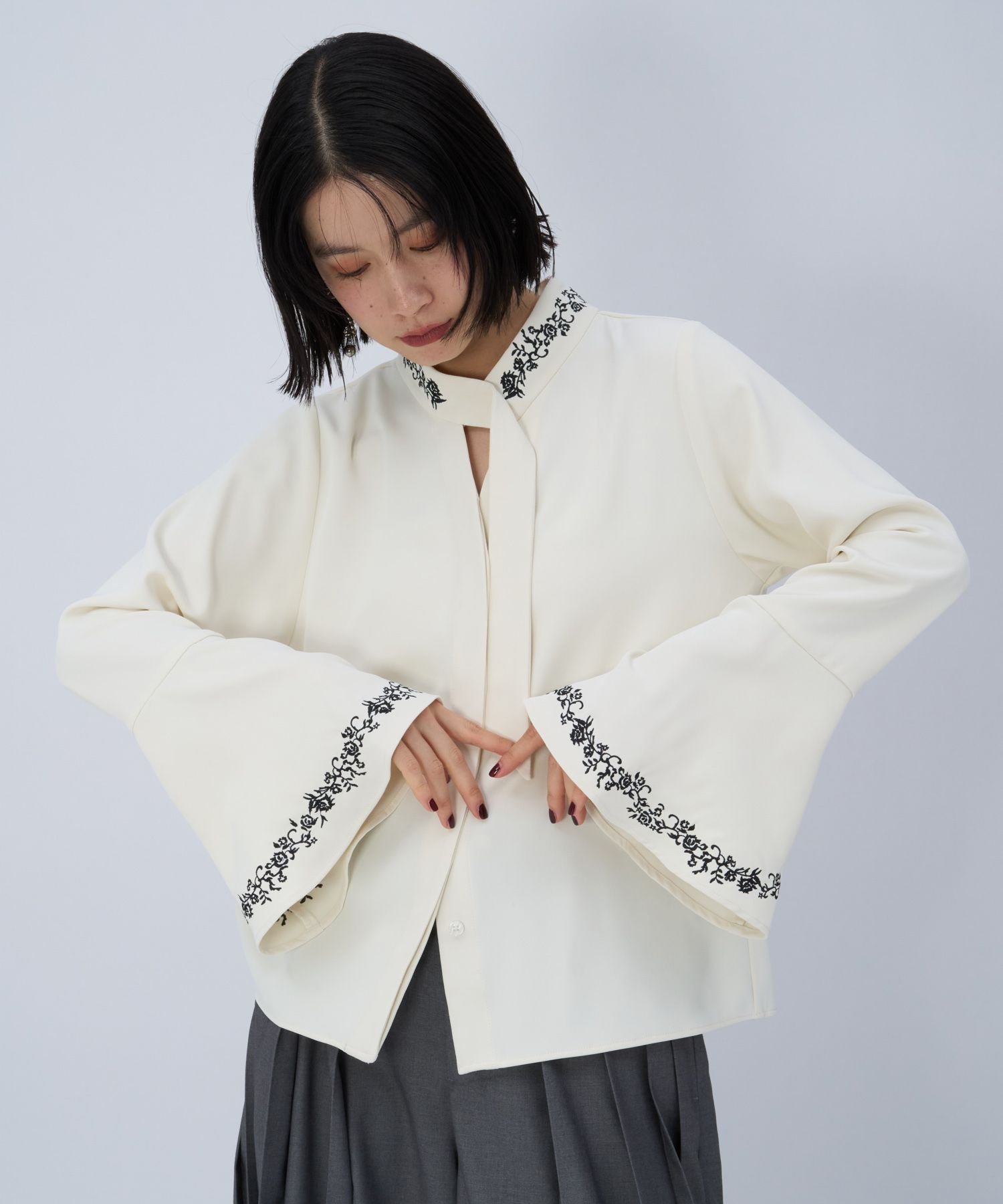 □Блузка с разрезом спереди и элегантной вышивкой на воротнике и манжетах.
