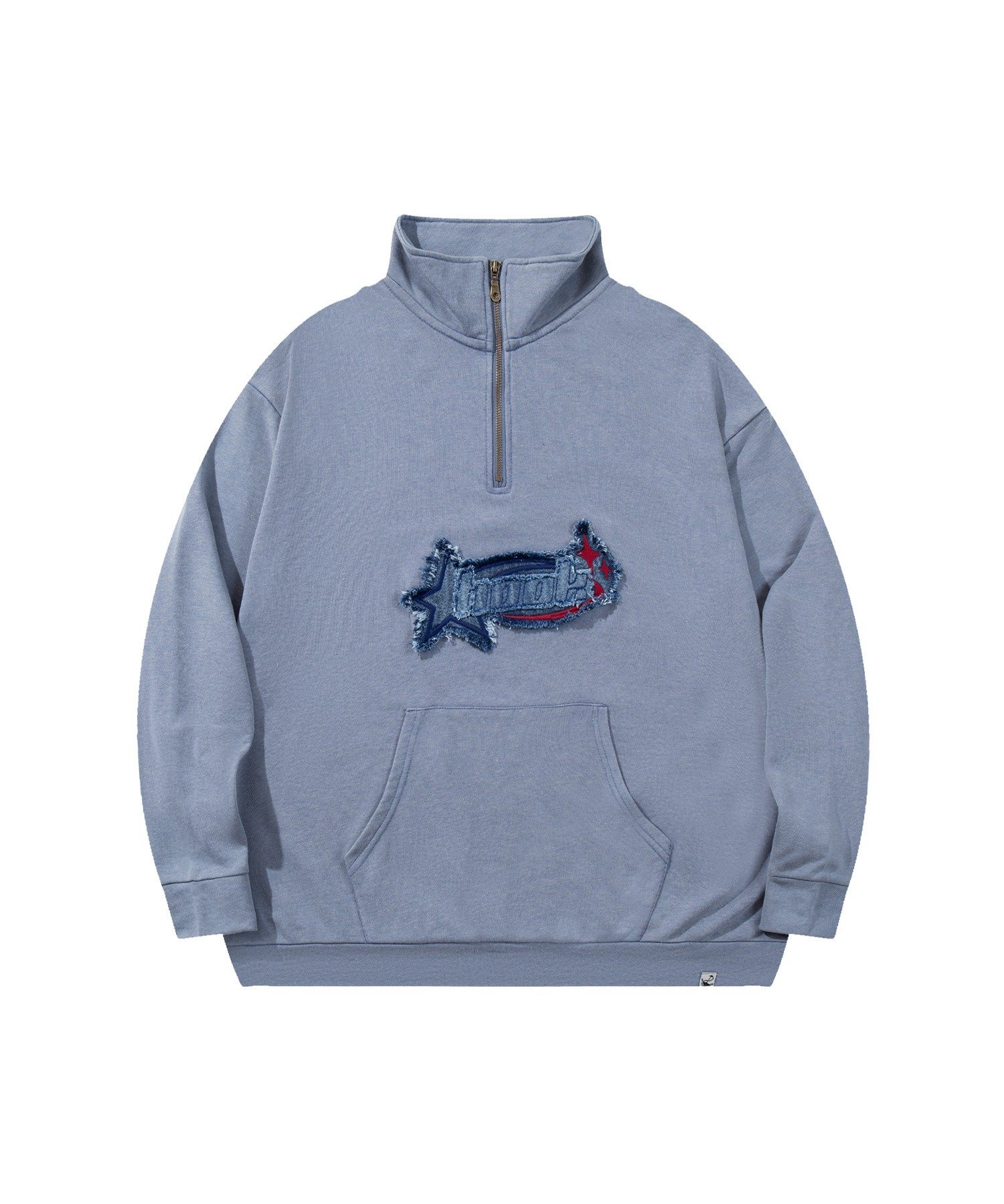 Пуловер с застежкой-молнией до середины груди, с привлекательной винтажной джинсовой отделкой.