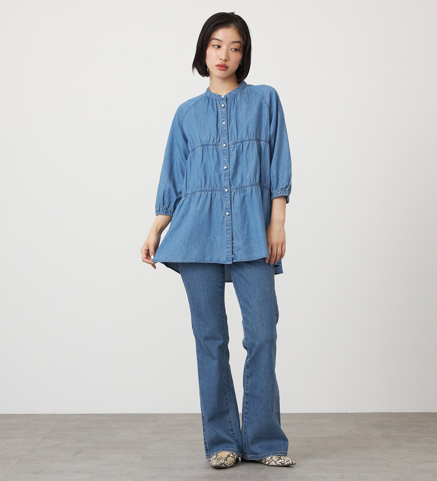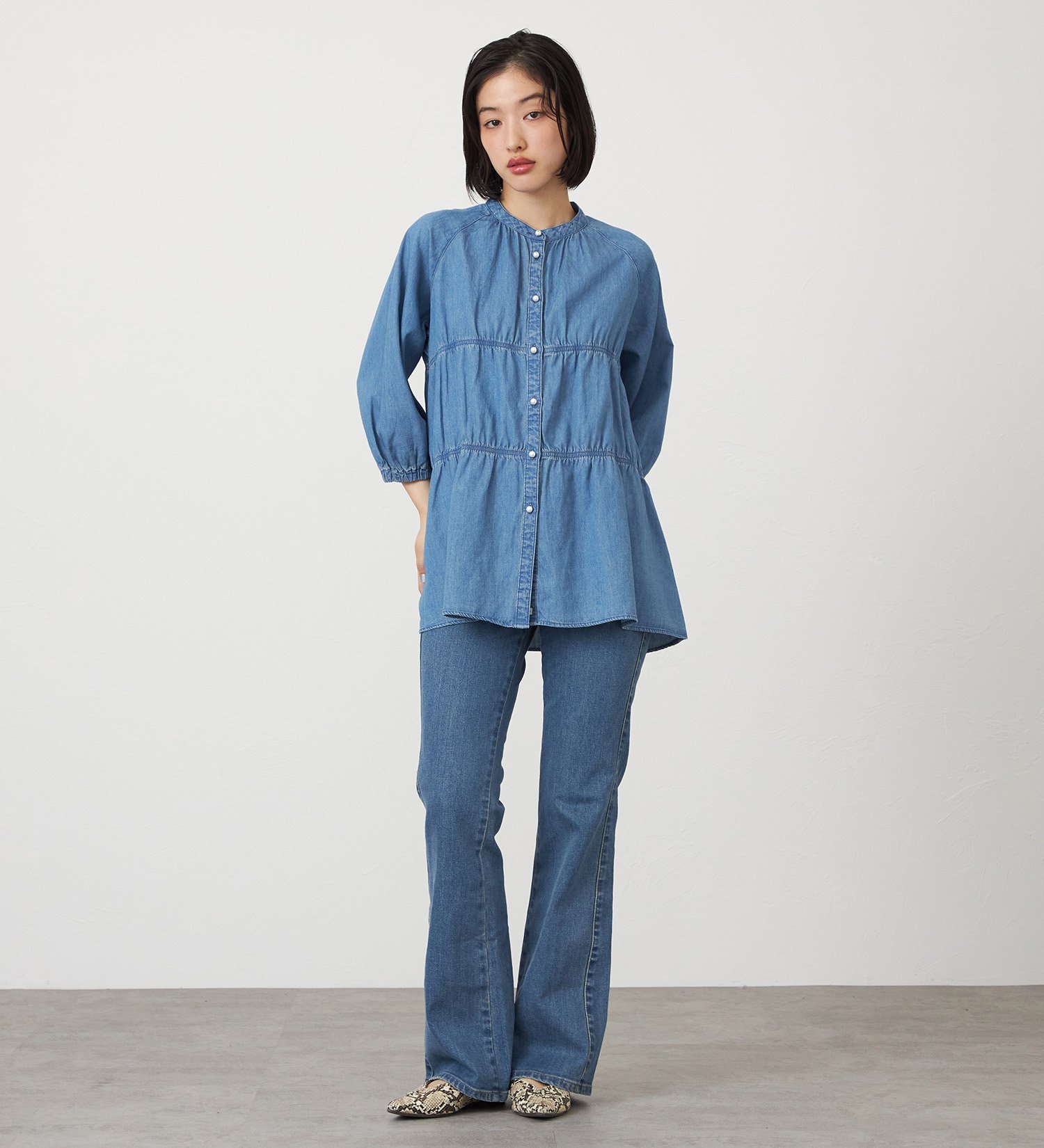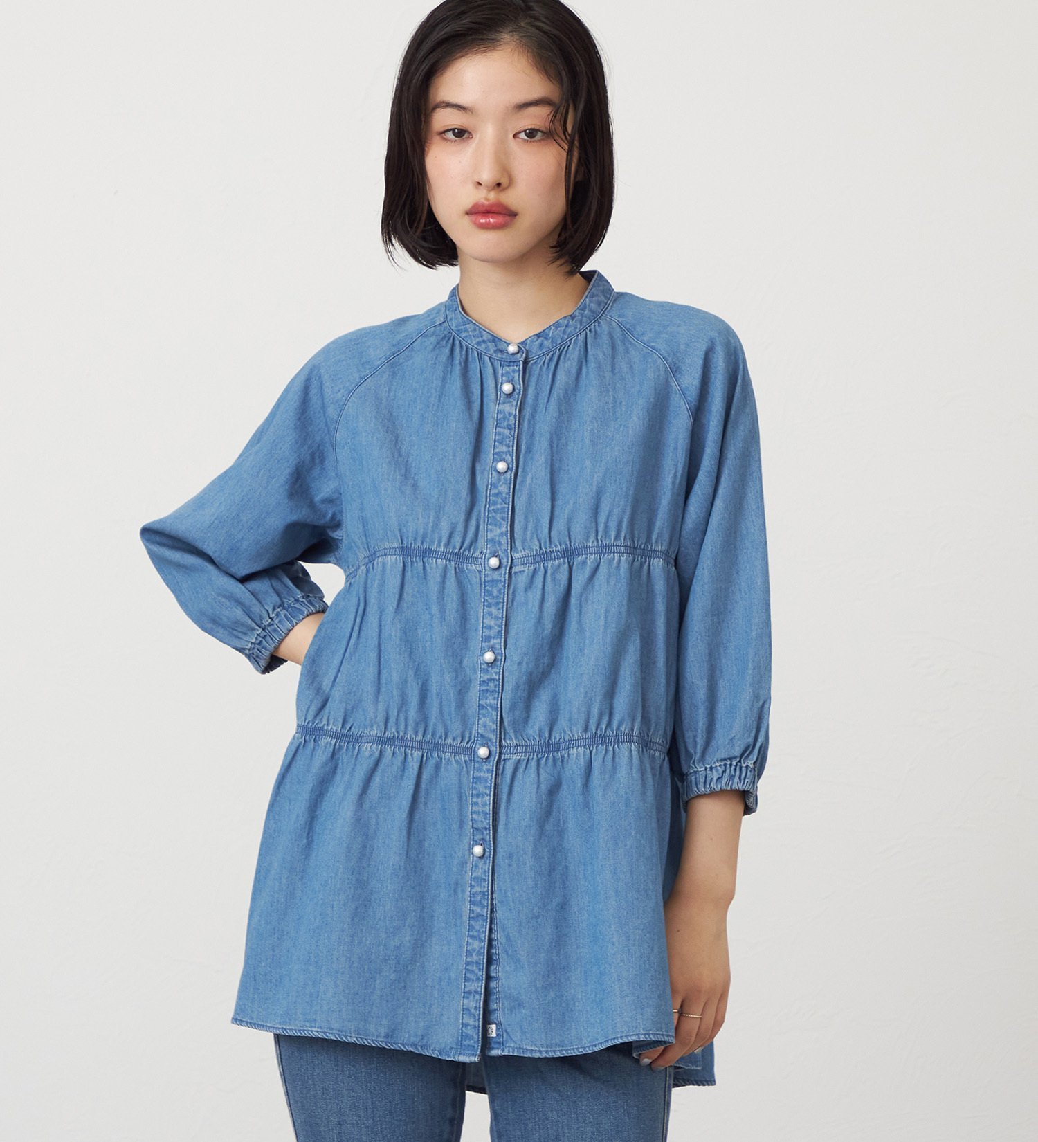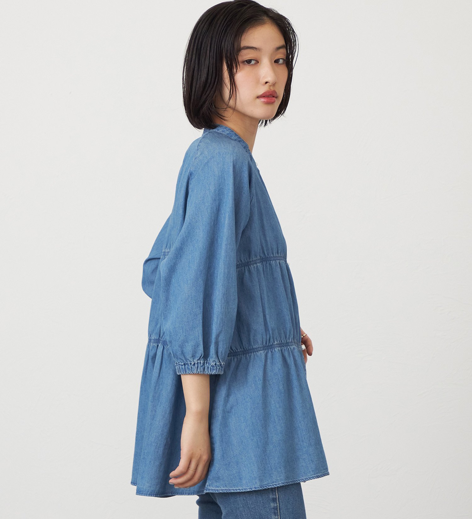 Джинсовая блузка с эффектными многослойными рукавами три четверти.