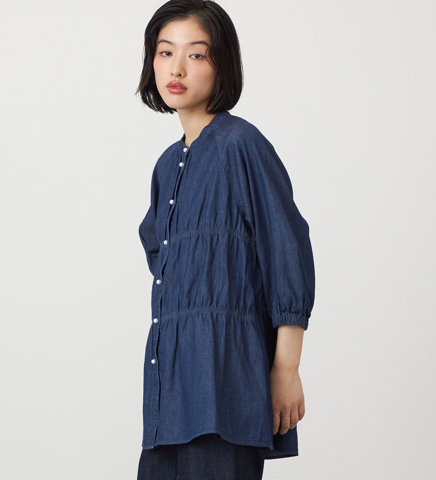 Джинсовая блузка с эффектными многослойными рукавами три четверти.