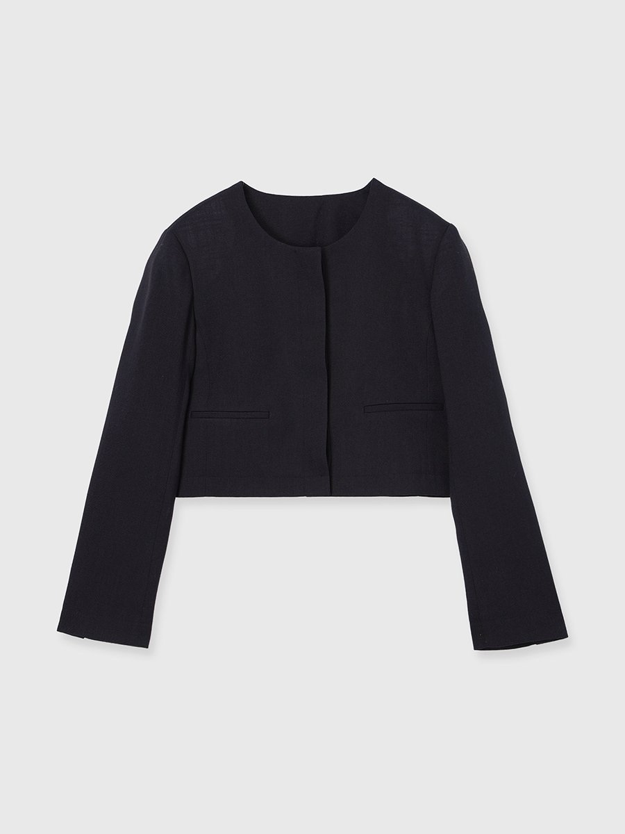 Эта вещь сочетает в себе компактную длину и минималистичные детали. Отсутствие воротника создает аккуратный вид вокруг шеи, а потайной перед и прямые, струящиеся рукава создают изысканный силуэт.