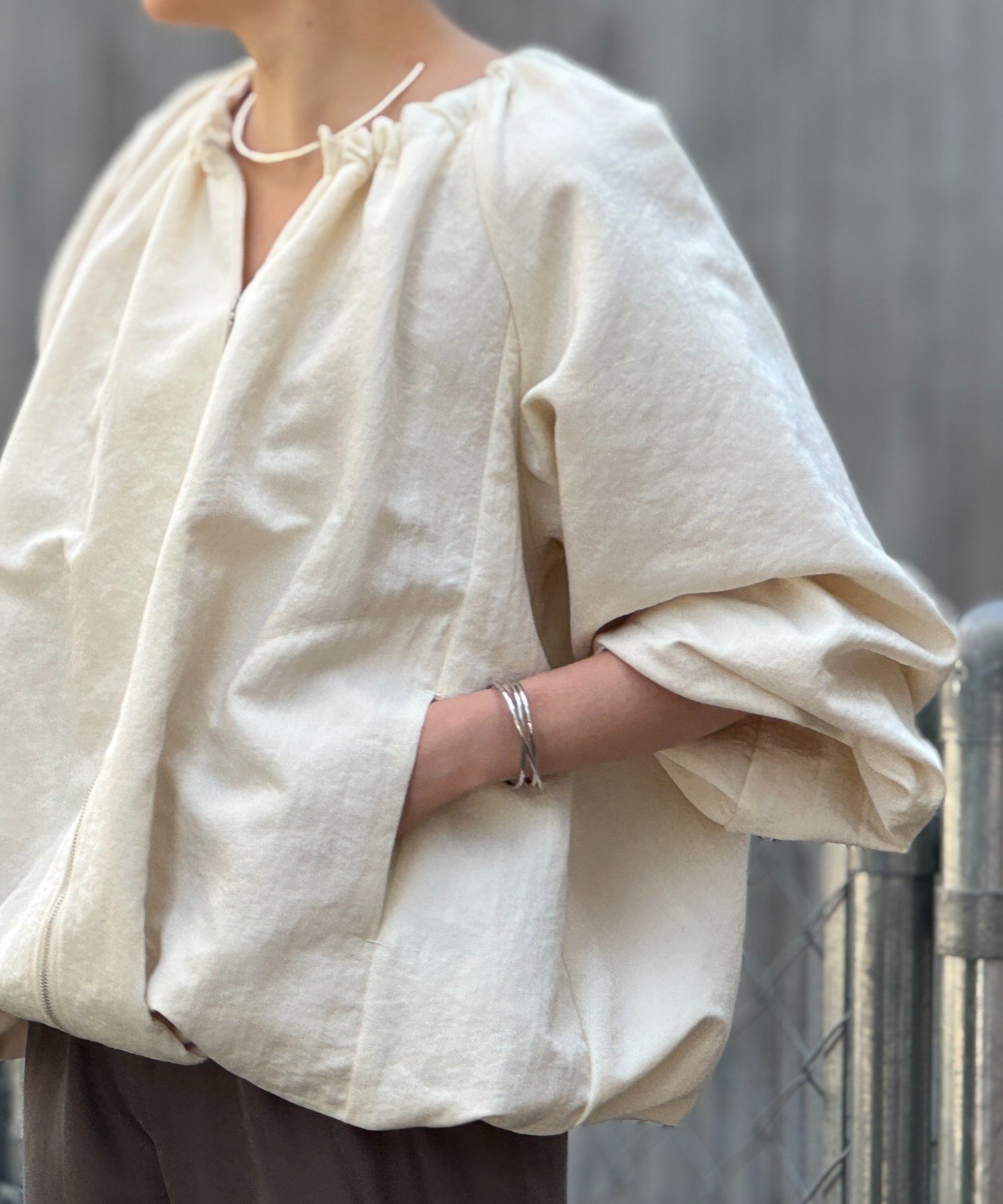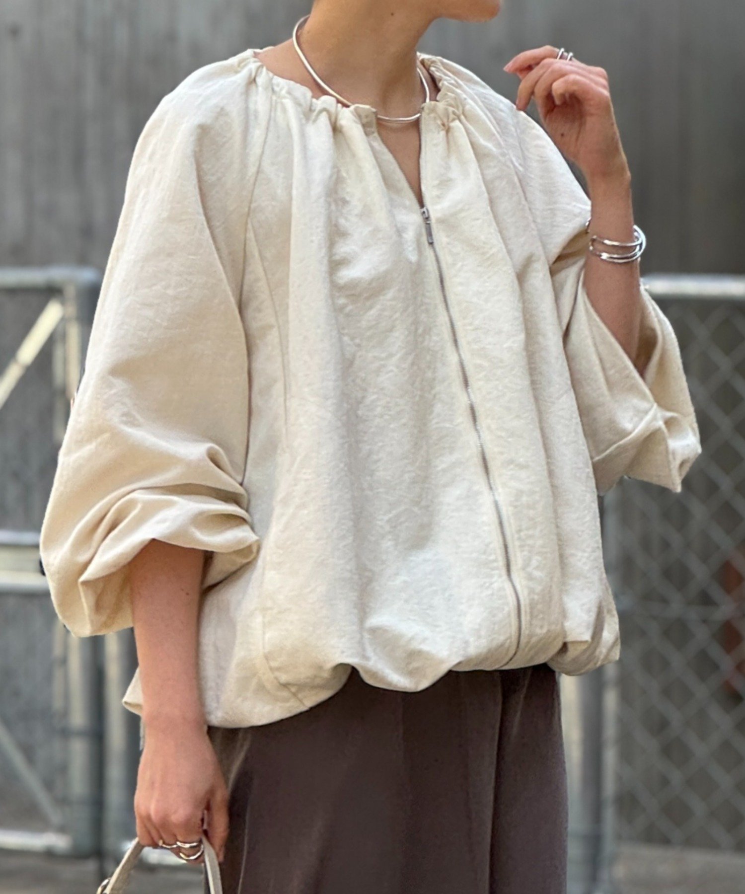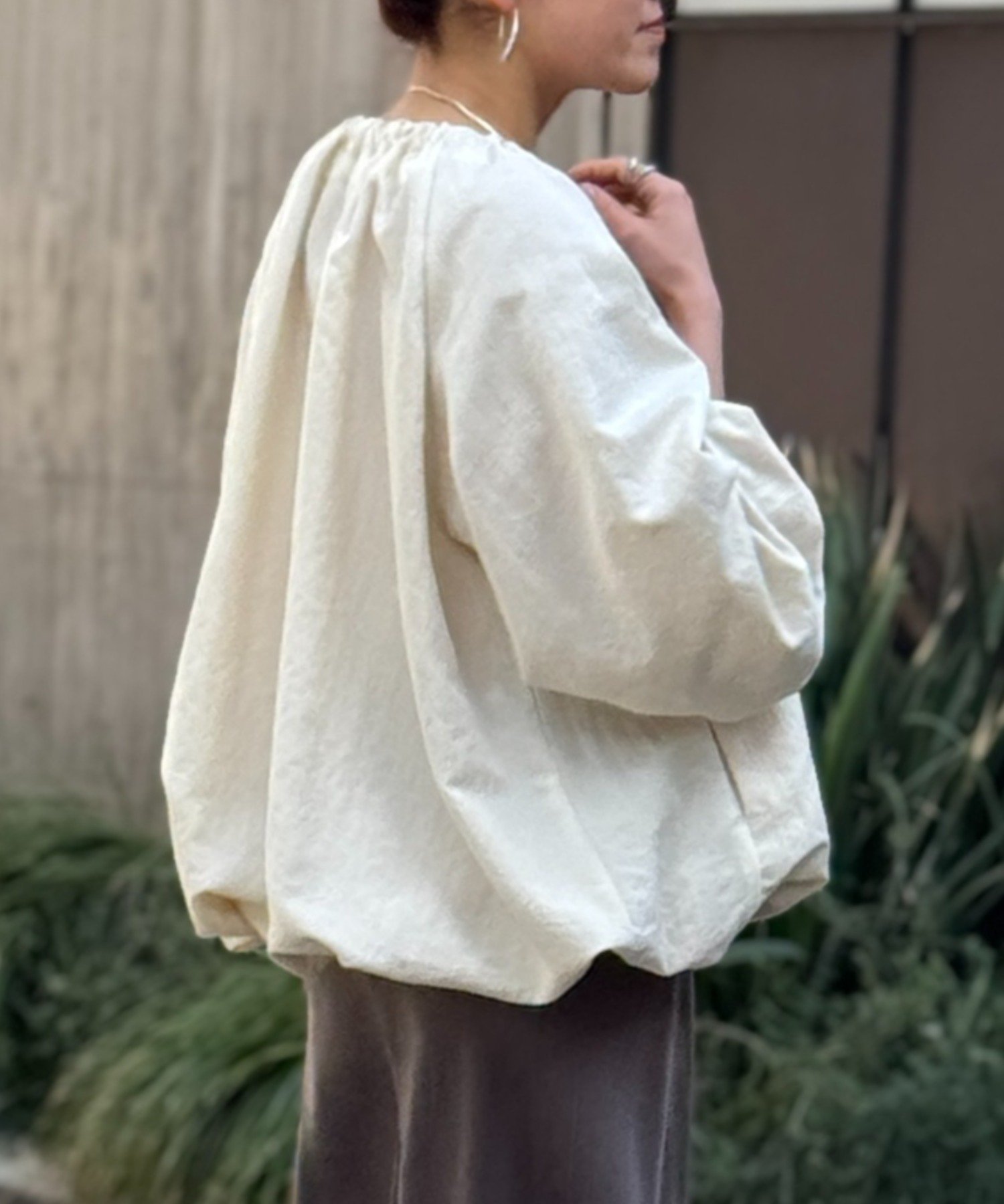 Нейлоновая блузон с обильными сборками на воротнике, рукавах и подоле для создания объемного эффекта.