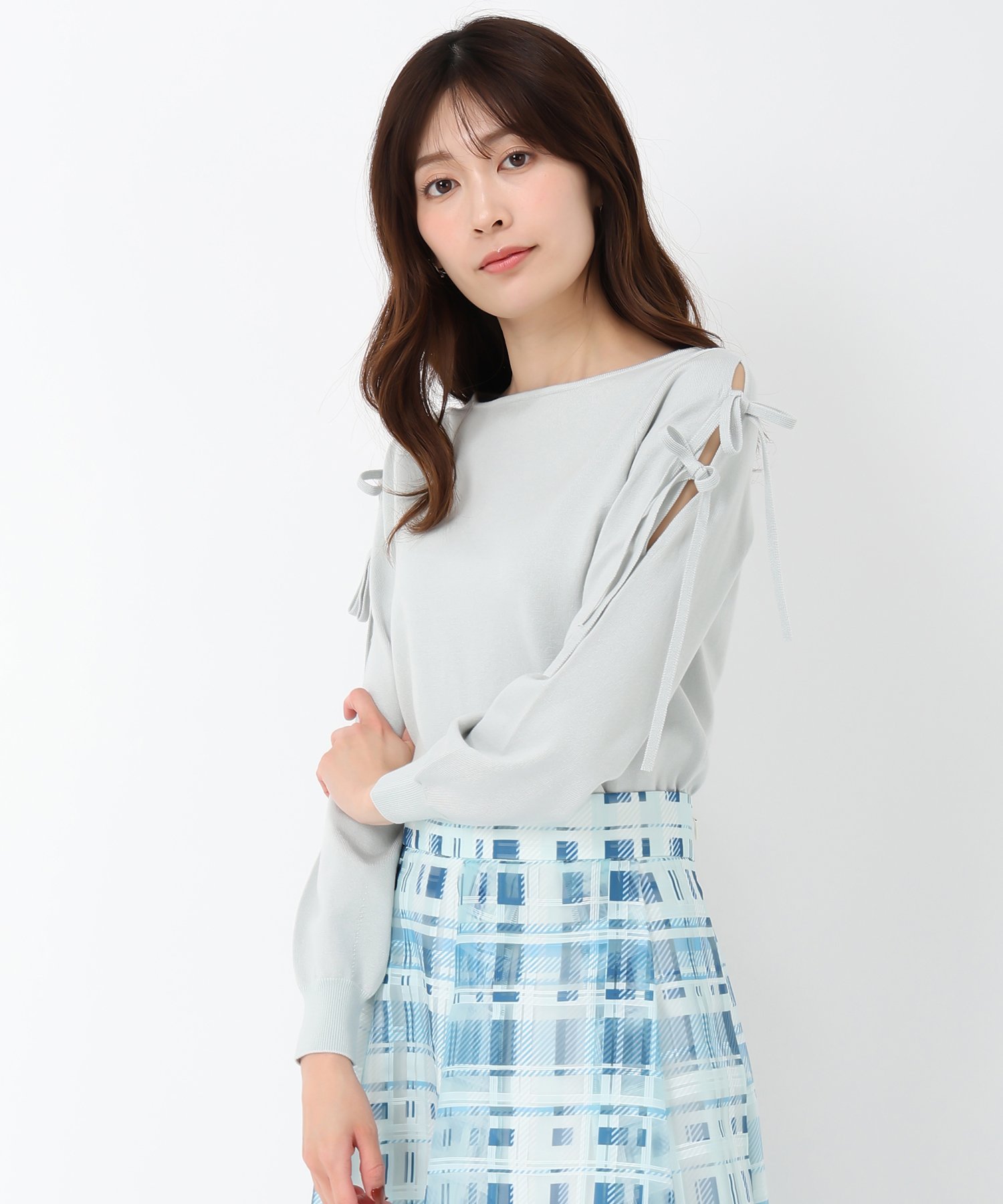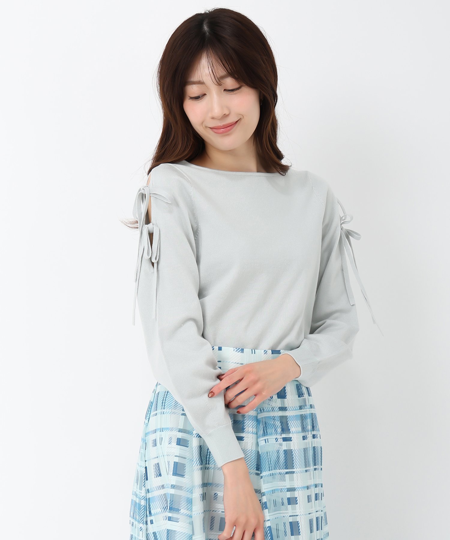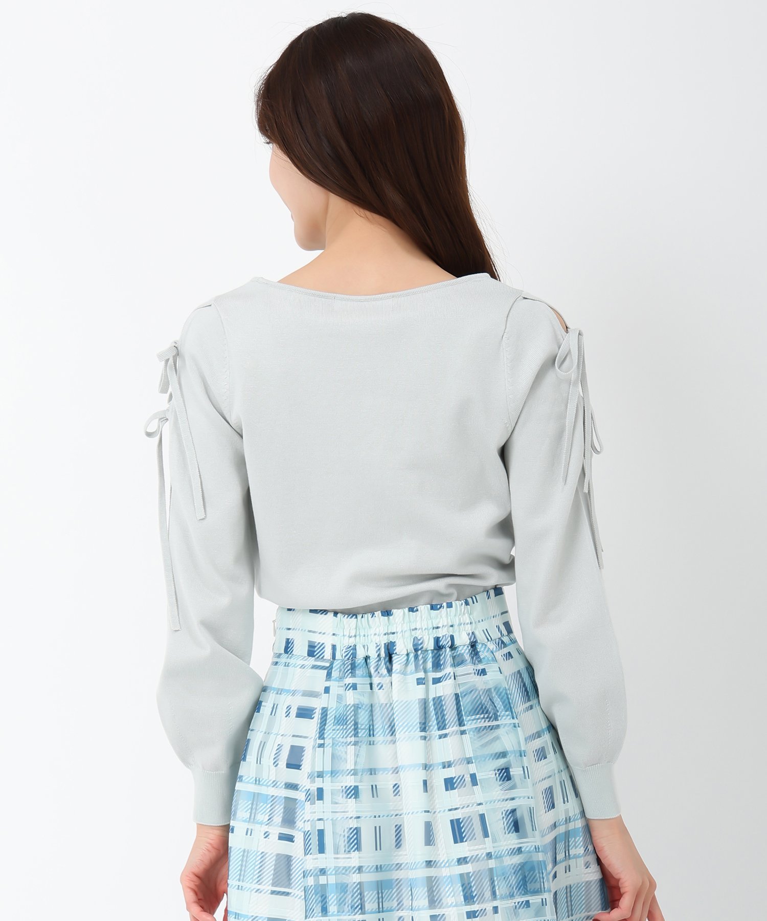 Милый вязаный свитер с открытыми плечами, украшенный лентами.