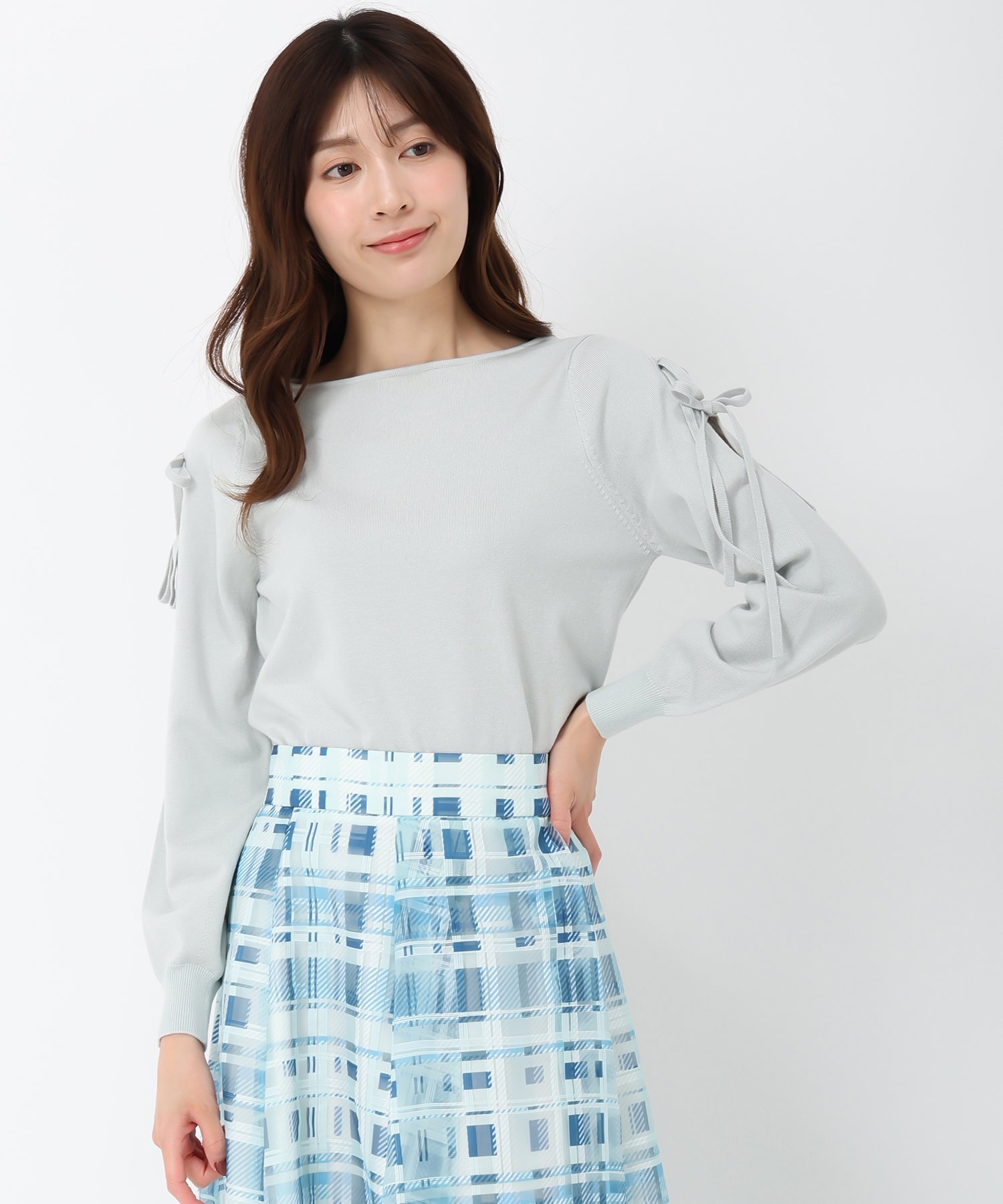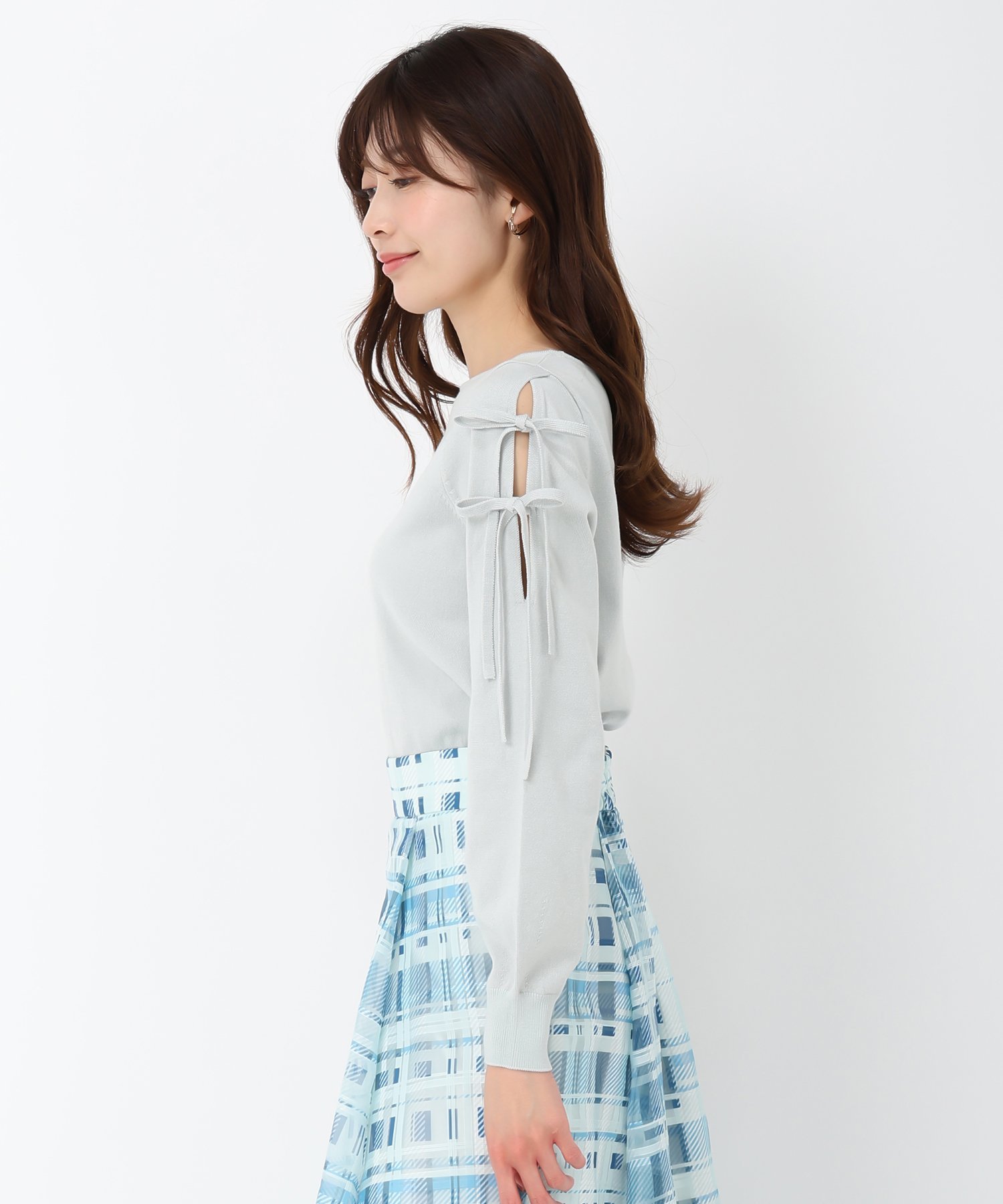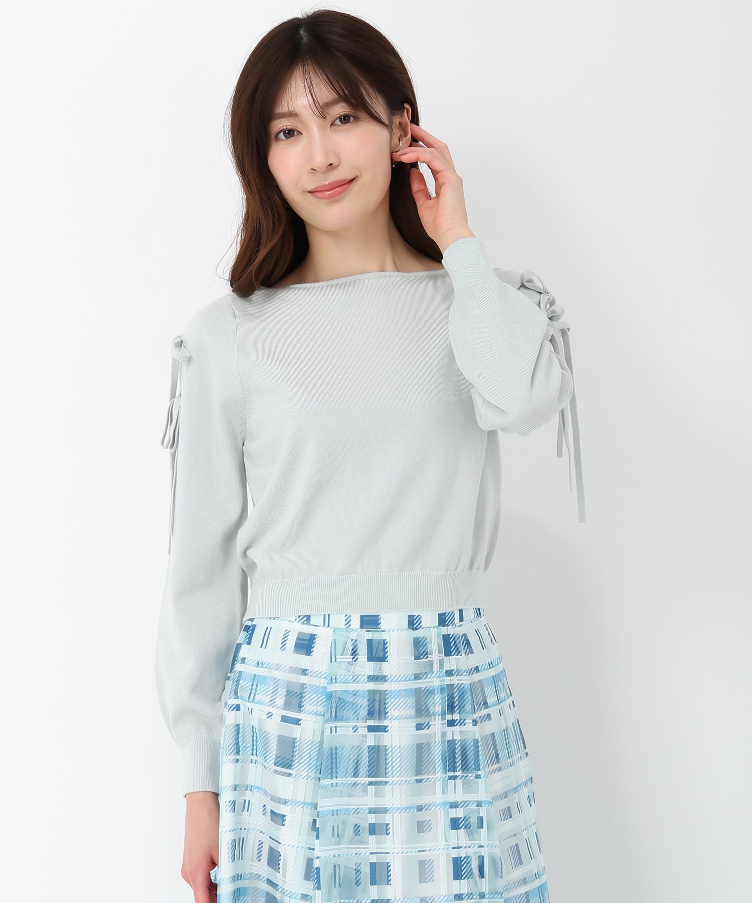 Милый вязаный свитер с открытыми плечами, украшенный лентами.