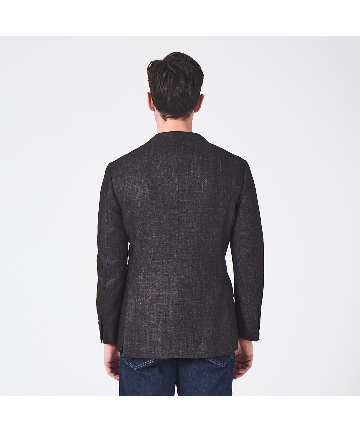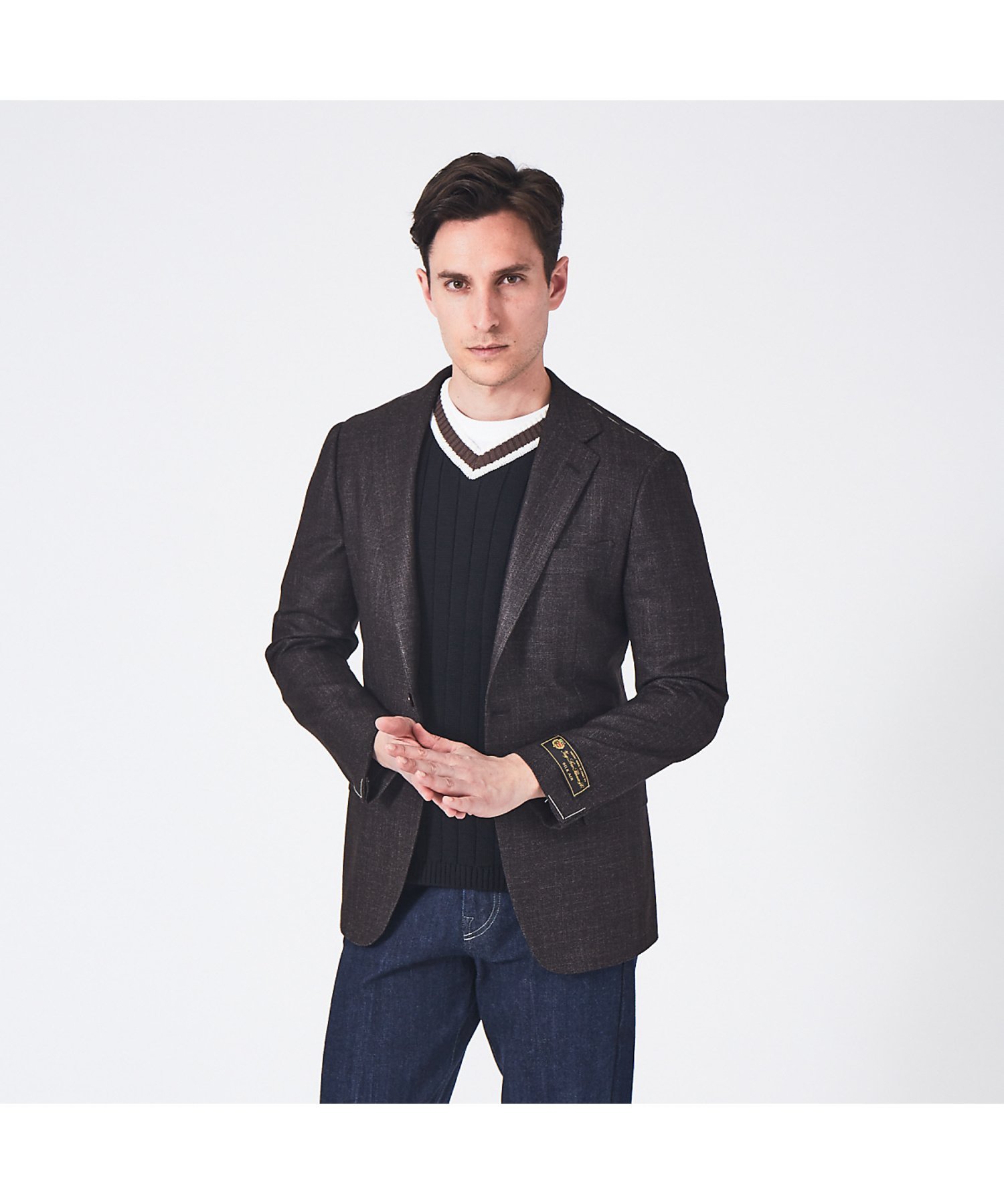 Это полностью сшитая на заказ модель, созданная в сотрудничестве с RINGJACKET, ведущей японской компанией по пошиву одежды. Эта модель, разработанная с нуля, отличается острым лацканом для универсальности, создавая спортивный, но в то же время легкий образ, а отделка краев добавляет изюминку. Пуговицы расположены немного ниже, создавая элегантный глубокий V-образный вырез. Ткань — темно-коричневая шелковая смесь Loro Piana с блестящим сиянием, излучающая чувство достоинства.