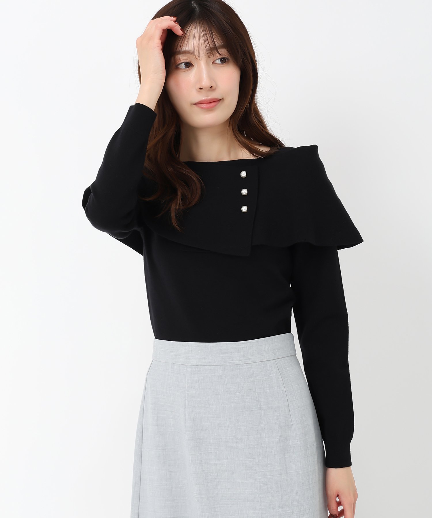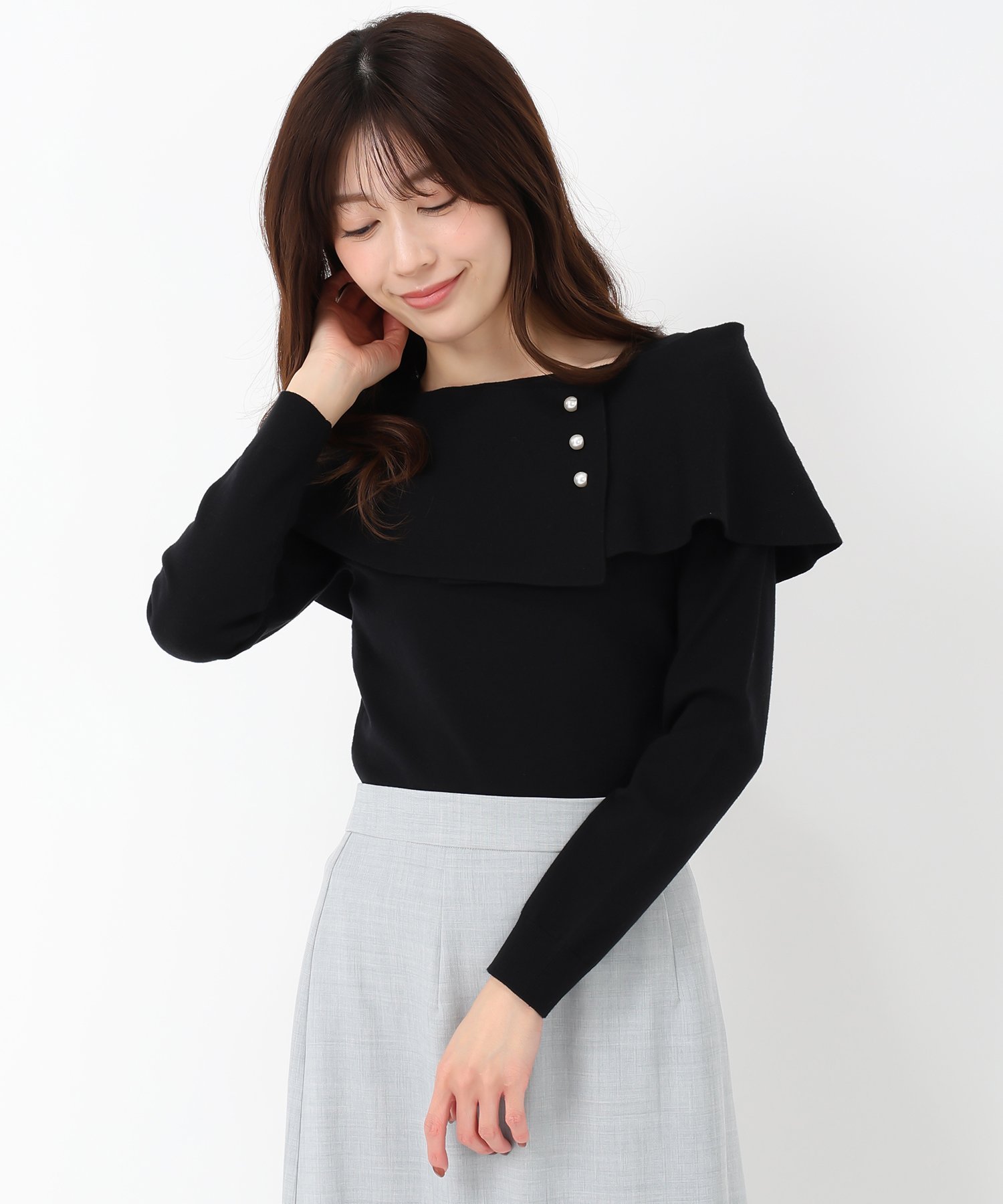 Вязаный свитер с асимметричной накидкой, украшенной жемчужными пуговицами.