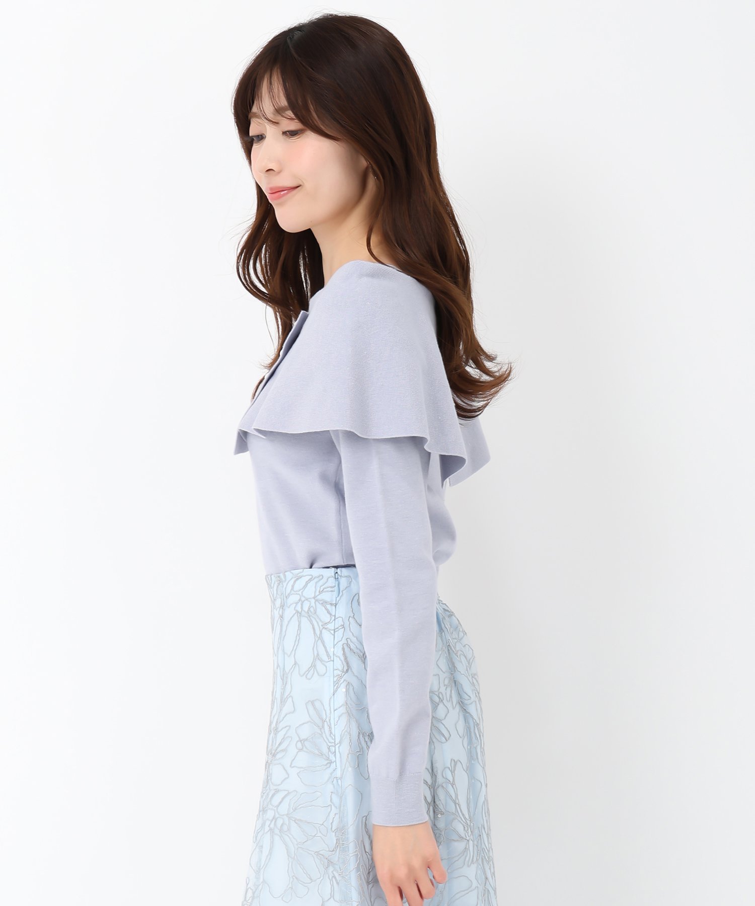 Пышная многослойная накидка закрывает плечи и верхнюю часть рук, создавая женственный образ.