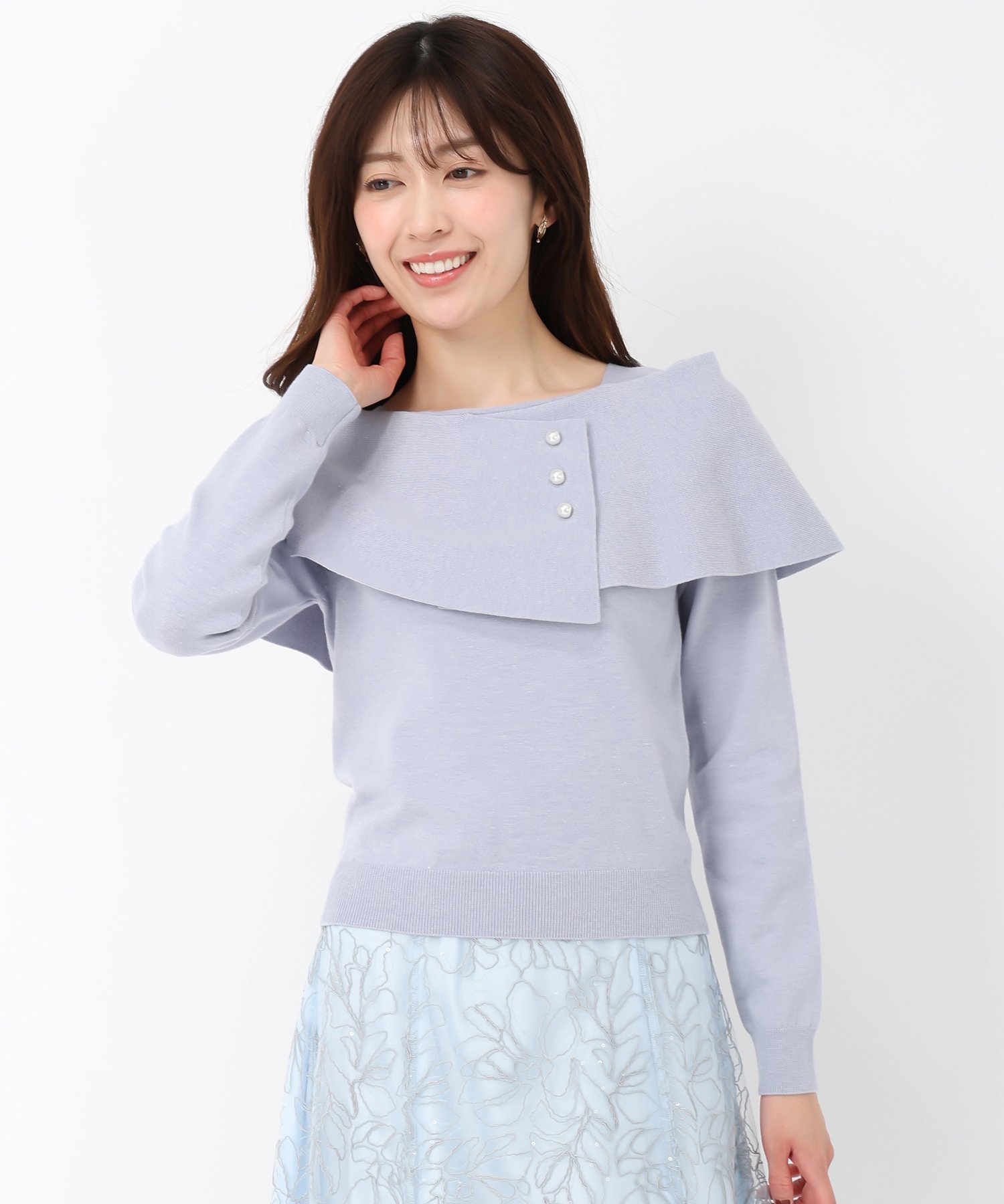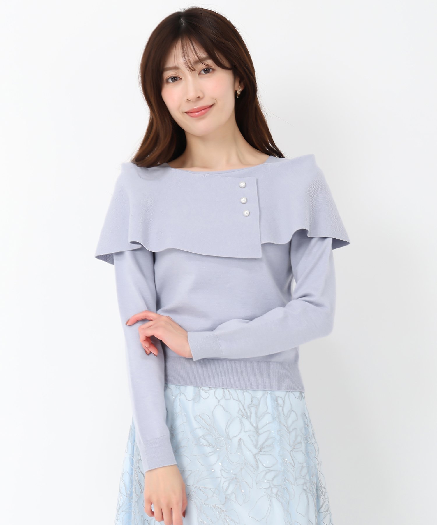 Вязаный свитер с асимметричной накидкой, украшенной жемчужными пуговицами.
