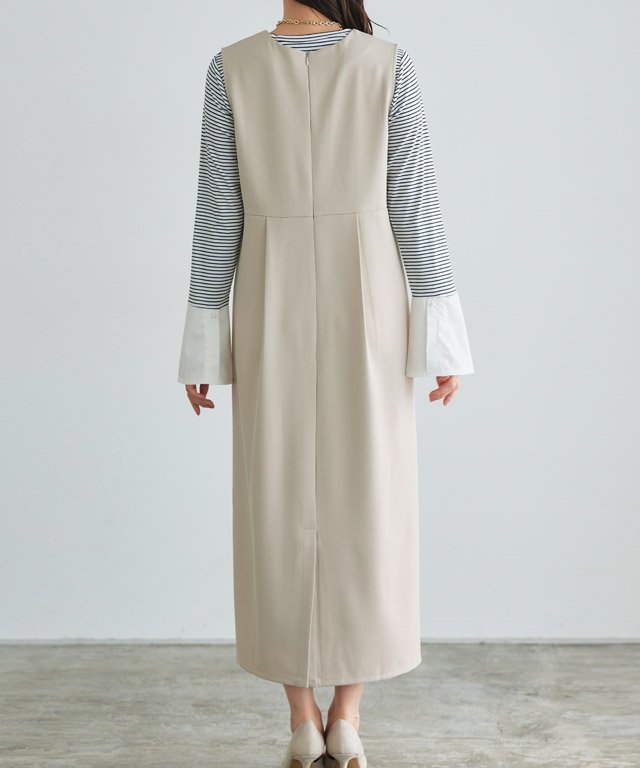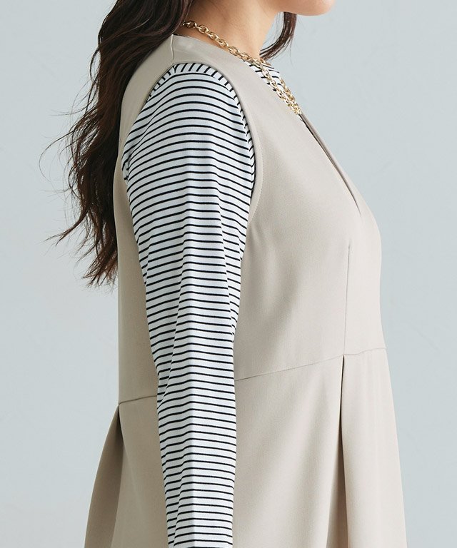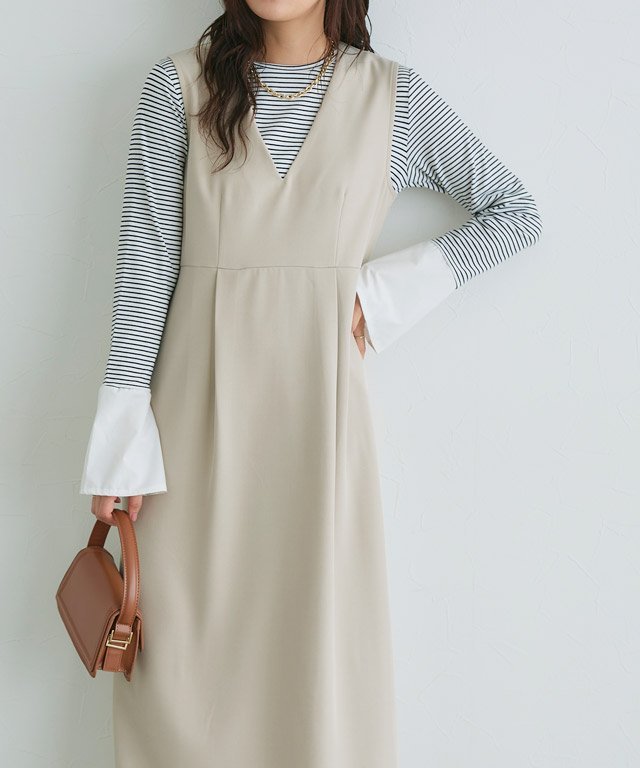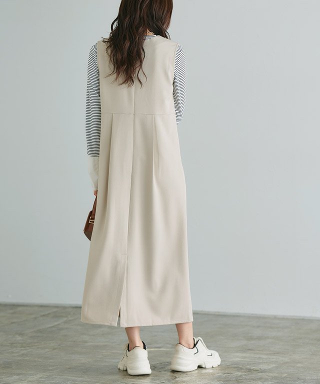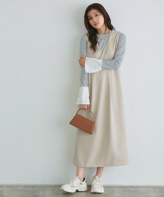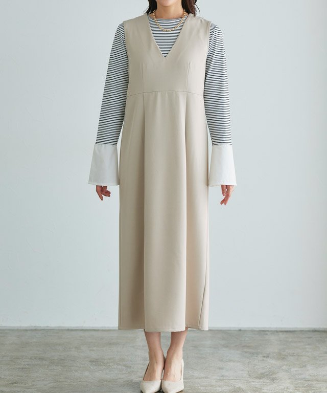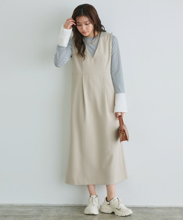 Глубокий вырез создает расслабленный образ, а складки на талии и силуэт I-силуэта придают изделию лаконичный вид, создавая ощущение зрелости. В зависимости от нижнего белья, ее можно носить долго, что делает ее платьем для повседневного использования.