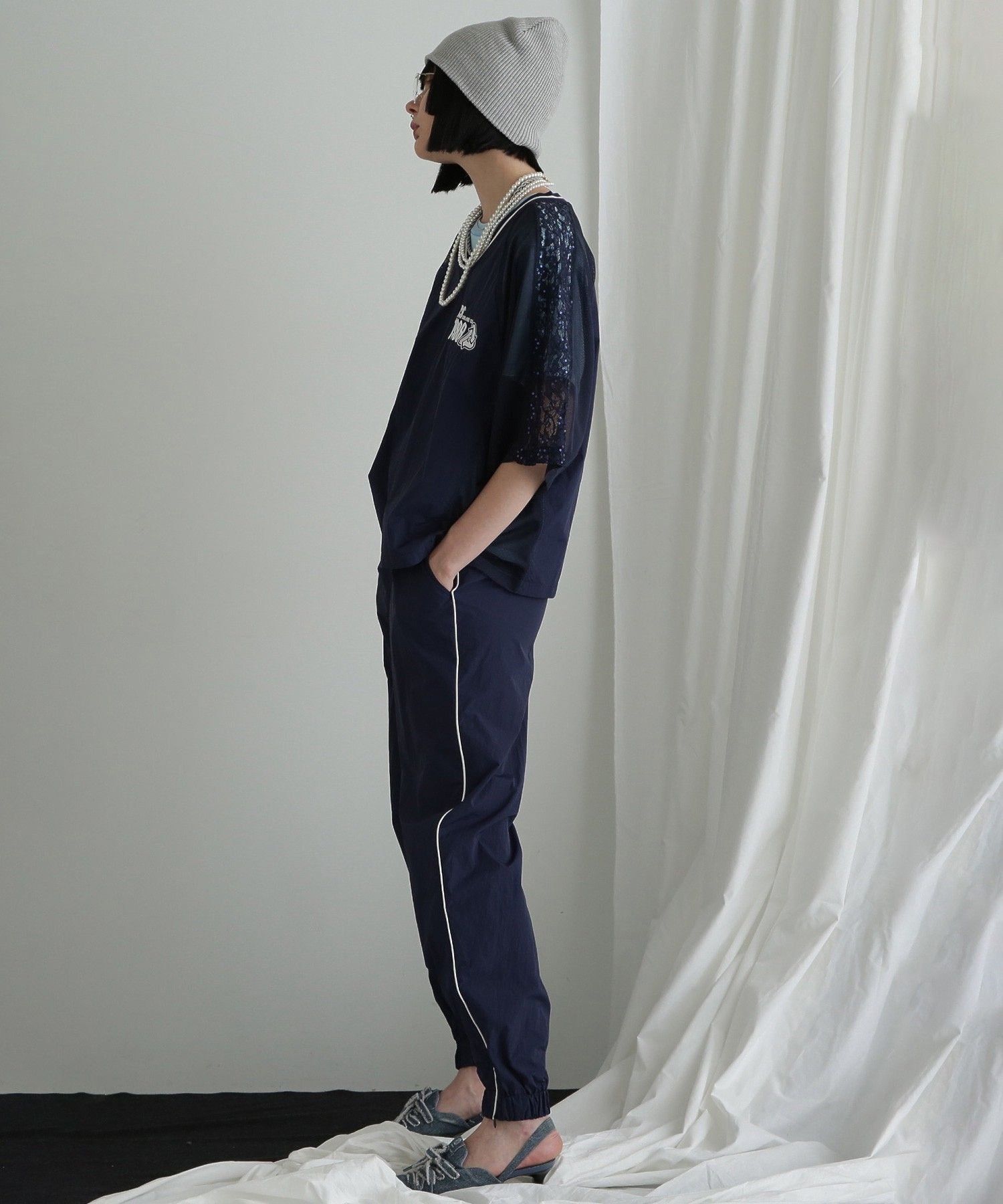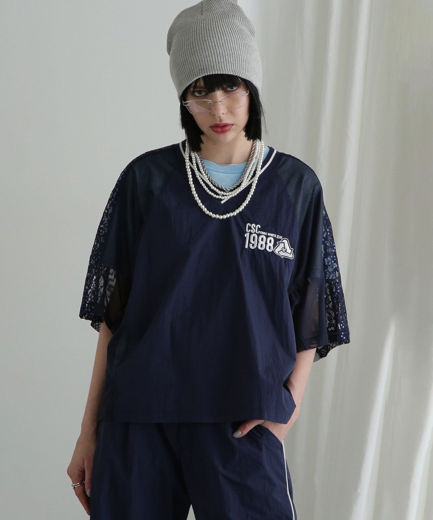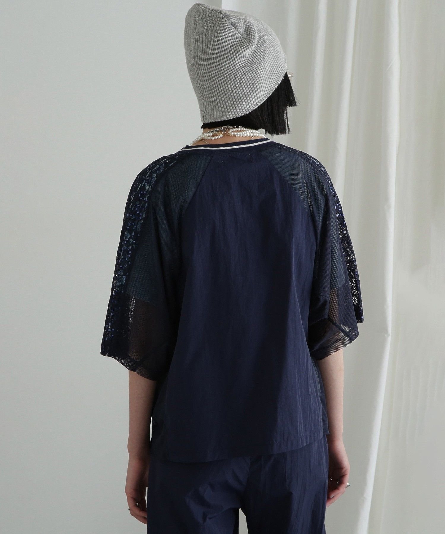 Основная часть выполнена из нейлона, сетка для рукавов и боков, а кружево, вышитое пайетками, — для плеч.