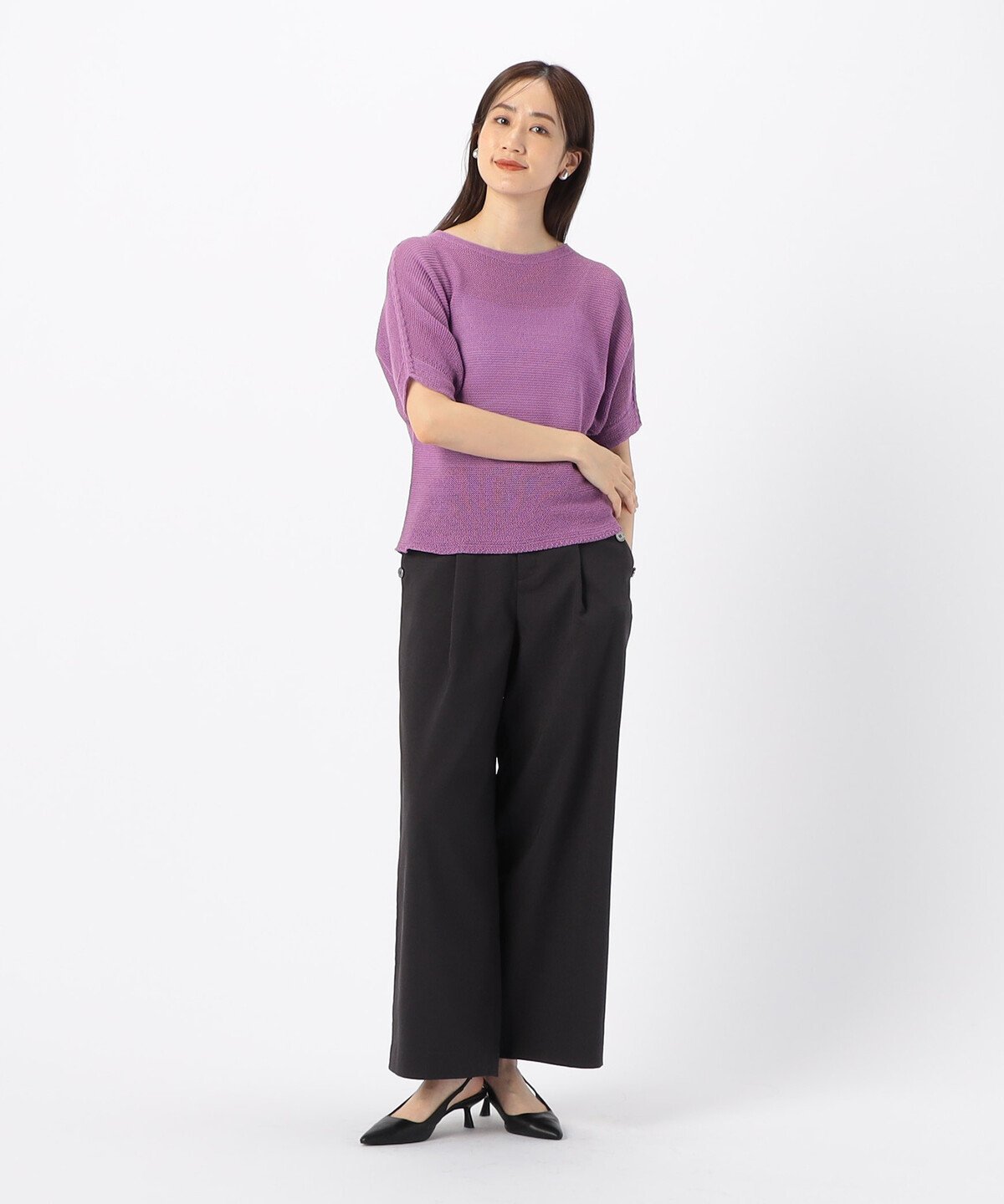 Этот трикотаж с коротким рукавом имеет свободные рукава «летучая мышь», которые обеспечивают защиту плеч, и вырез-лодочку для женственного образа.