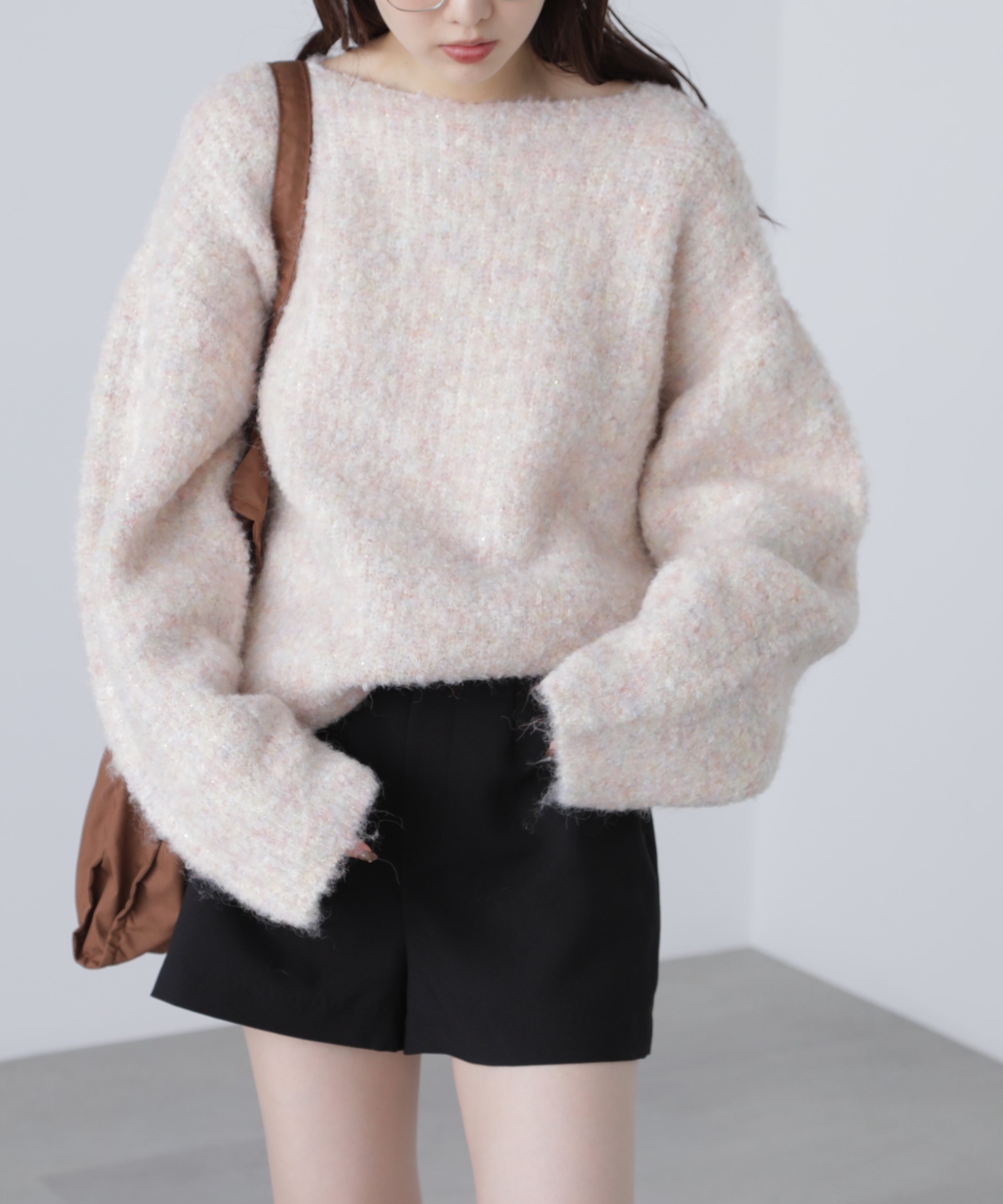 Популярный трикотаж прошлого сезона теперь доступен в новых цветах: сером и синем! Этот трикотаж средней длины в рубчик изготовлен из милой, пушистой меланжевой букле-пряжи с добавлением блестящей пряжи для легкого сияния. Широкий вырез горловины создает аккуратный силуэт вокруг лица. Свободный крой и мягкость приспущенных плеч – ключевые особенности. Его также можно носить с открытыми плечами или как топ на одно плечо для более расслабленного образа. Мы рекомендуем сочетать его с шортами или узкой юбкой.