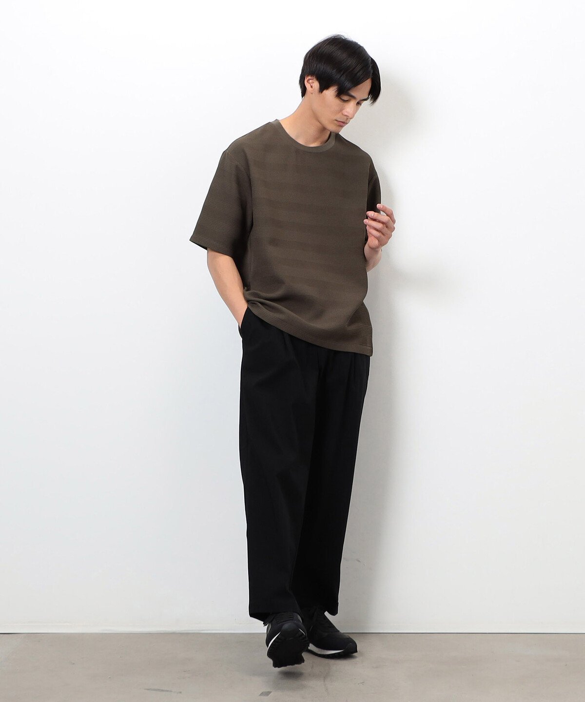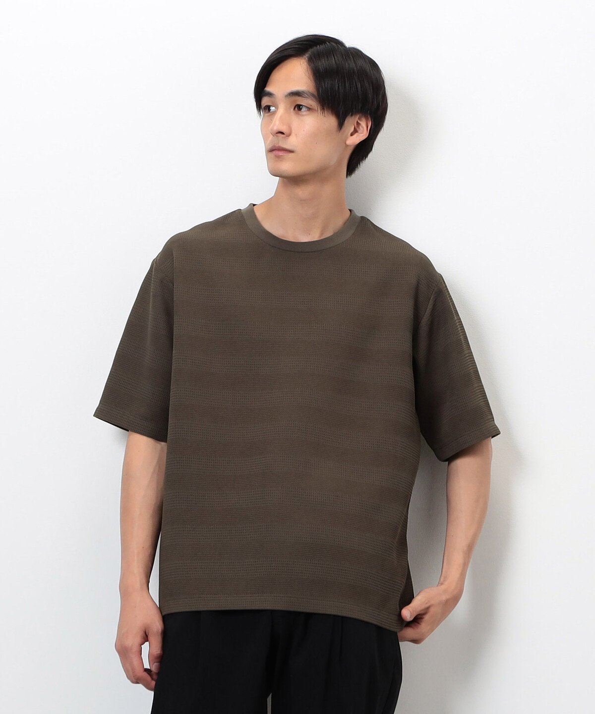 Футболка с круглым вырезом и трехмерной поверхностью в качестве основного элемента дизайна.