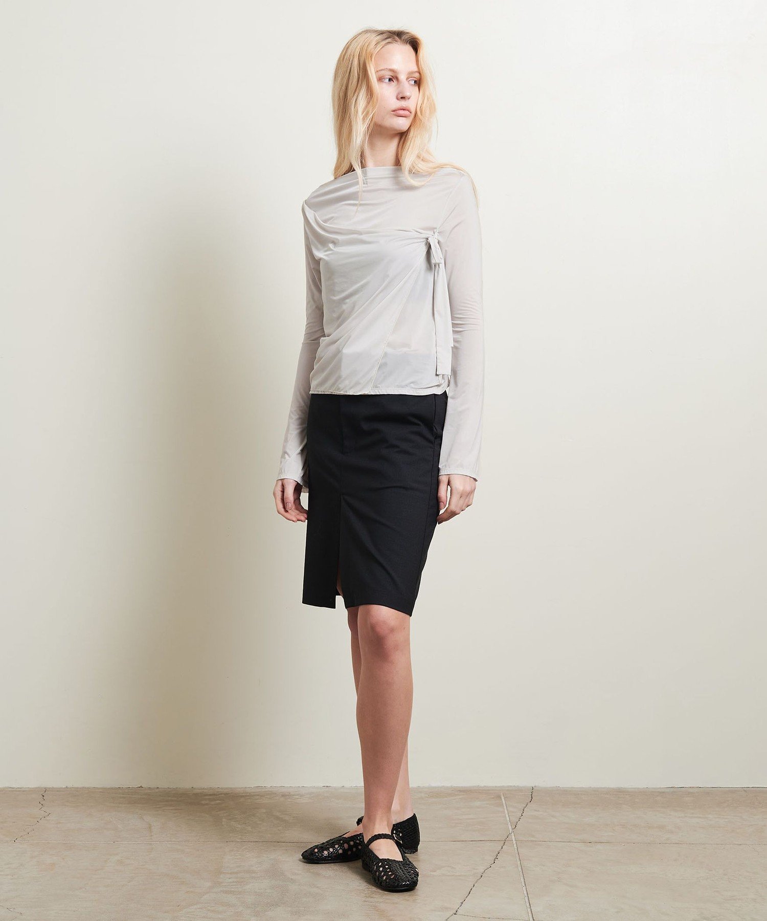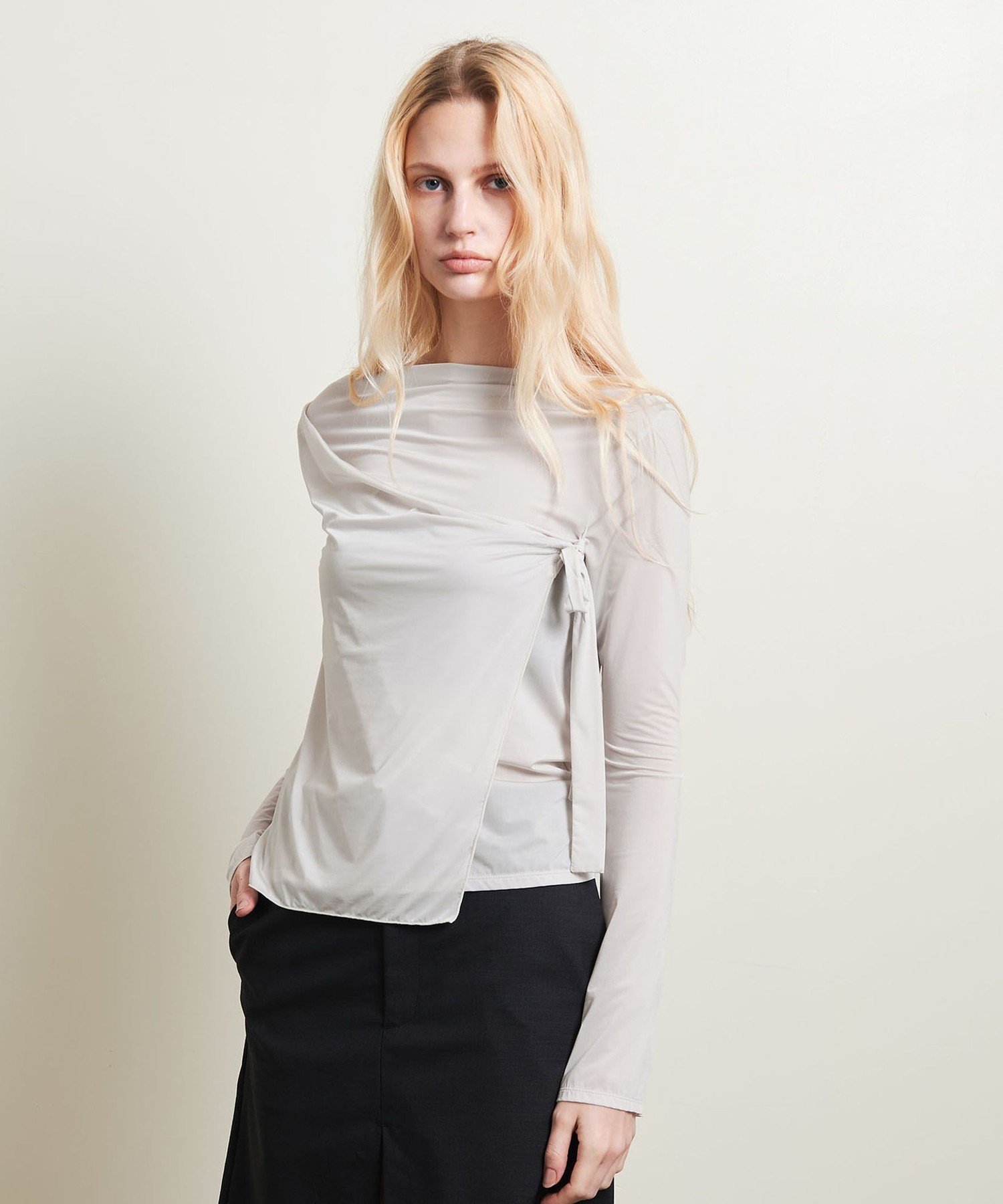 Передняя часть состоит из двух слоев, что создает многослойный образ, скрывающий линию тела и обеспечивающий свободную посадку.
