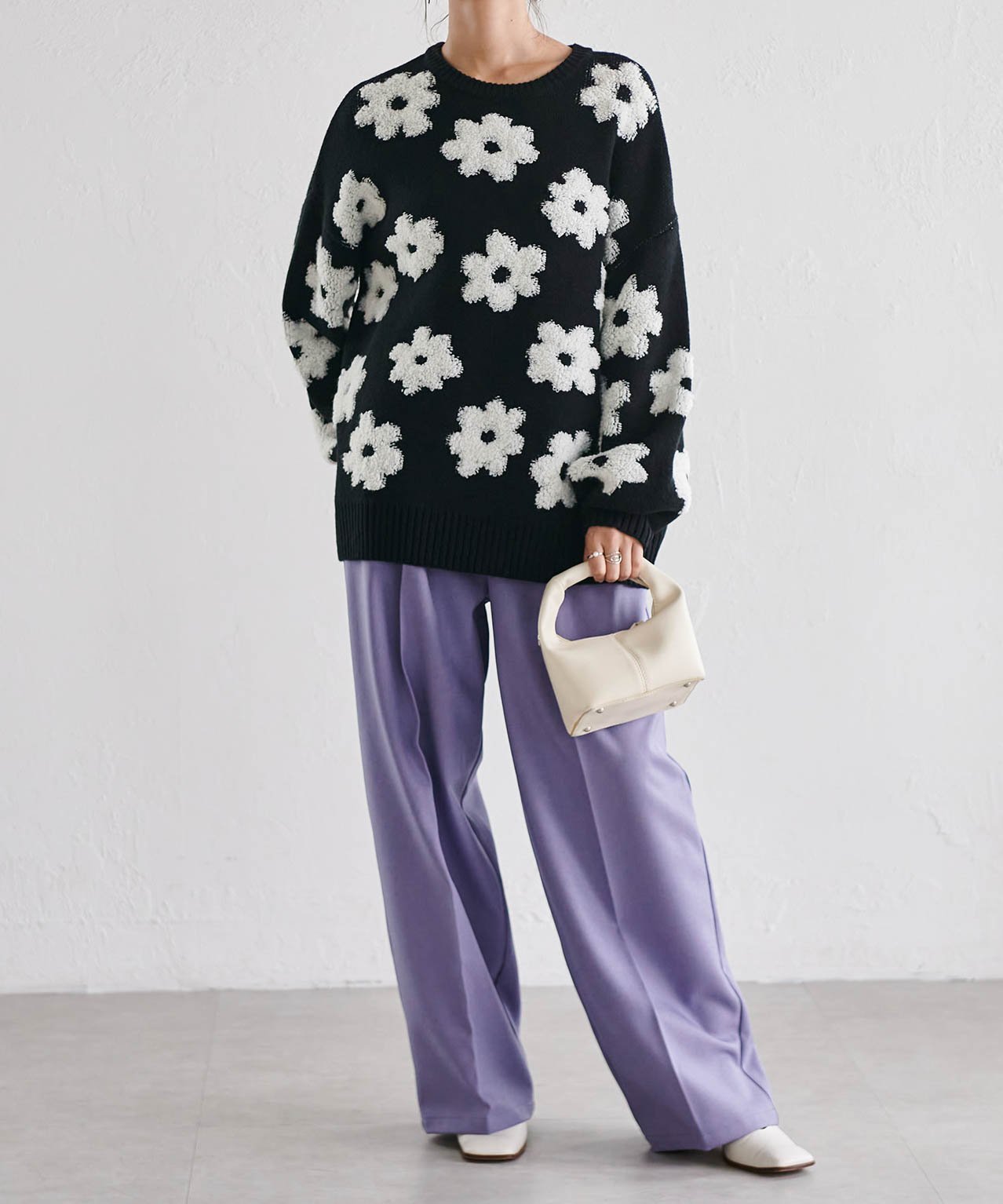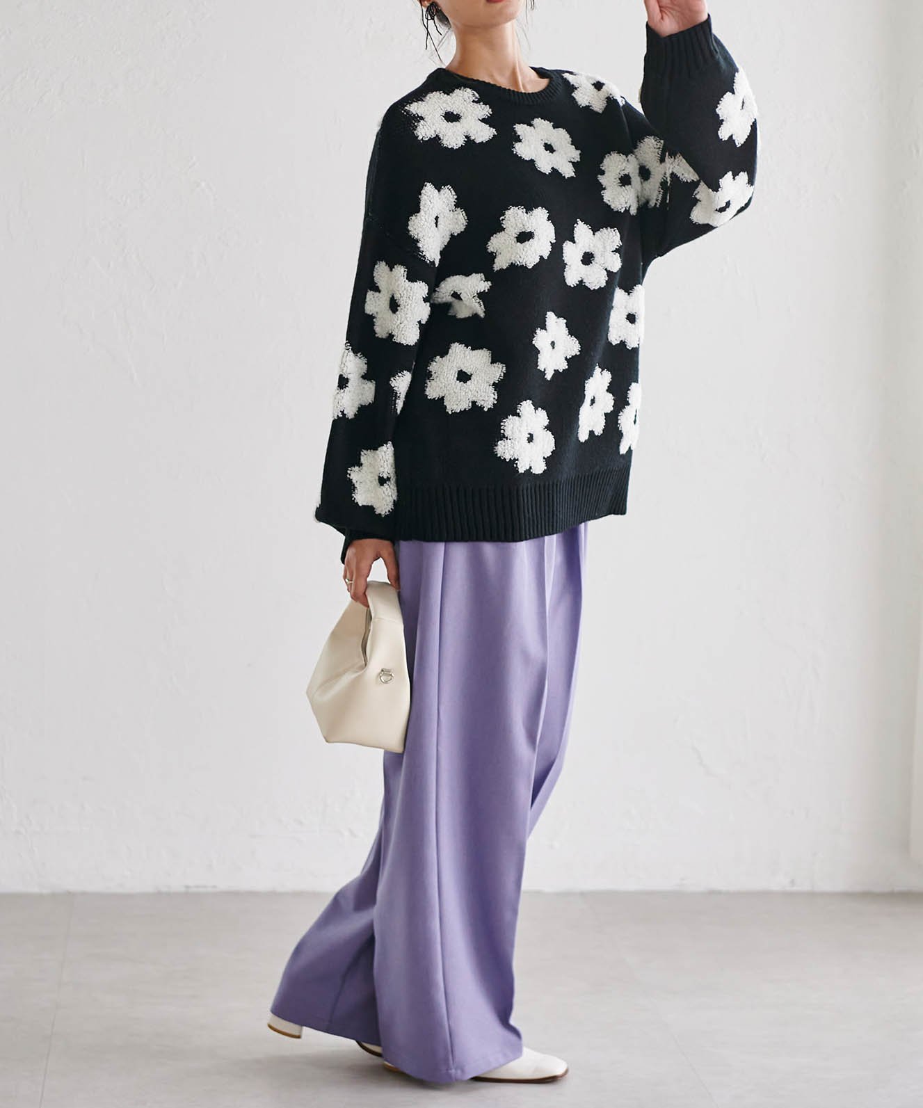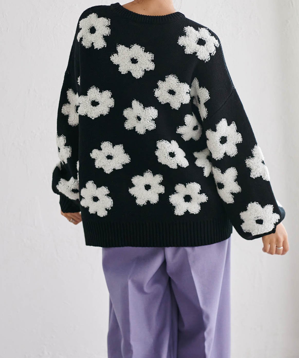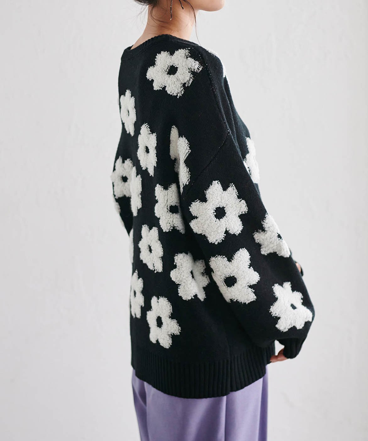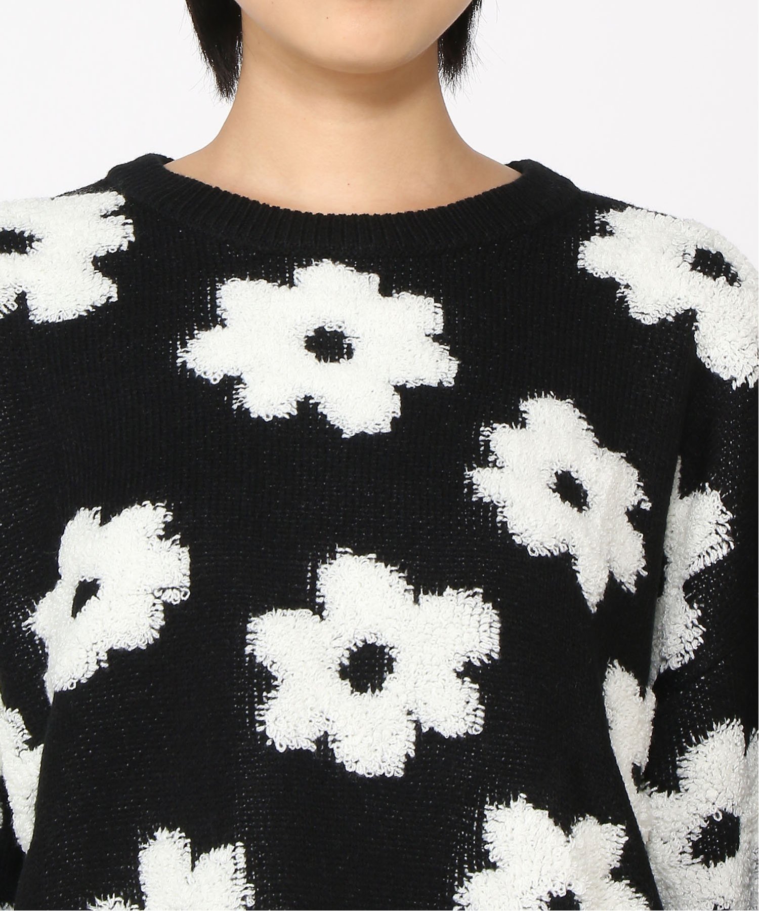 Трехмерный жаккардовый цветочный мотив подчеркивает женственность.