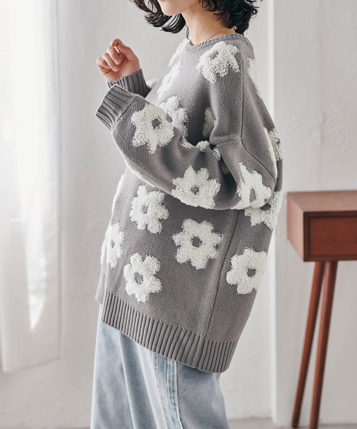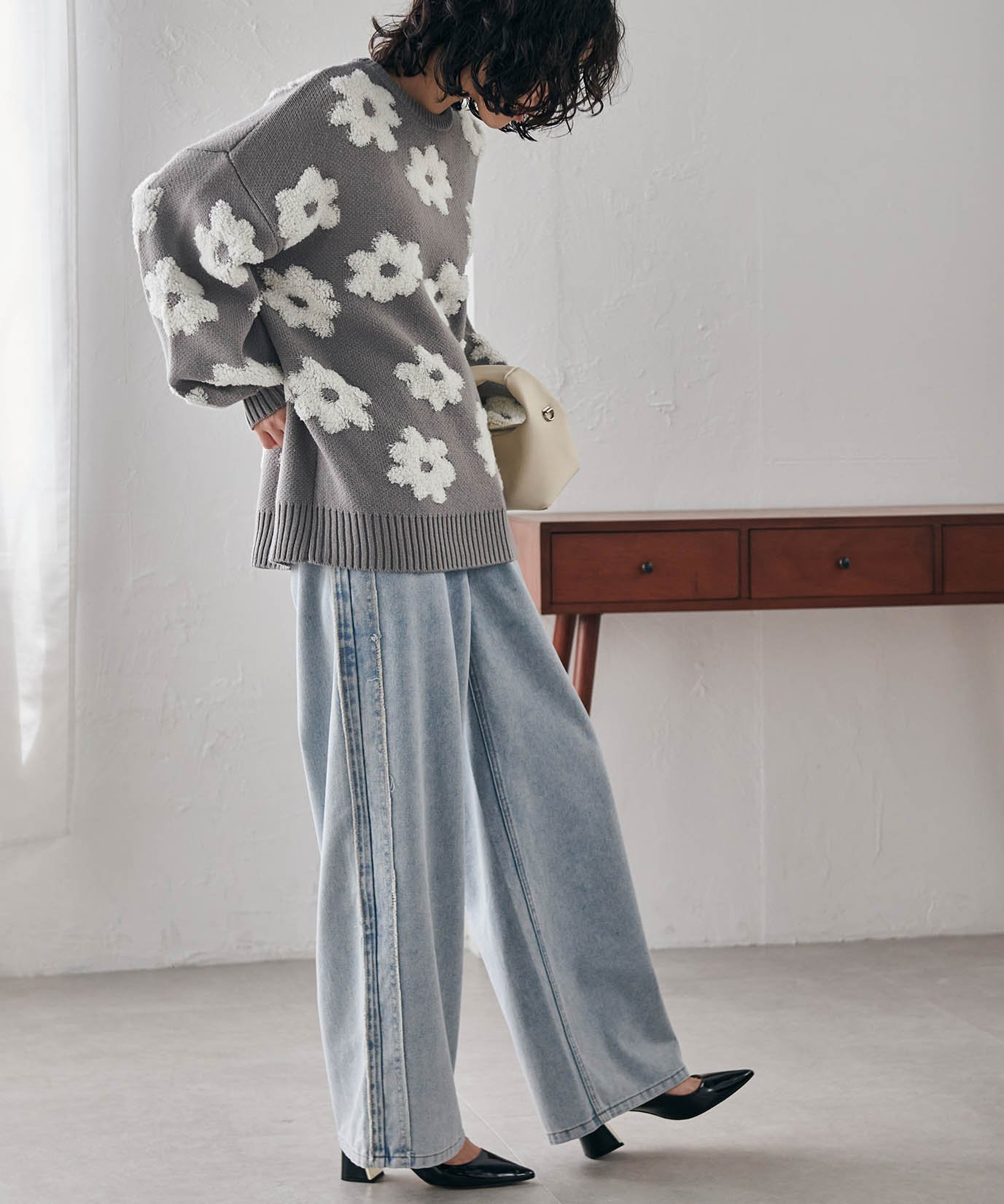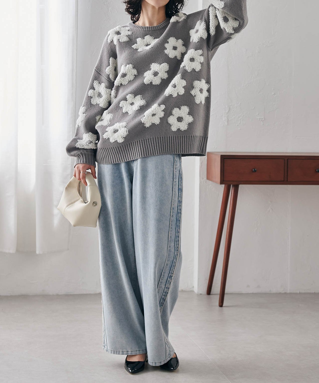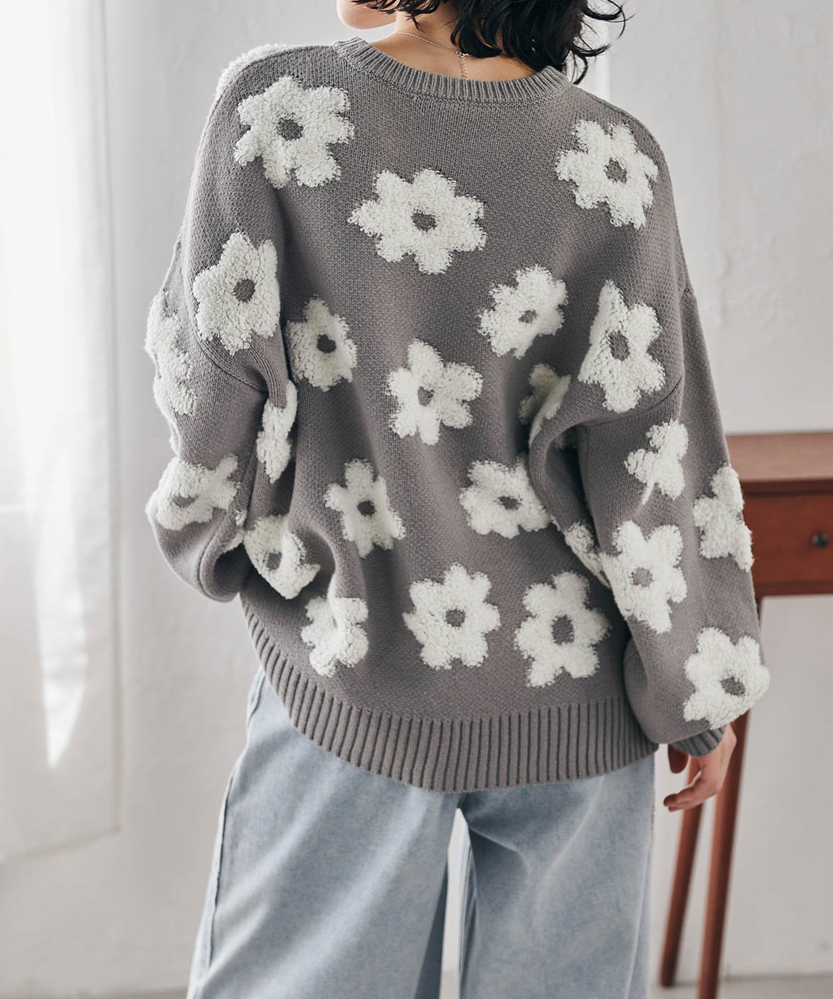 Трехмерный жаккардовый цветочный мотив подчеркивает женственность.