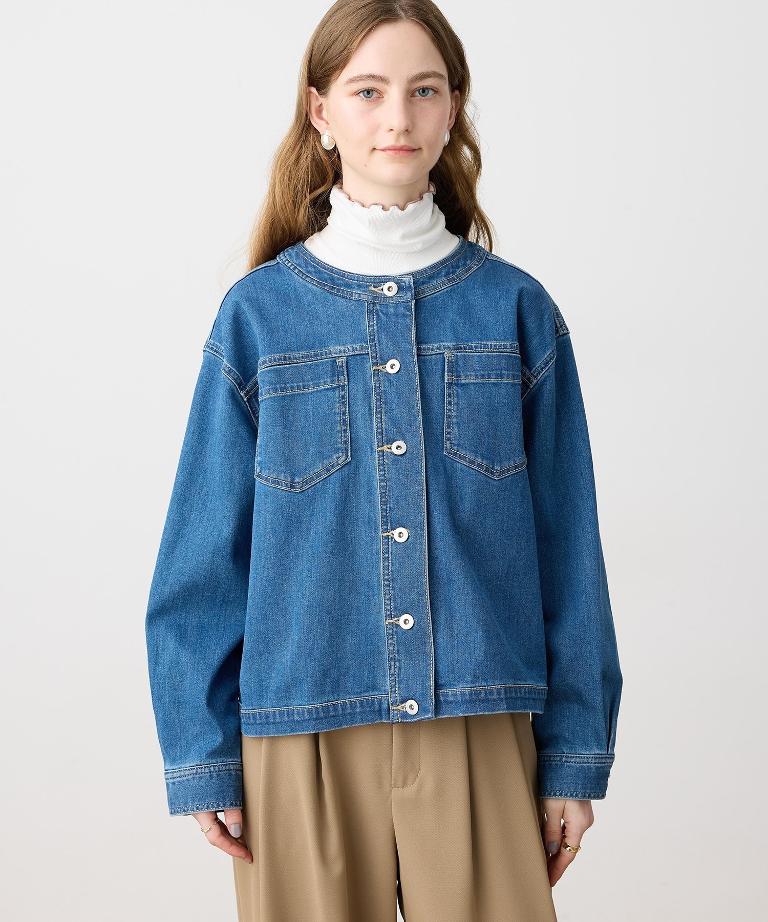 Джинсовая куртка со слегка свободным силуэтом и без воротника, что добавляет ей непринужденности.