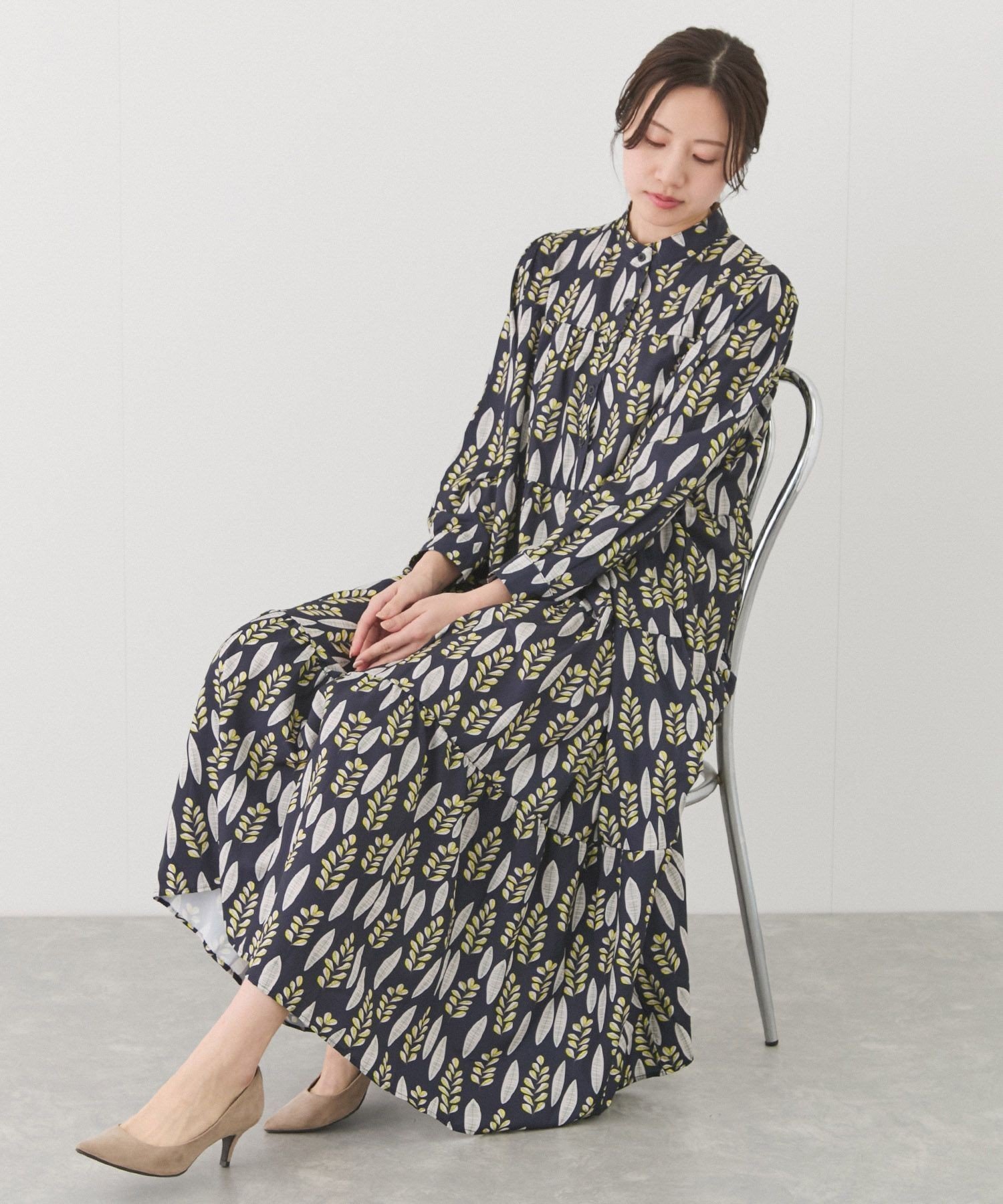 Платье с принтом в виде листьев, создающее освежающее впечатление.