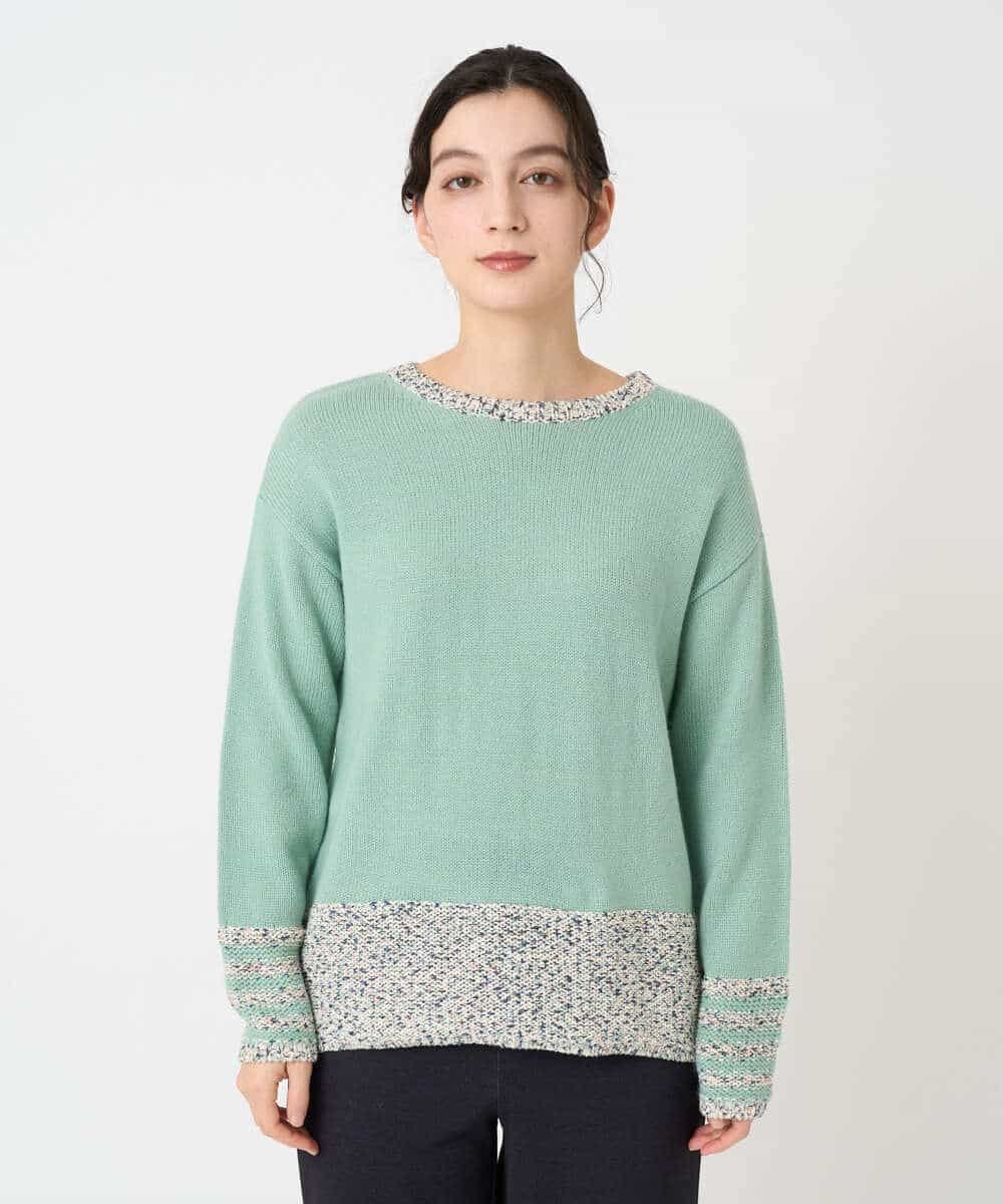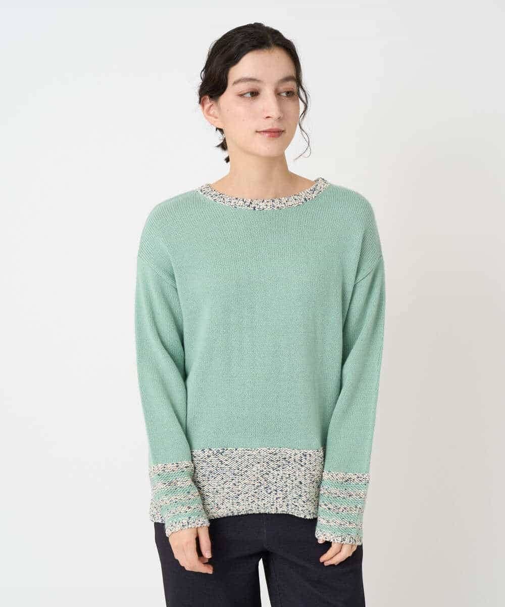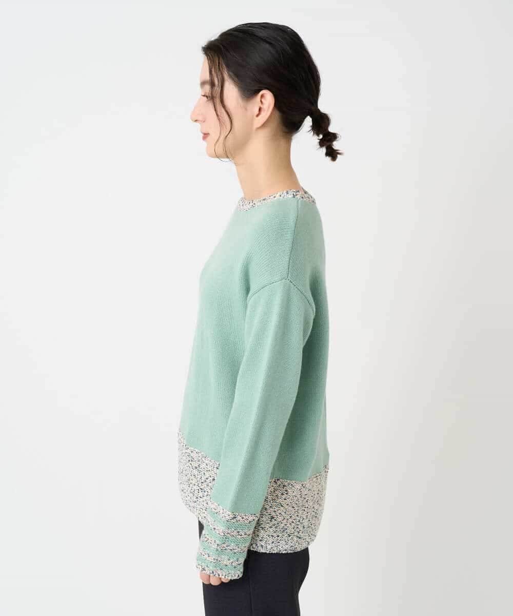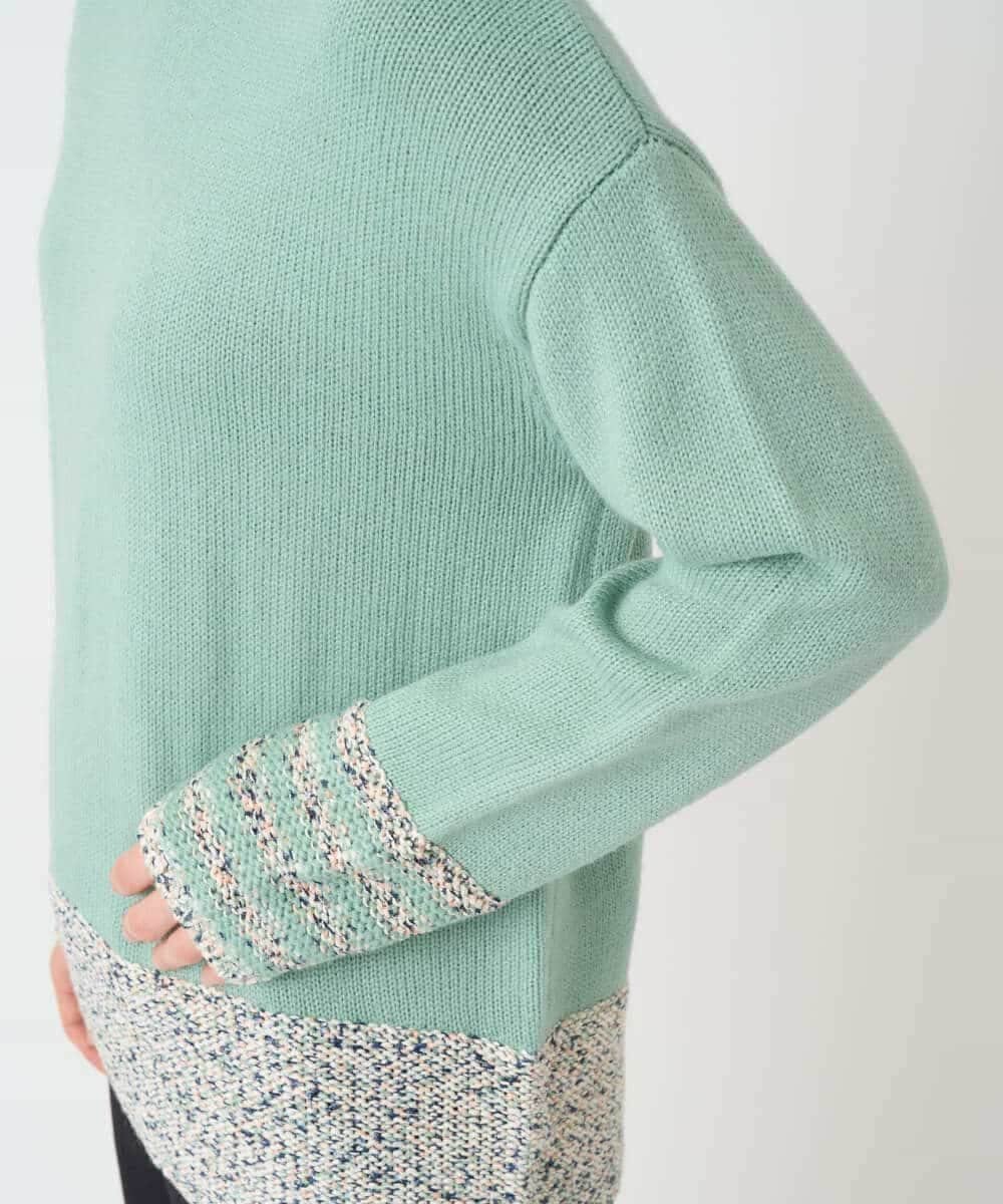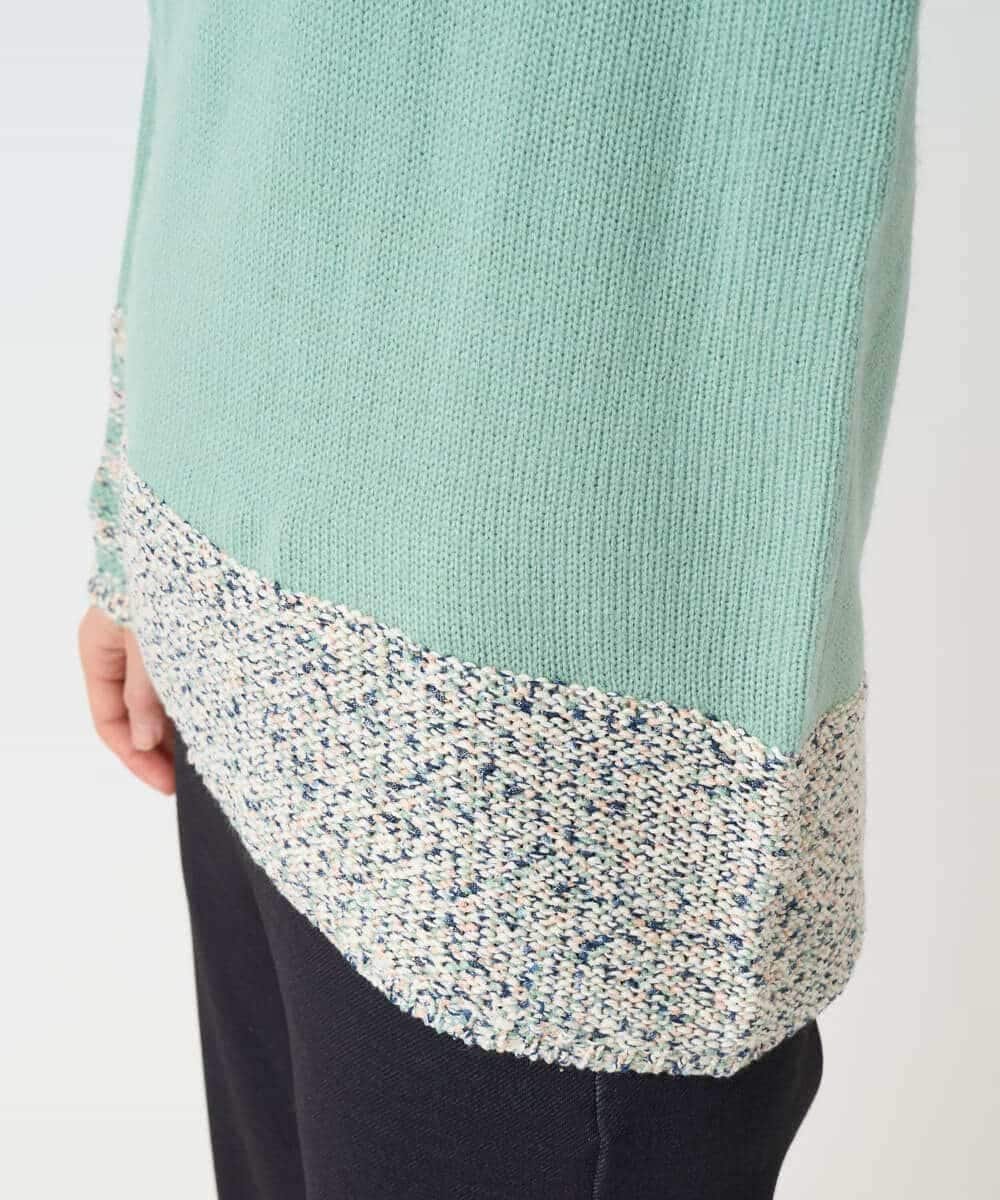 Ключевая особенность — использование пряжи Lilyan в стиле касури. Воротник и нижний край намеренно связаны свободной, низкой плотностью, изнаночной стороной наружу. Рукава украшены четырьмя полосами для разнообразия. Основная часть выполнена из плотной толстой пряжи для создания свободного силуэта, а задний воротник имеет нежную цветовую гамму, связанную с изнаночной стороны.