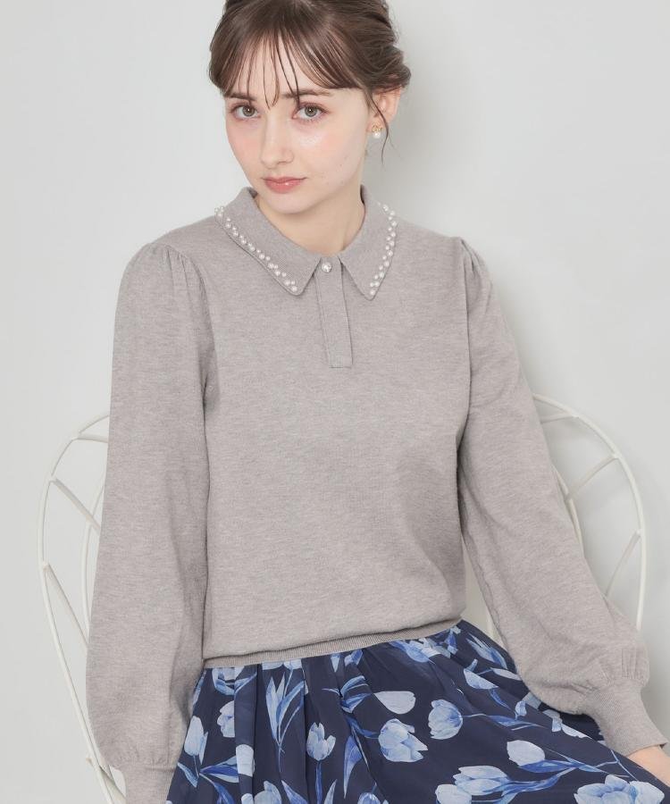 Воротник украшен искусственными жемчужинами, а пуговицы — сверкающими драгоценными камнями, что делает этот вязаный пуловер великолепным и сам по себе.