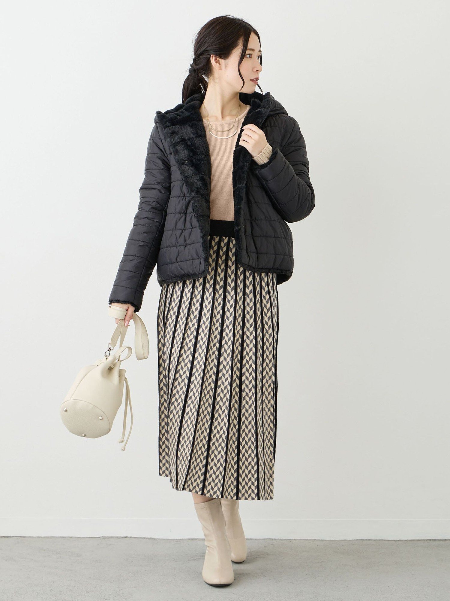 Верхний слой + сшитая из кроя длинная футболка – отличный вариант для повседневной носки. ◎ Для создания женственного образа рекомендуем сочетать с платьем.