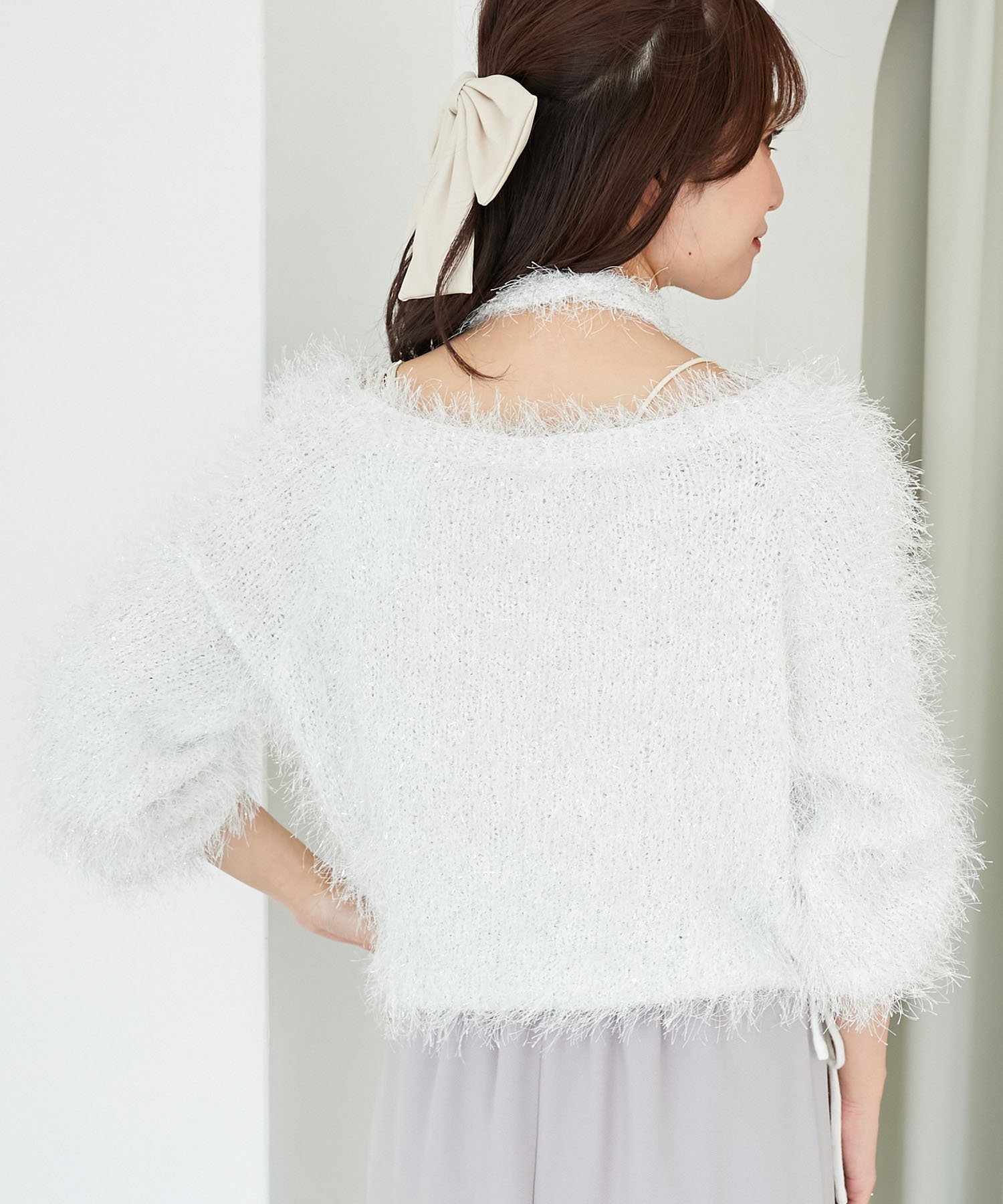 Великолепный трикотаж, выполненный из длинной, пушистой пряжи с блестками, которая мягко переливается в зависимости от угла освещения.