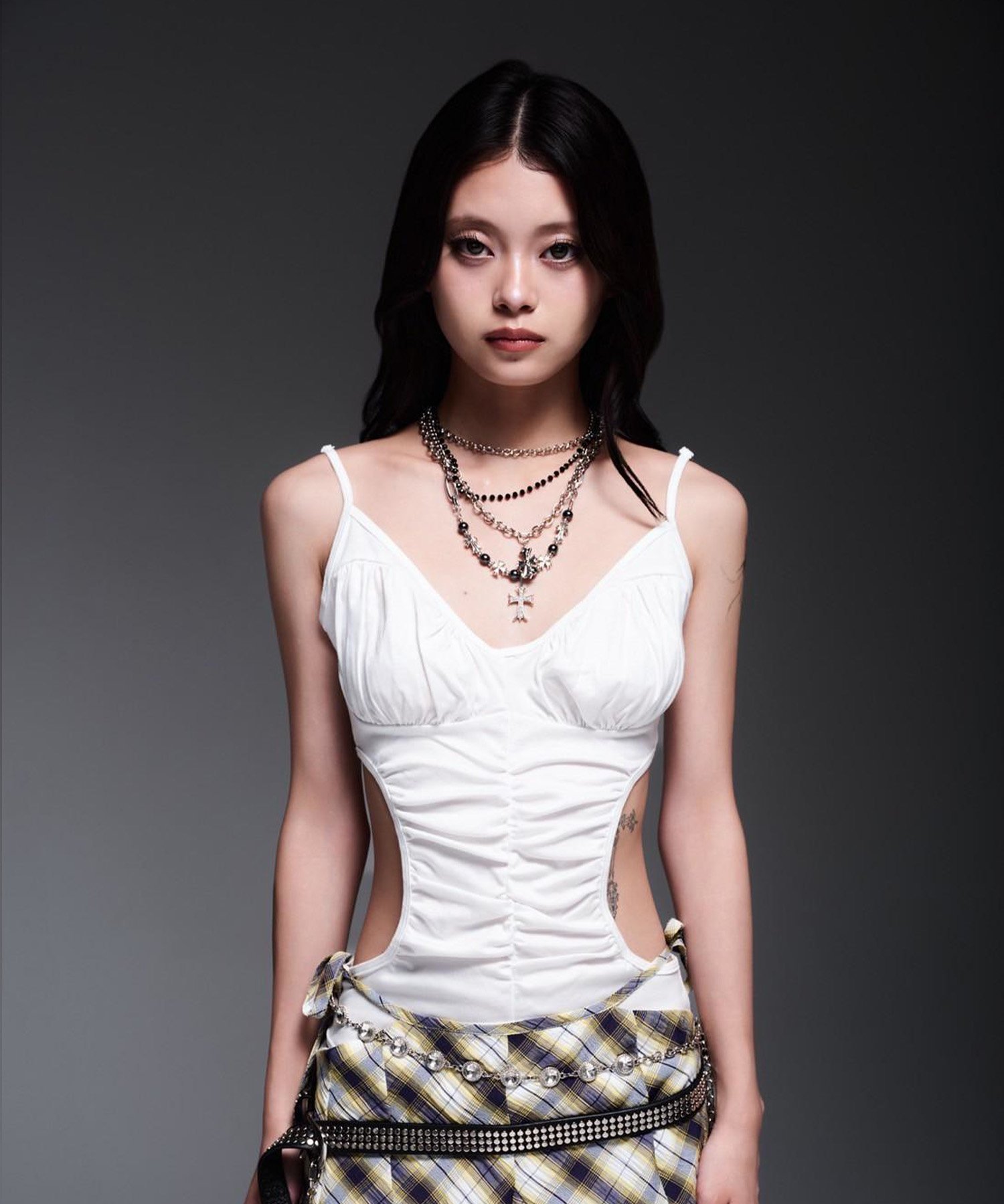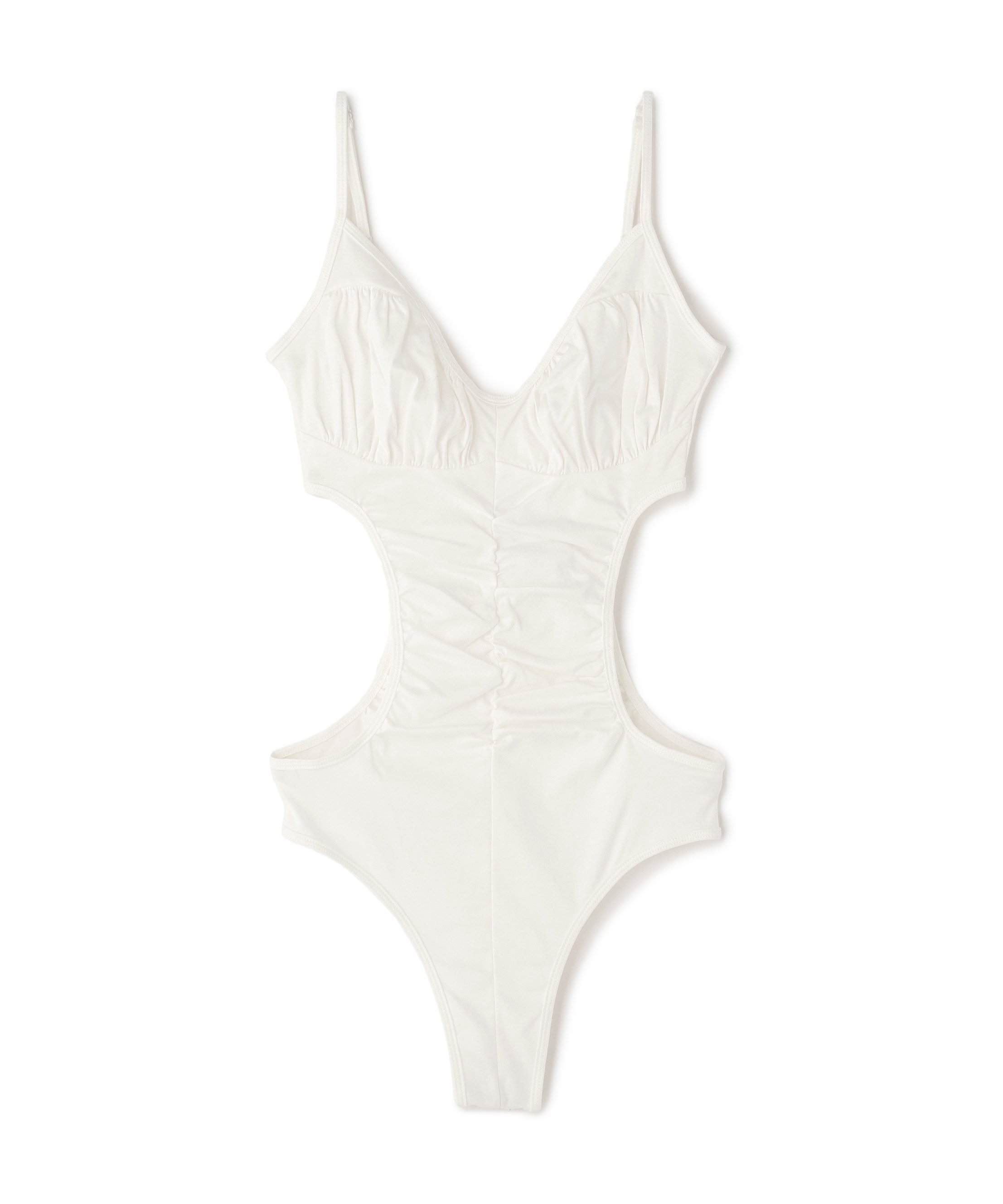 Эта вещь подчеркивает женственность благодаря открытым вырезам по бокам и облегающему силуэту.
