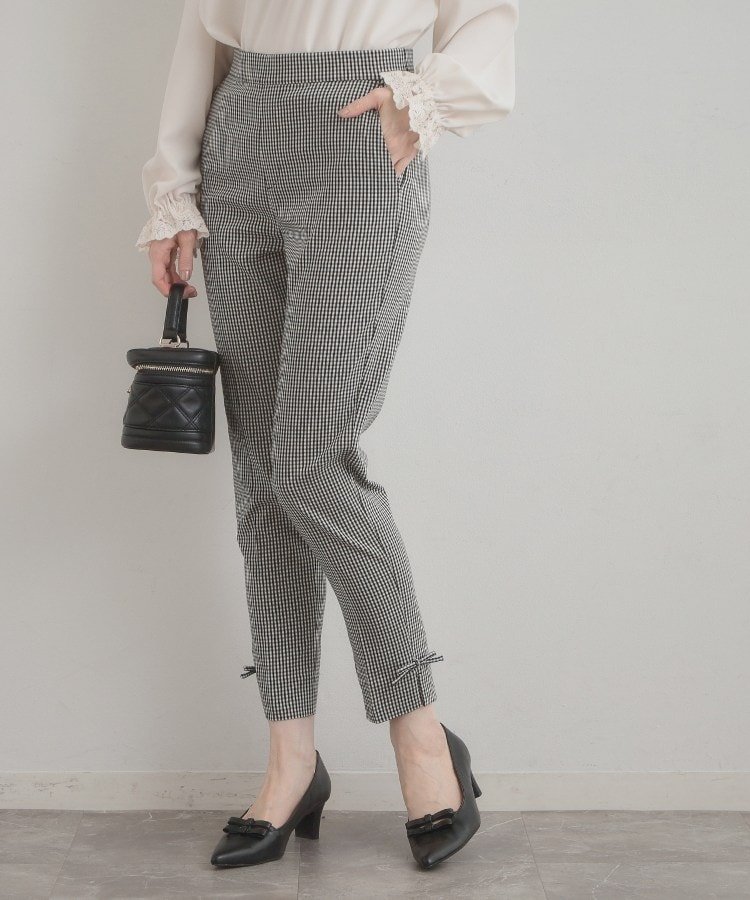 Зауженные брюки-карандаш с дизайном, включающим тонкие ленты из той же ткани, пришитые по бокам подола.
