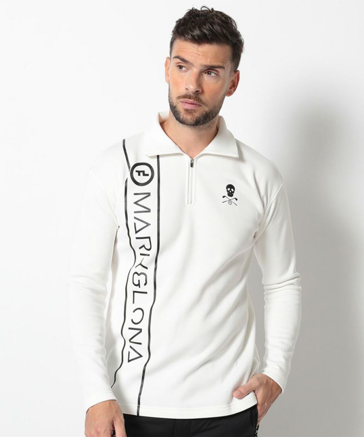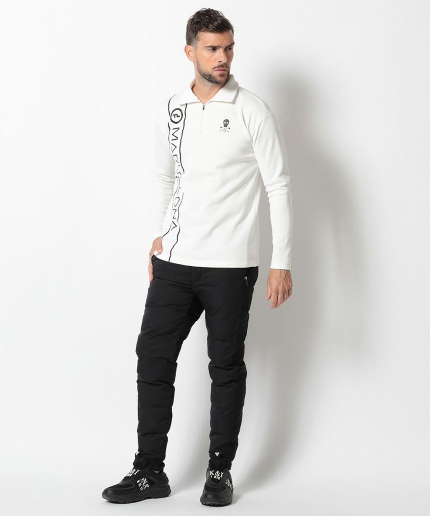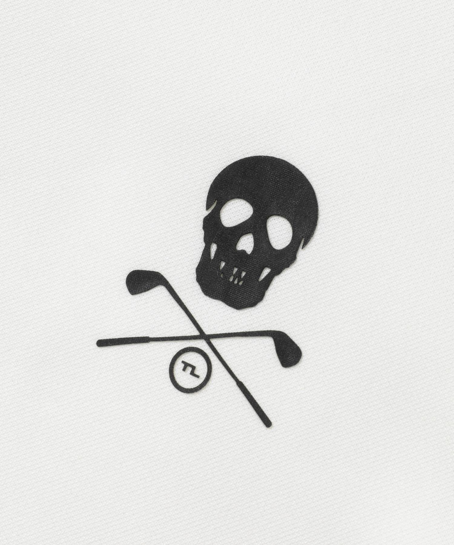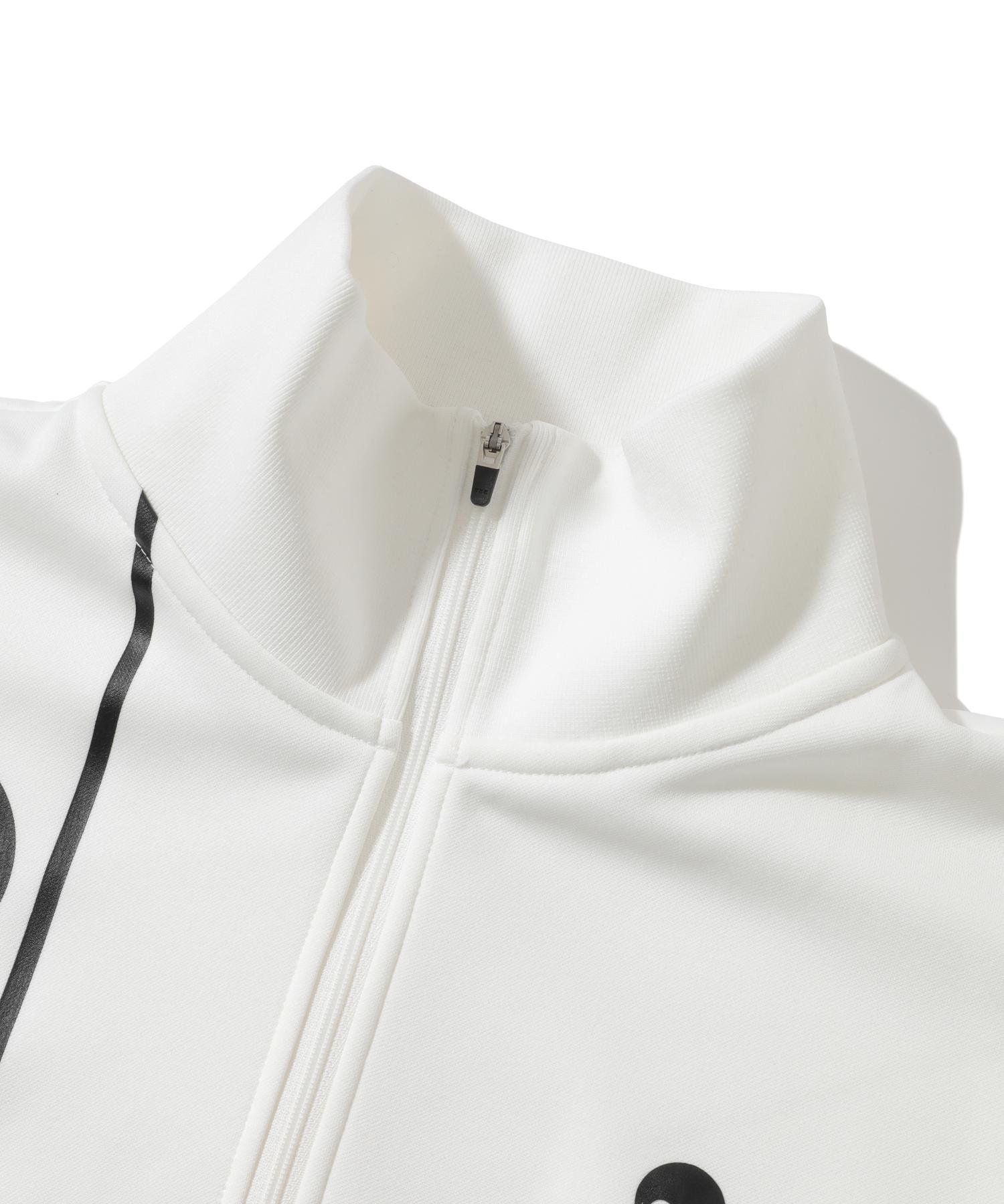 Эта футболка на молнии изготовлена из "KARUISHI" — легкого, теплого трикотажа с начесом. На правой передней части расположен большой логотип T-LINE, а на левой — напечатанный на 3D-принтере череп. Нашивка T-LINE на спине выполнена из двухслойного материала белого цвета на черном фоне. Ее уникальный дизайн создает ощущение глубины при движении.