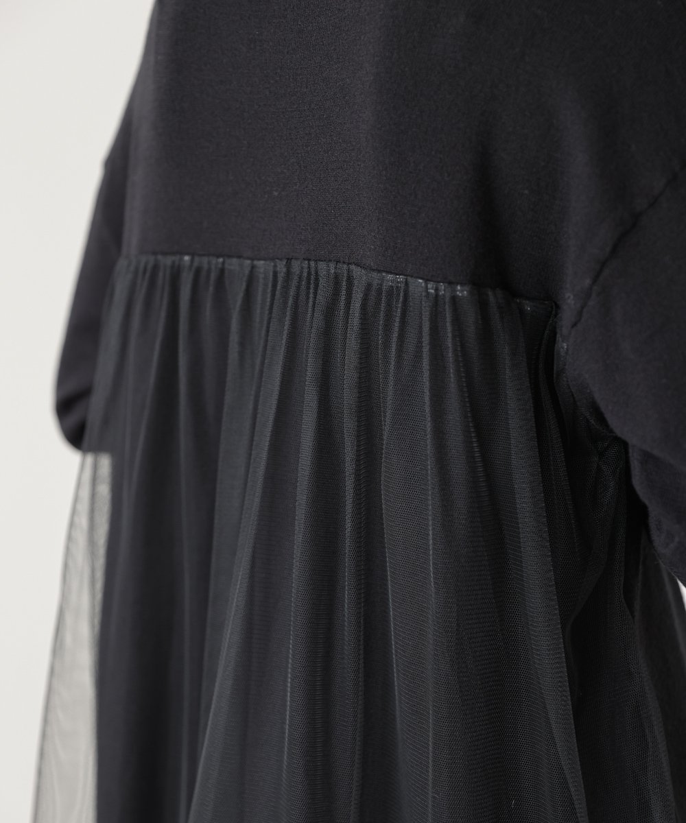 Мягкий трикотажный материал из смеси вискозы приятен для кожи и чрезвычайно удобен в носке. Легкий тюль добавляет ощущение расслабленности, что делает его идеальным для перехода между сезонами. Сочетание трикотажа и тюля создает простой, но элегантный образ.