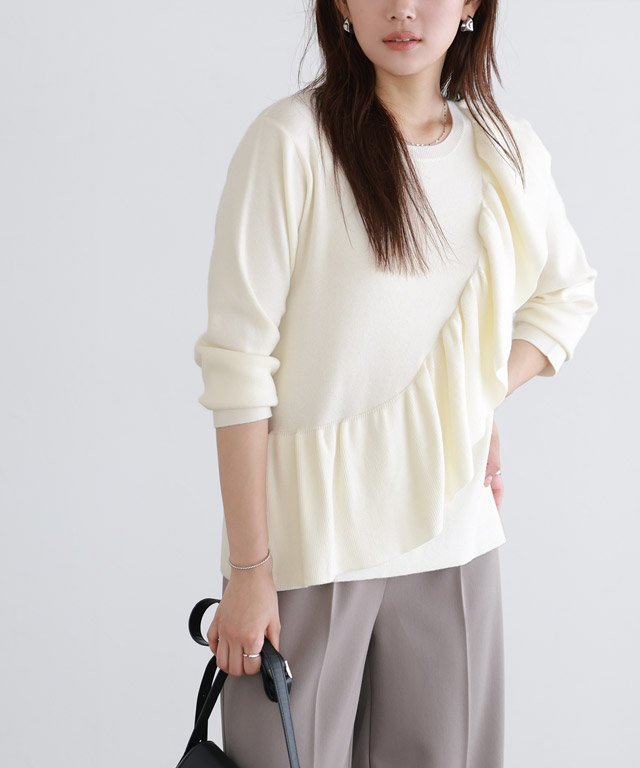 Пуловер с привлекательными оборками, идущими по диагонали от плеч. Большие оборки делают это изделие центральным элементом вашего образа. Сочетайте его с простыми брюками для создания лаконичного образа. ◎Если вы не любите сладкие фасоны, мы рекомендуем сочетать его с джинсами для более повседневного образа.