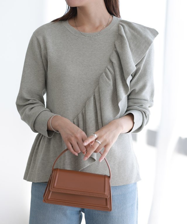 Пуловер с привлекательными оборками, идущими по диагонали от плеч. Большие оборки делают это изделие центральным элементом вашего образа. Сочетайте его с простыми брюками для создания лаконичного образа. ◎Если вы не любите сладкие фасоны, мы рекомендуем сочетать его с джинсами для более повседневного образа.