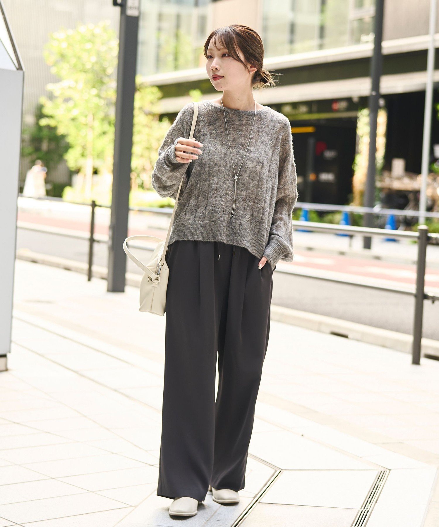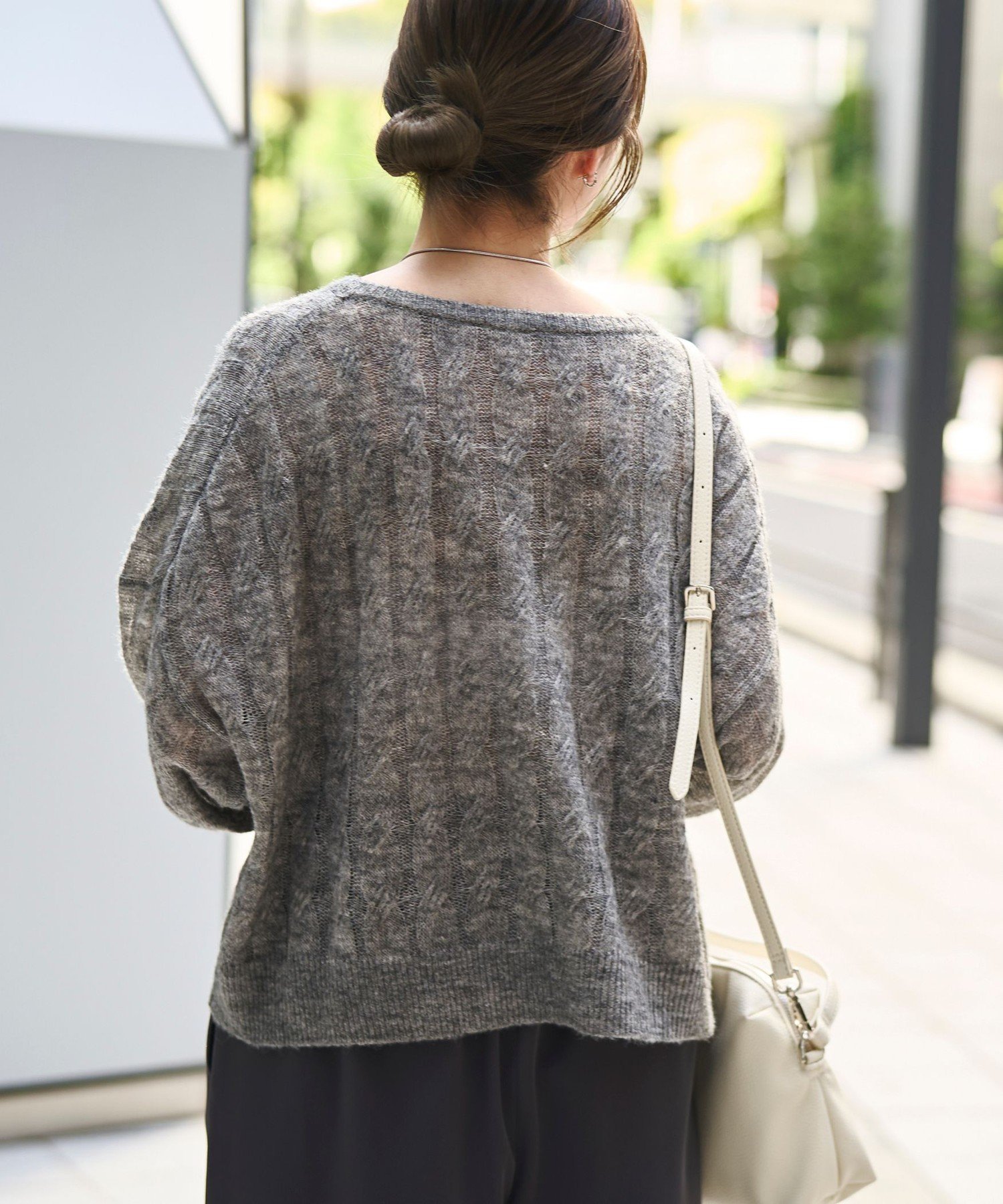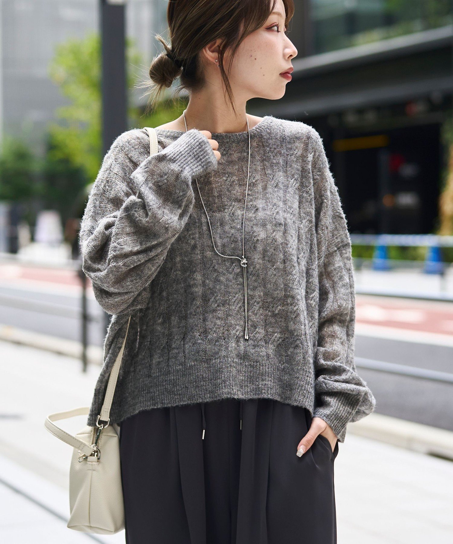 Свитер крупной вязки с полупрозрачной тканью, придающей ему свежий и современный вид.