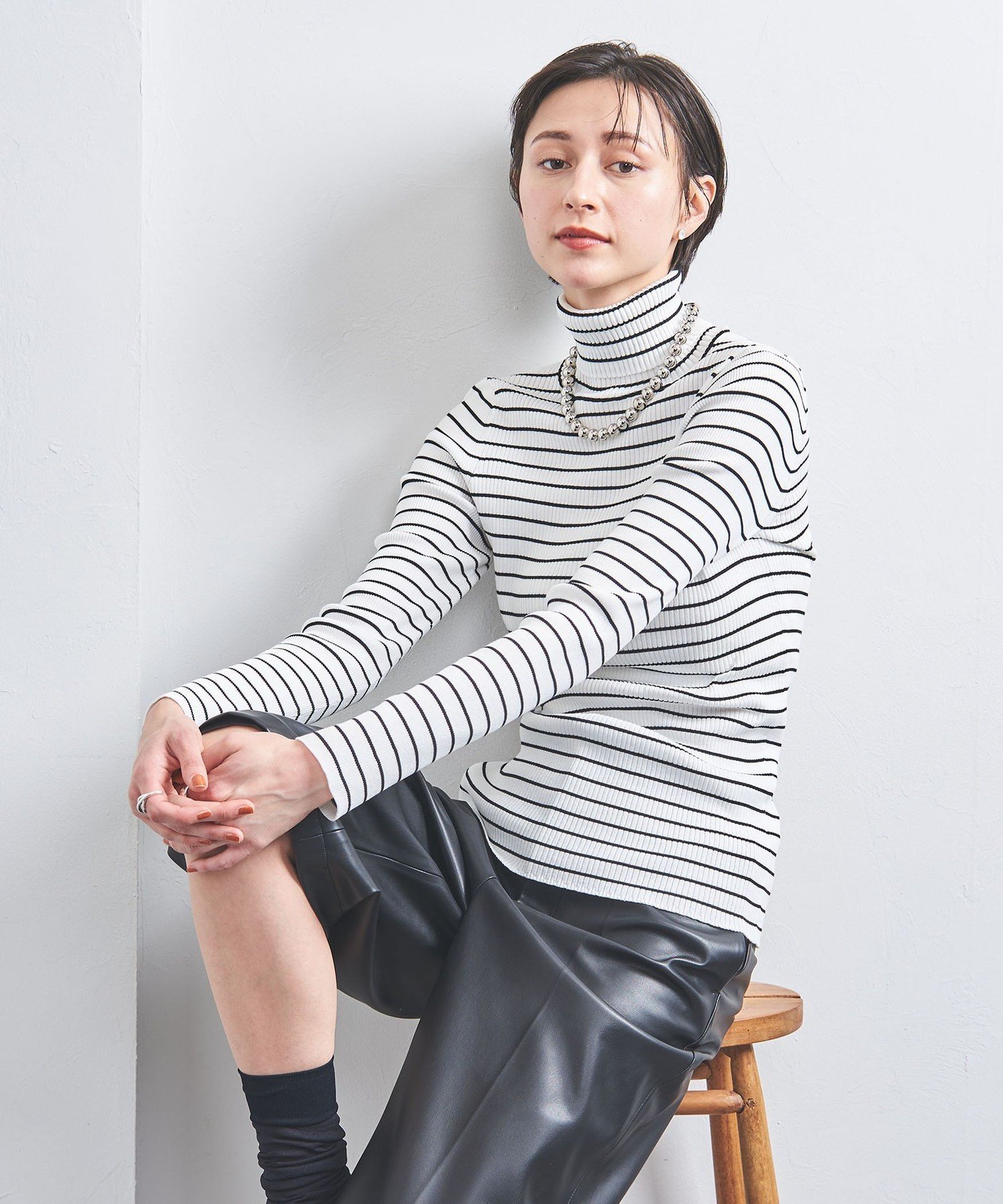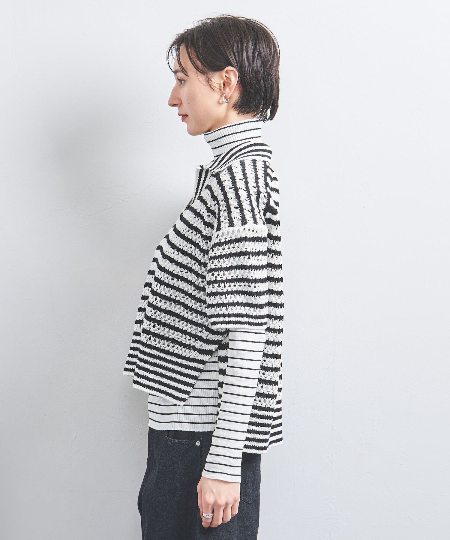 - Поло Other 1 с воротником-стойкой выполнено в бело-черном цвете, а водолазка имеет узкий бело-черный полосатый узор.