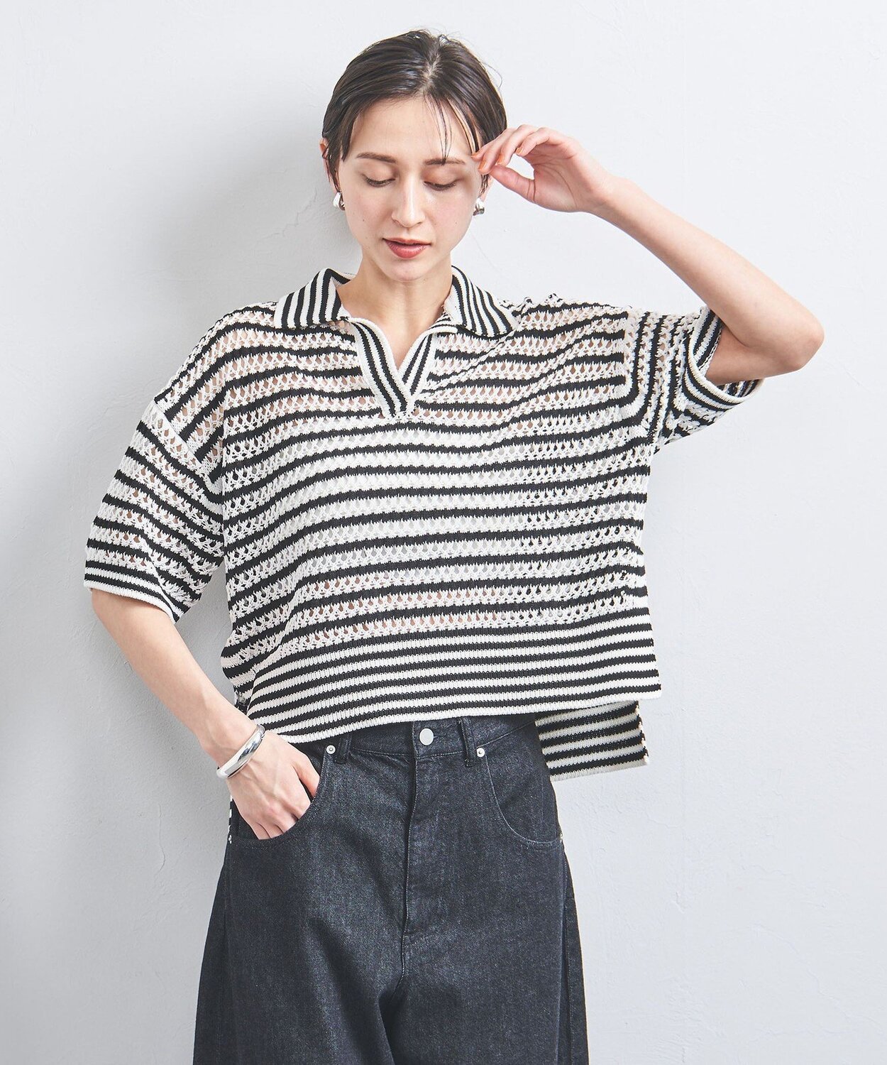 Поло имеет витую вязку, напоминающую сетку, а легкие рукава три четверти, разная длина спереди и сзади, а также боковые разрезы добавляют образу изысканности.