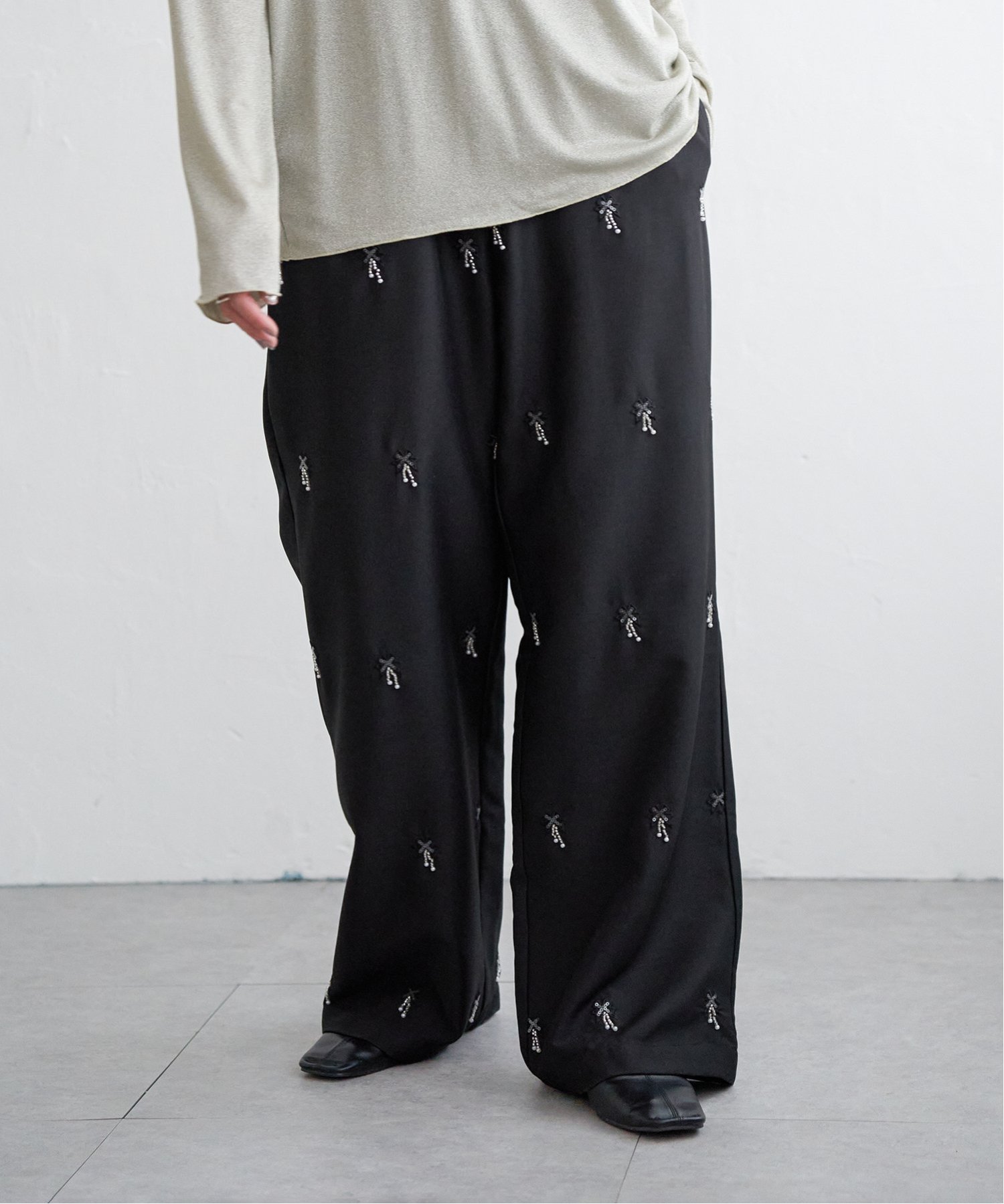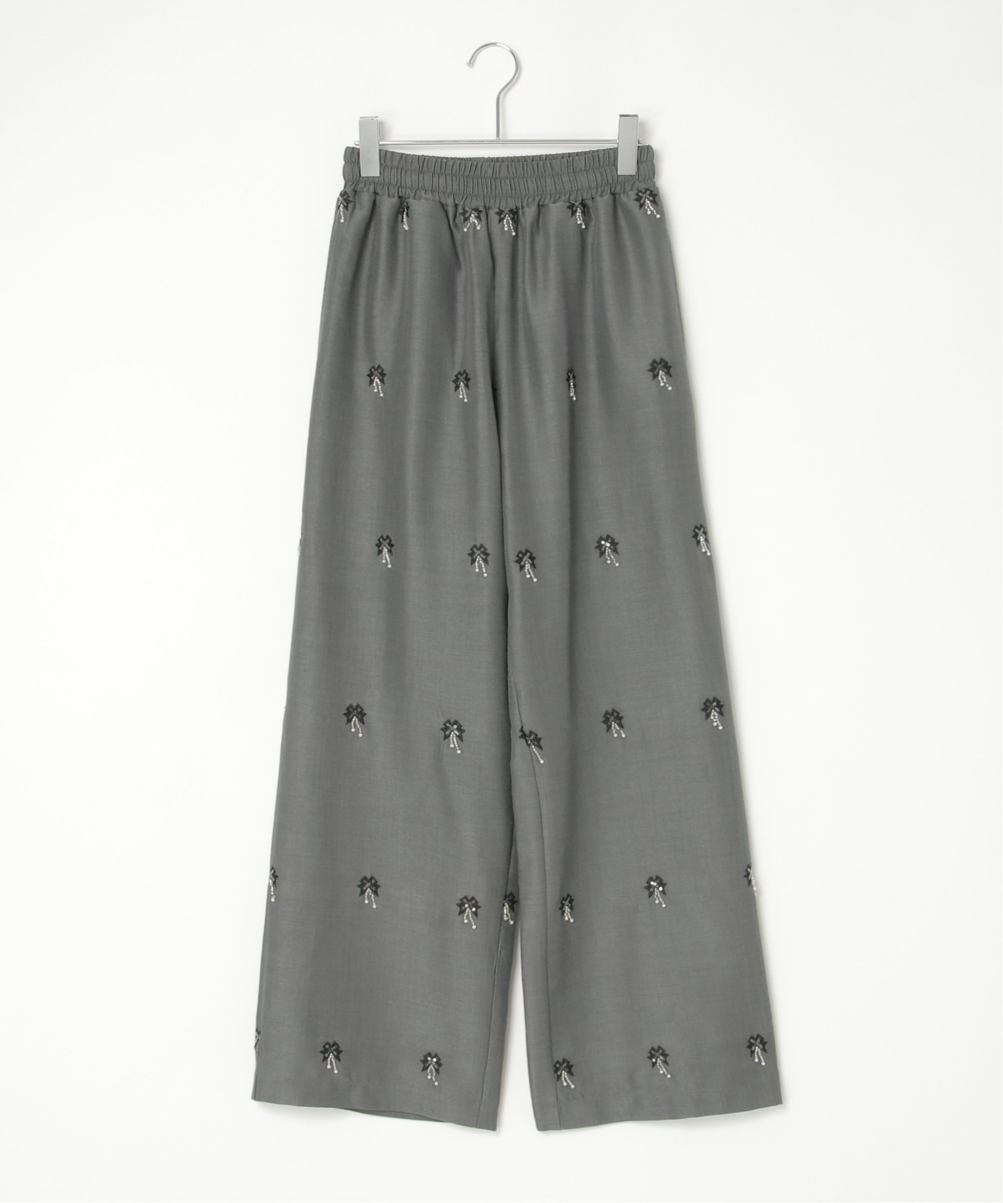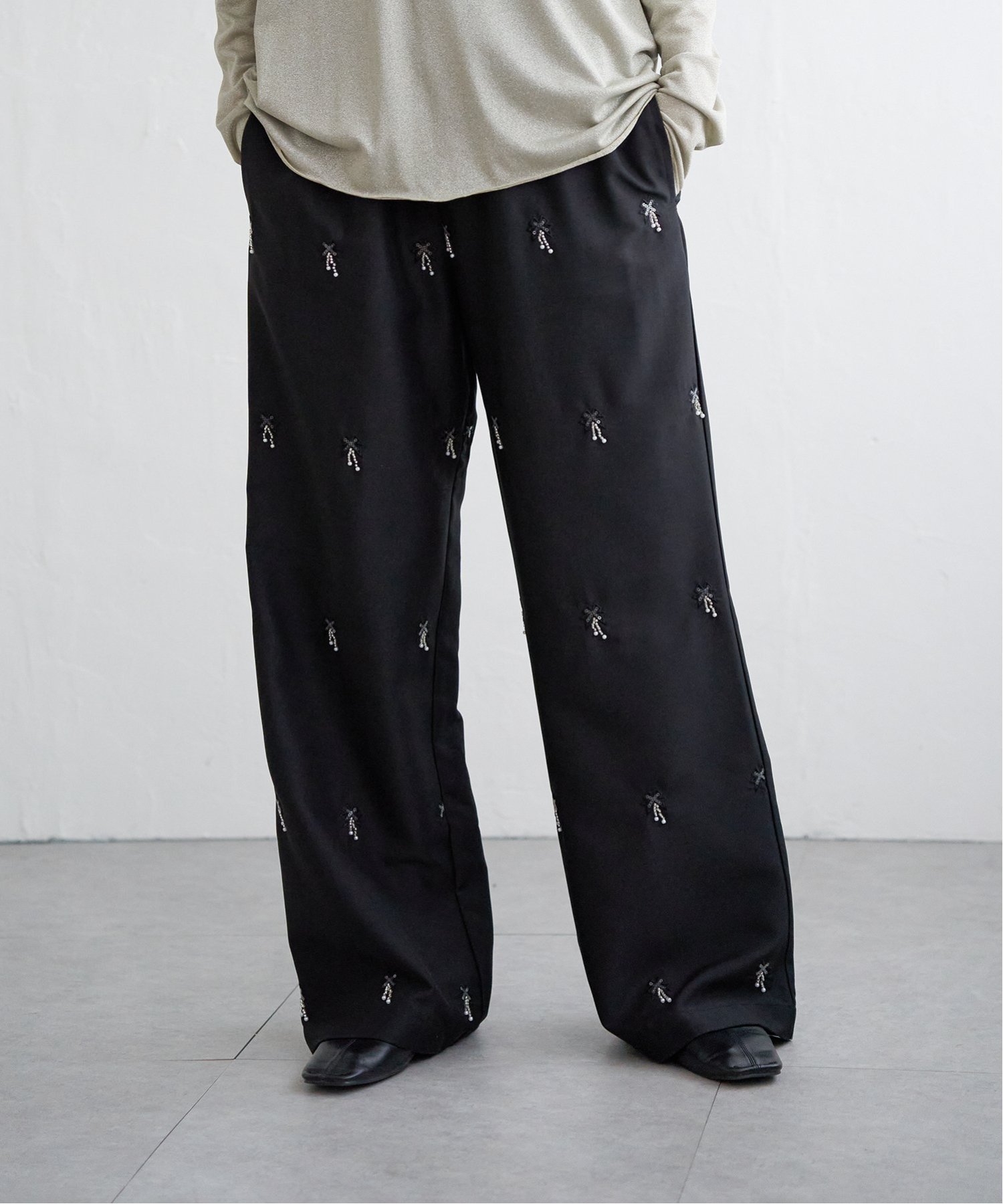 Вышивка бисером на этих широких брюках добавляет нотку гламура к простому дизайну.