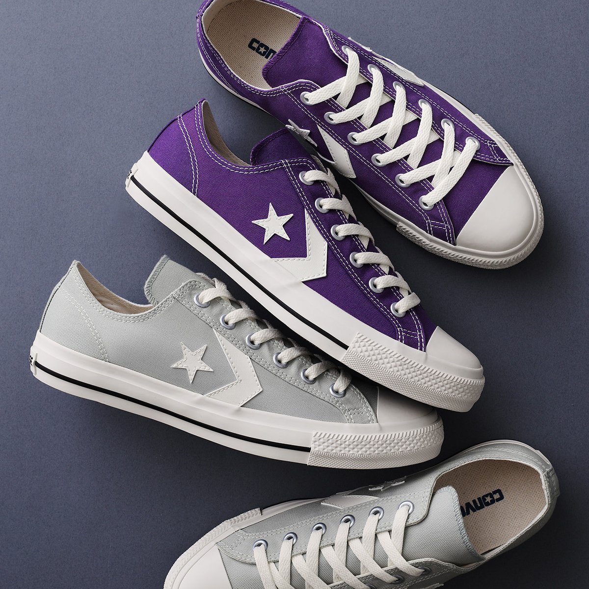 Доступны в двух классических цветах Converse: фиолетовом и сером.
