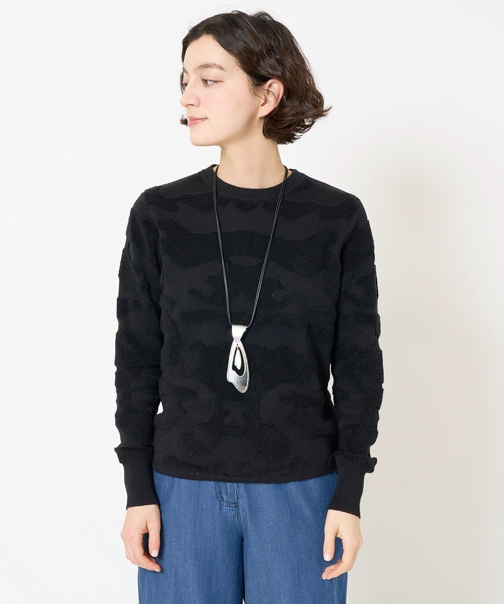Этот элегантный пуловер украшен тонким камуфляжным узором того же цвета, выполненным жаккардом.