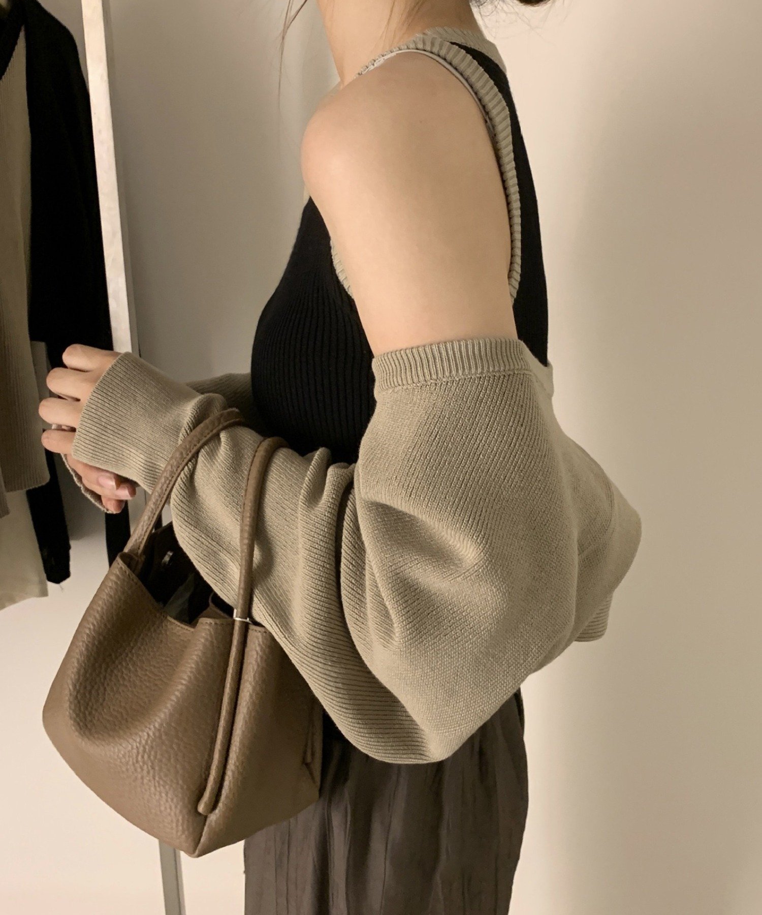 Сочетание объемного кардигана с майкой создает трехмерный силуэт.