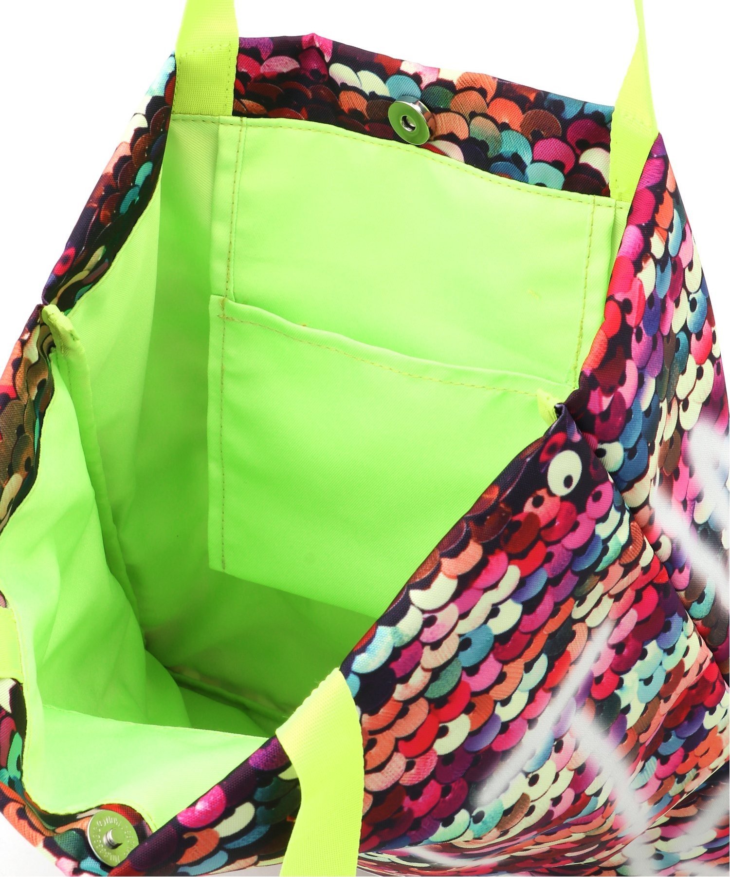 Эта яркая, сверкающая сумка-тоут с пайетками имеет неоновые ручки и подкладку, а дизайн выглядит так, будто он выполнен аэрозольной краской.