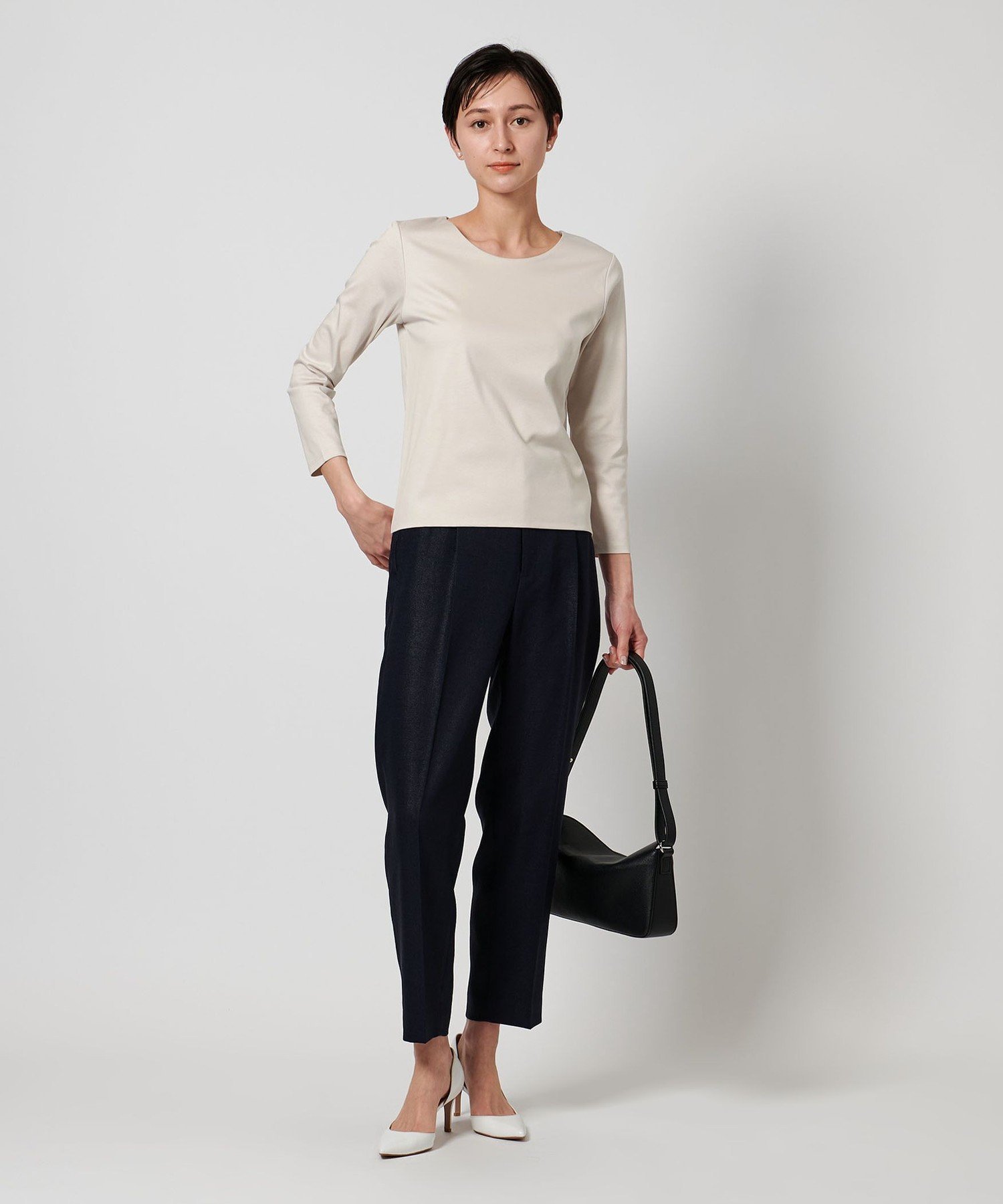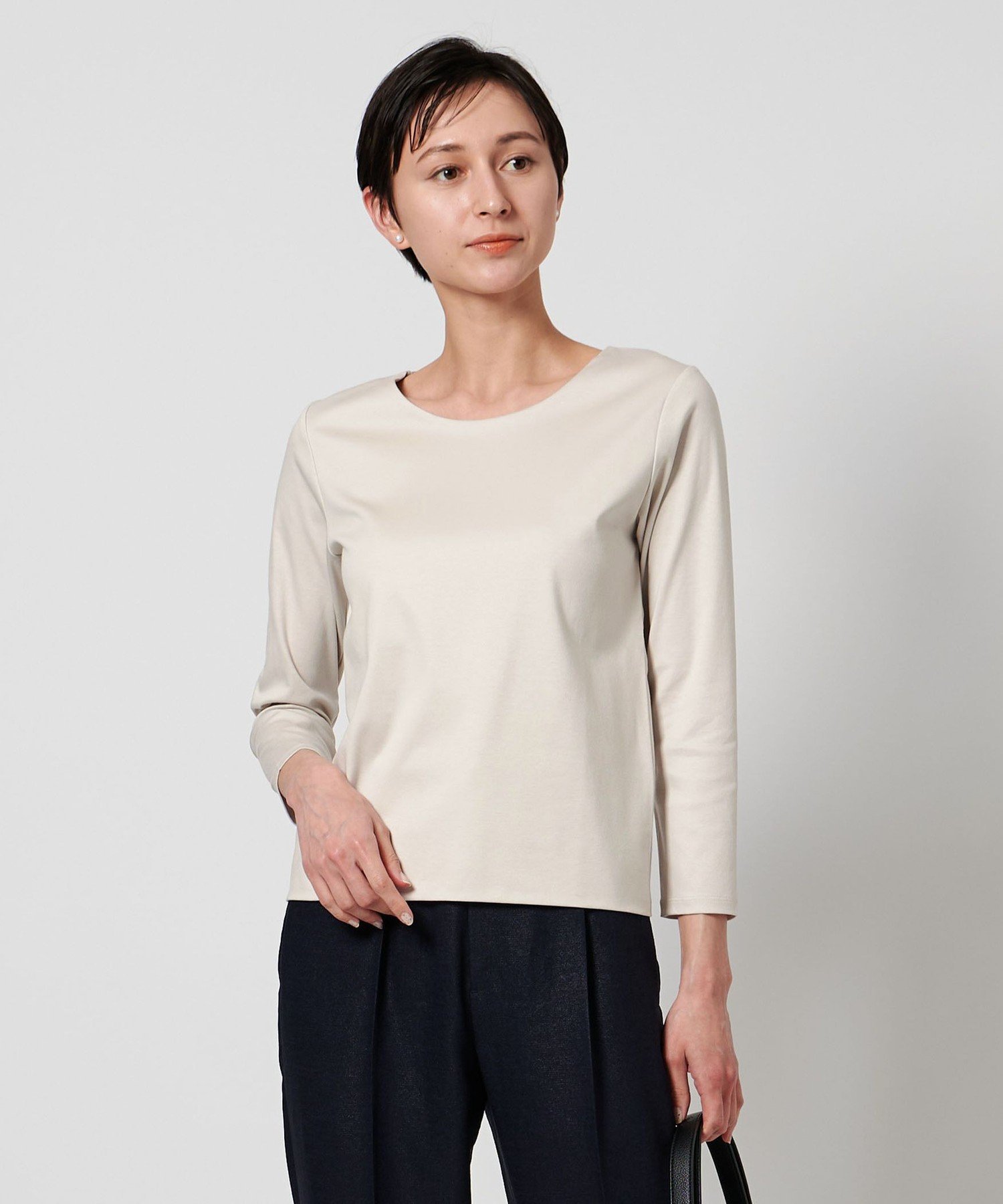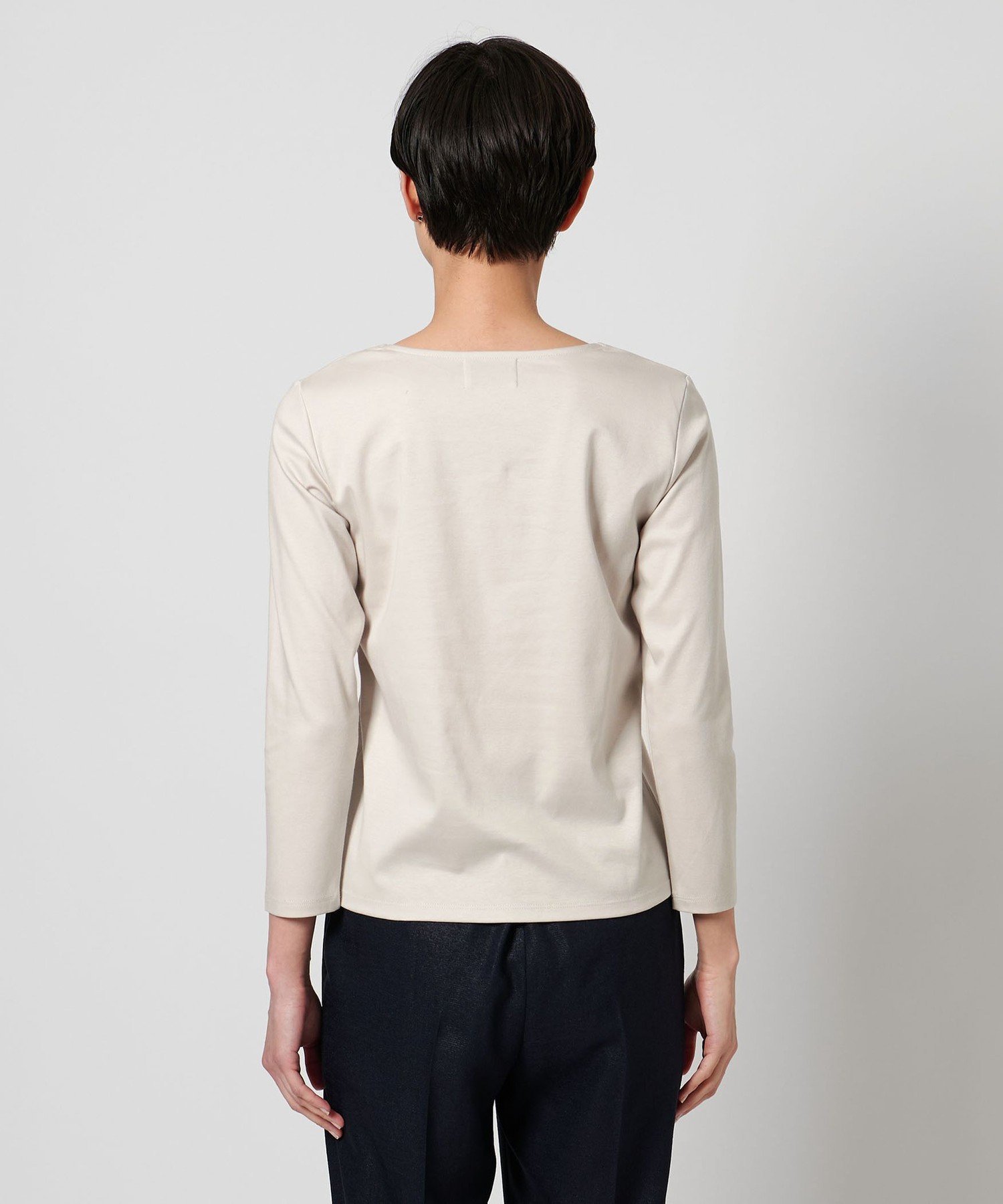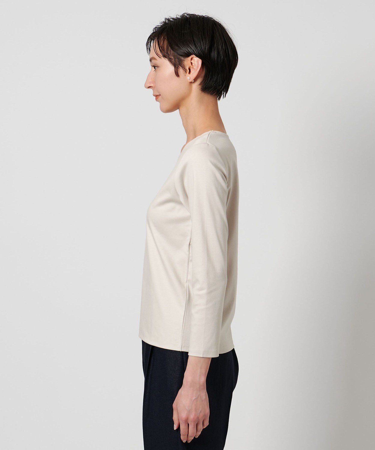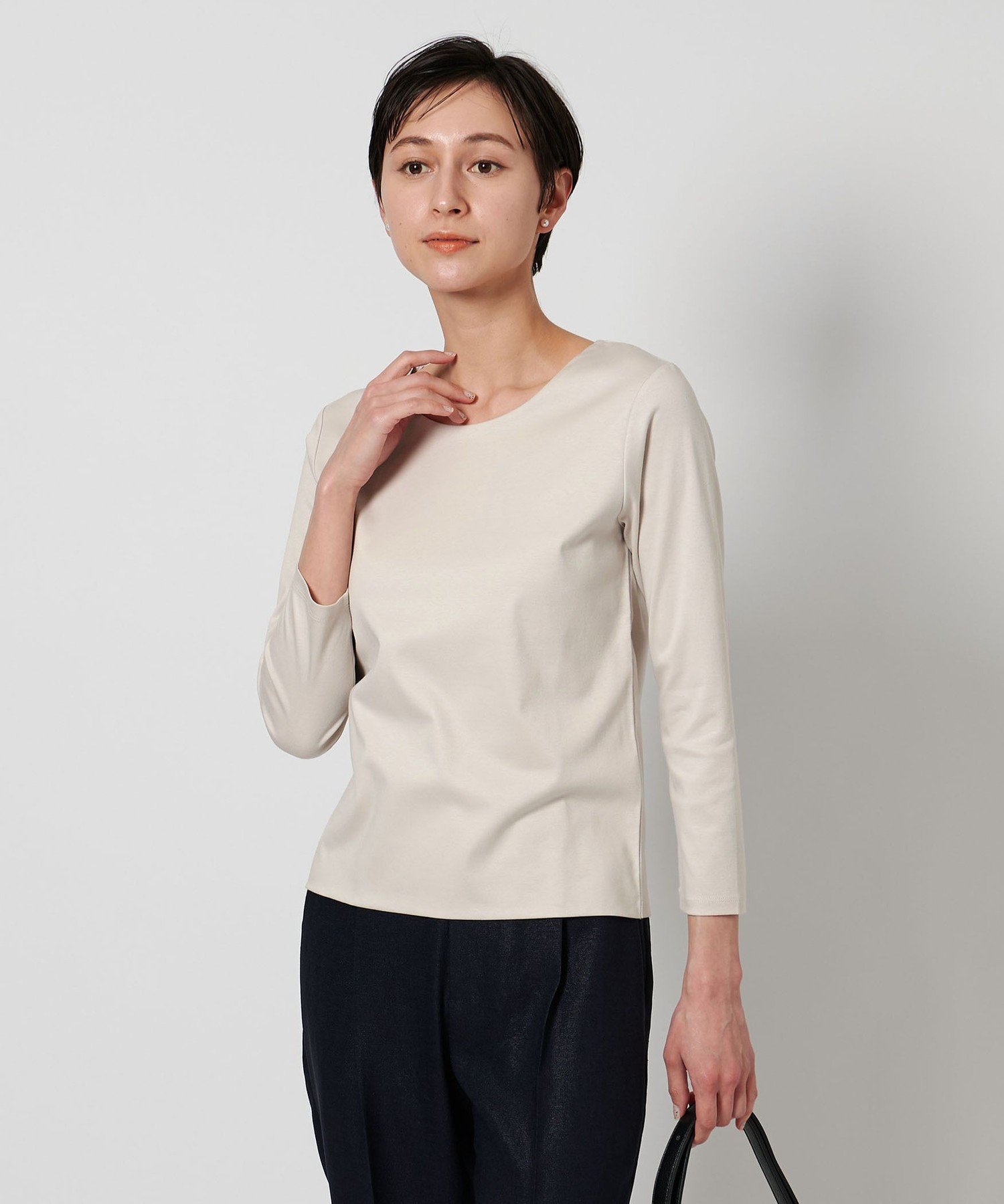 Топ с круглым вырезом и рукавами три четверти, сшитый из гладкого хлопкового материала.