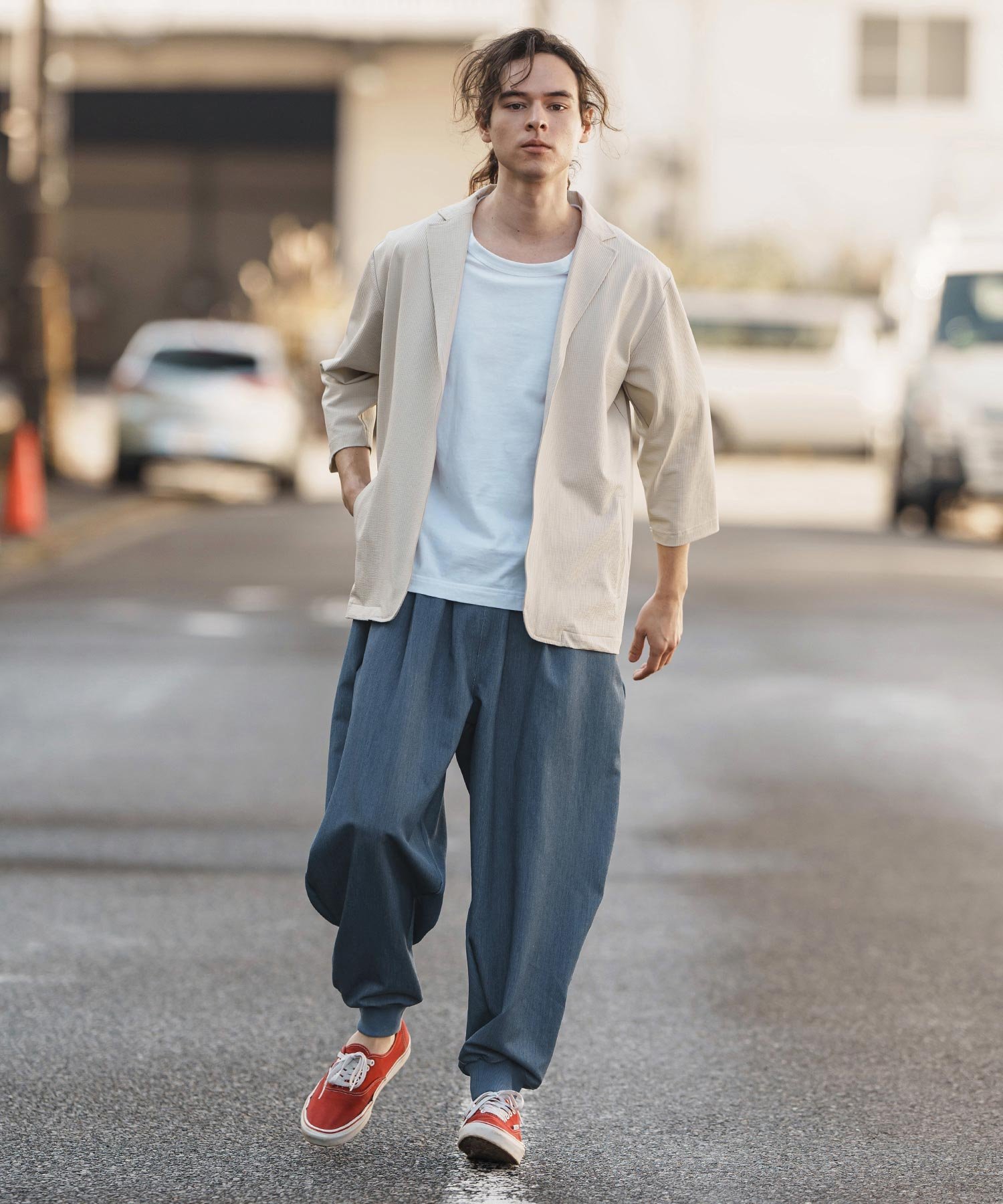 Силуэт свободный в области бедер и ягодиц, сужается от колена к низу, создавая силуэт брюк-баллонов.