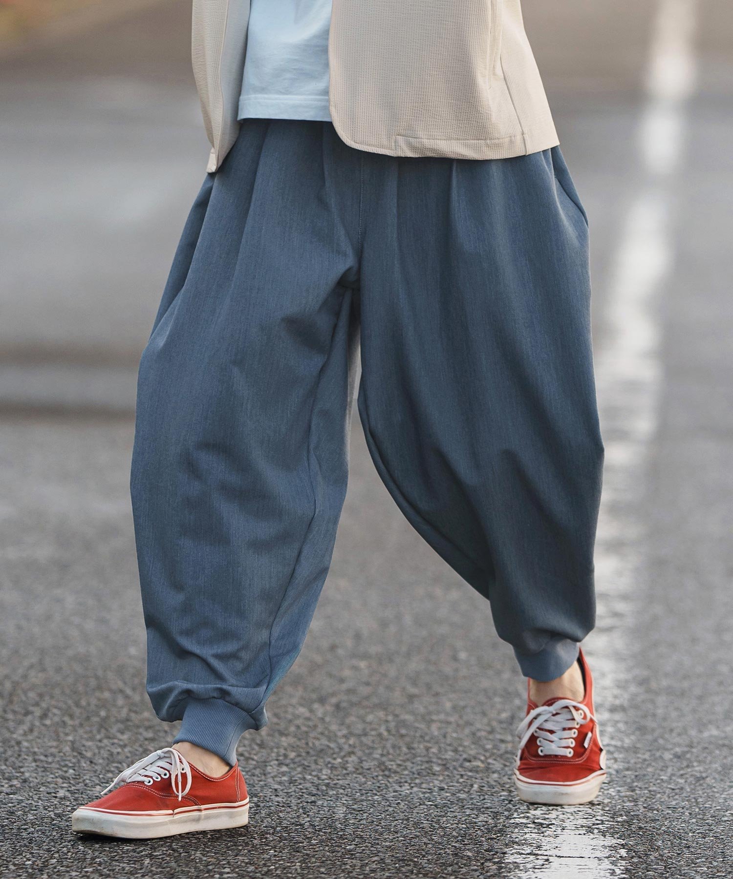 Модель представляет собой спортивные брюки-джоггеры силуэта «баллон» с ребристым низом.
