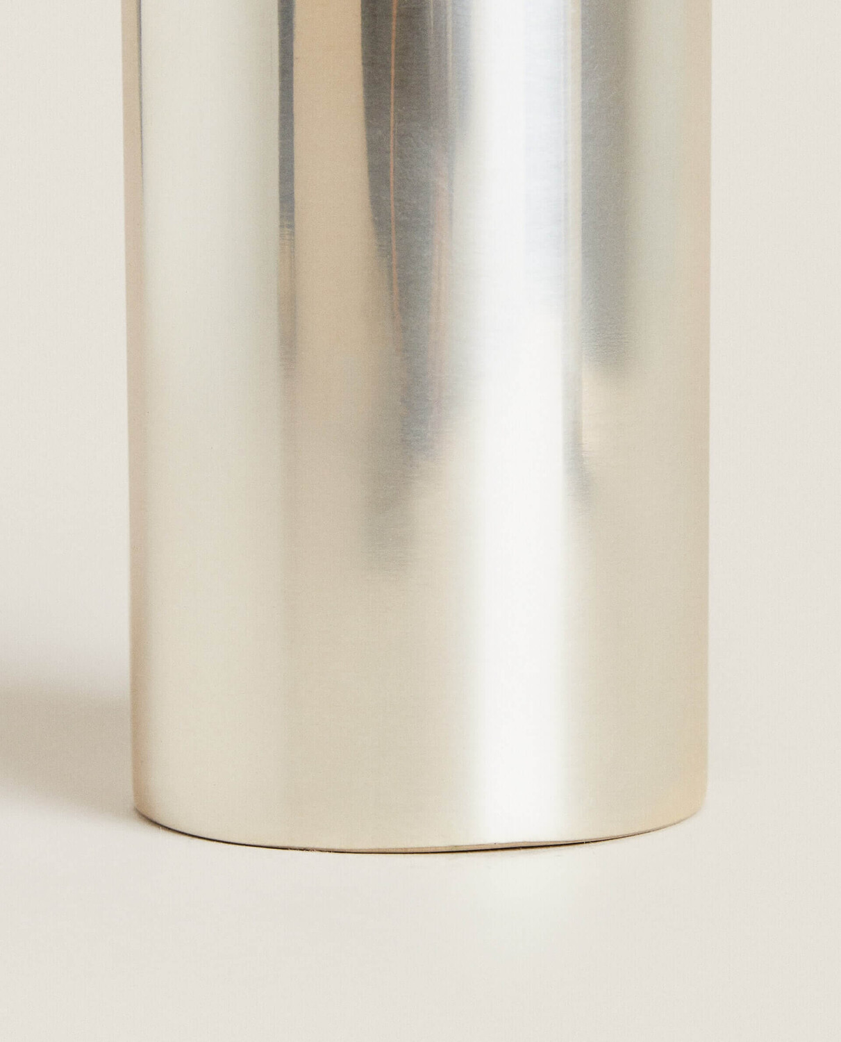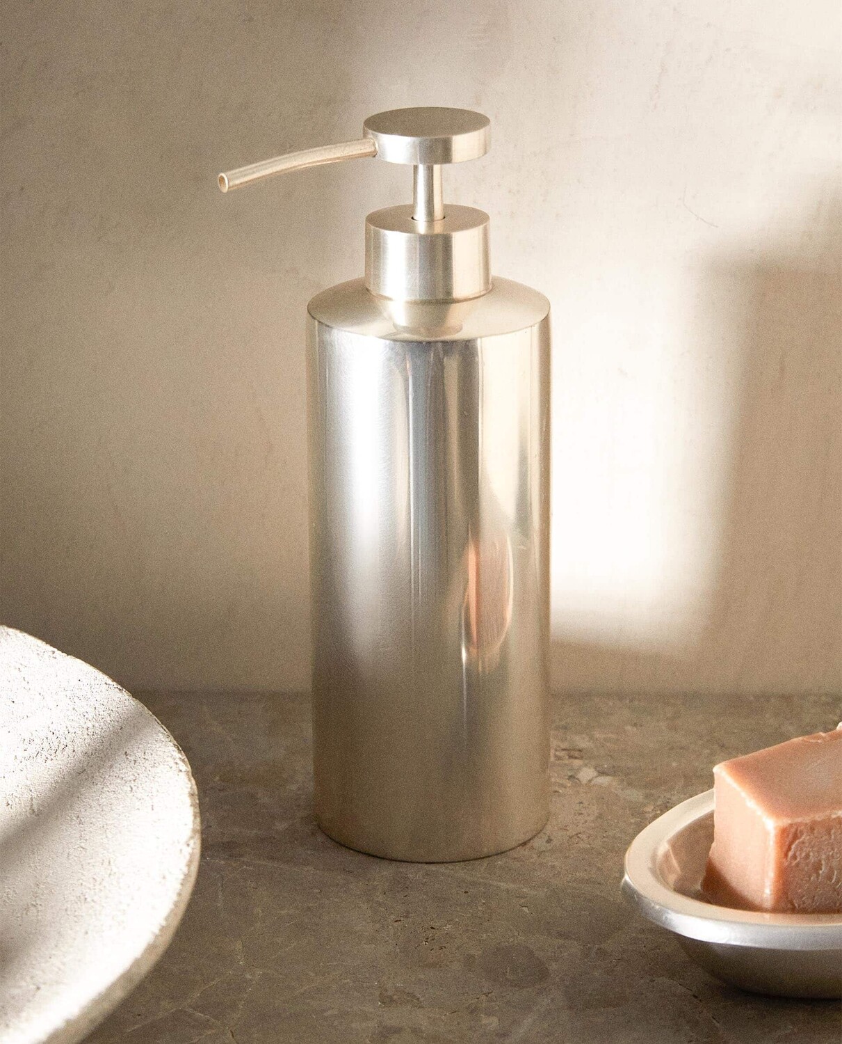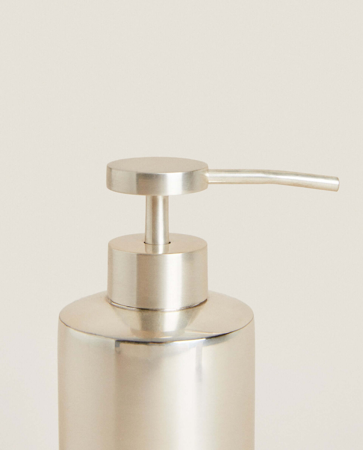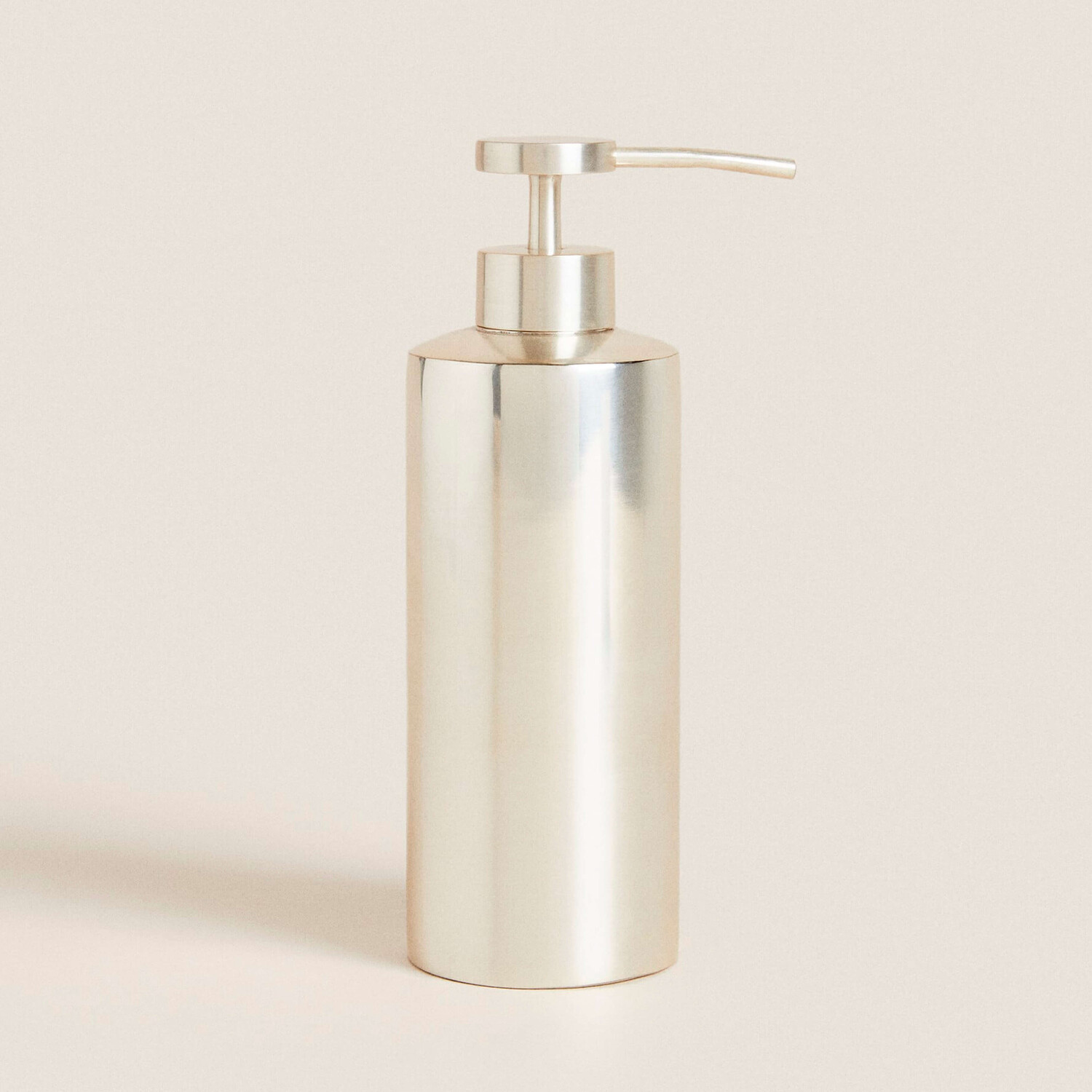 Металлический дозатор для жидкого мыла серебристого цвета.