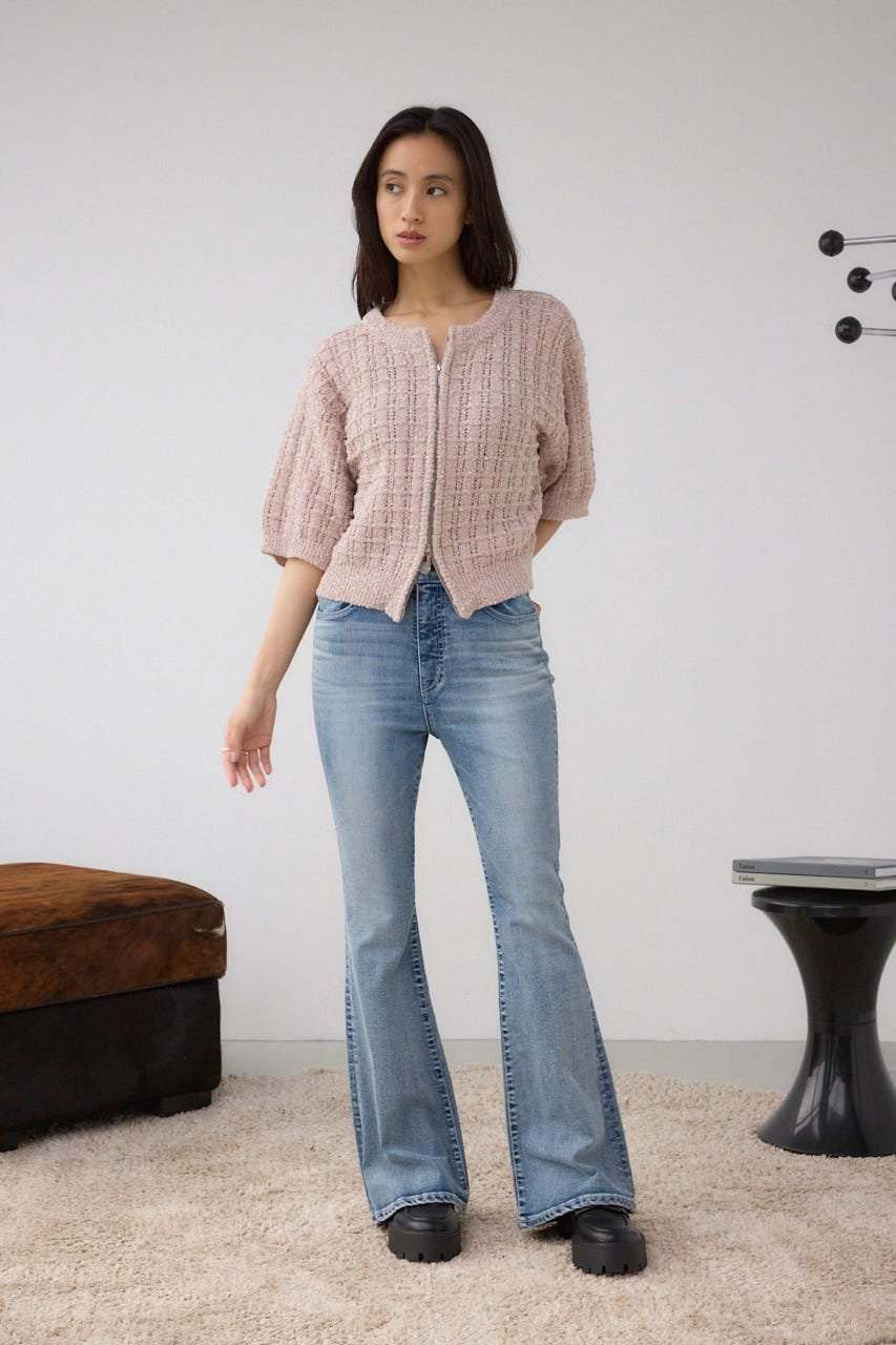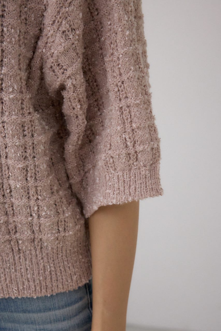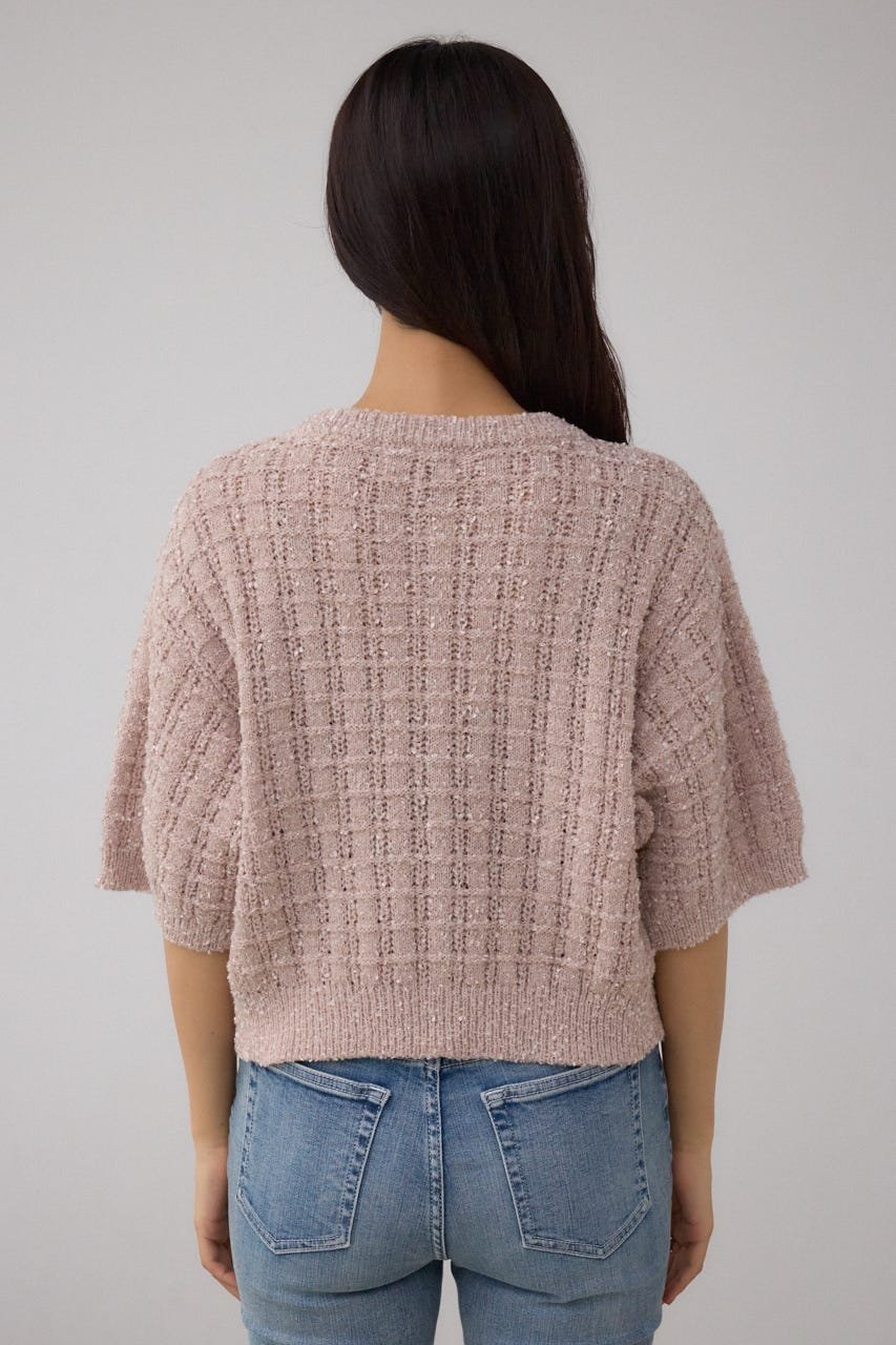 Этот трикотажный топ изготовлен из фактурной пряжи и блестящей пряжи, смешанных вместе для создания узора, напоминающего твид.