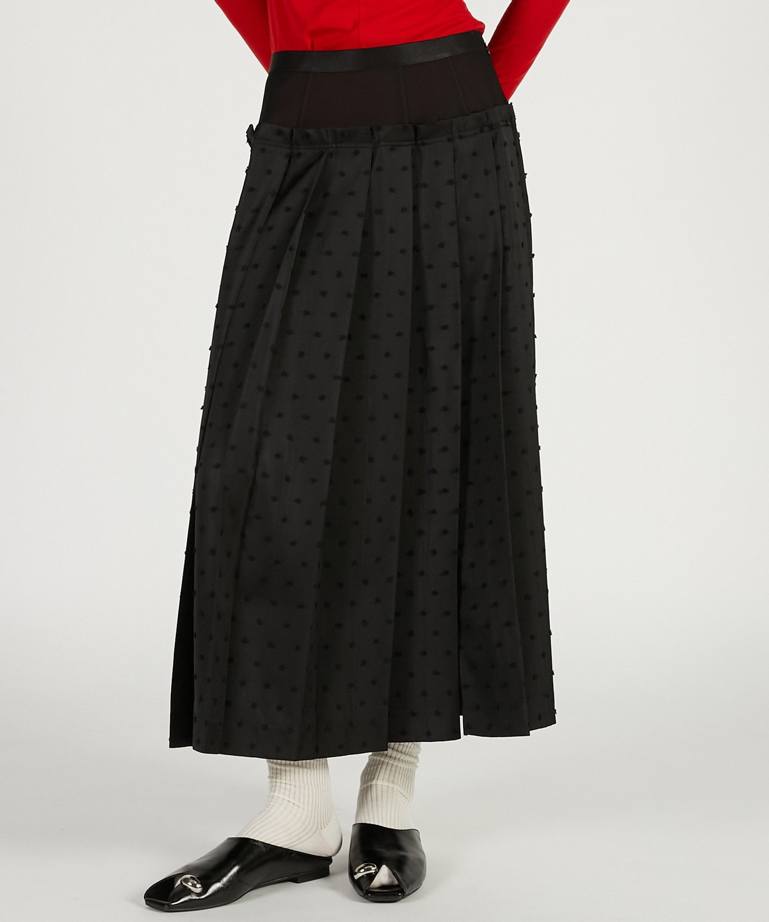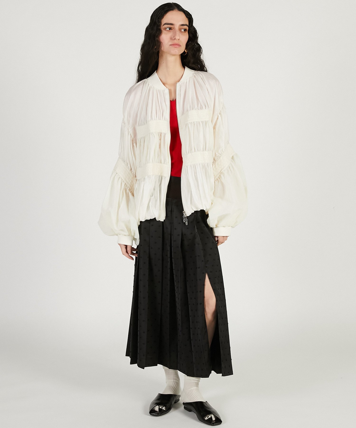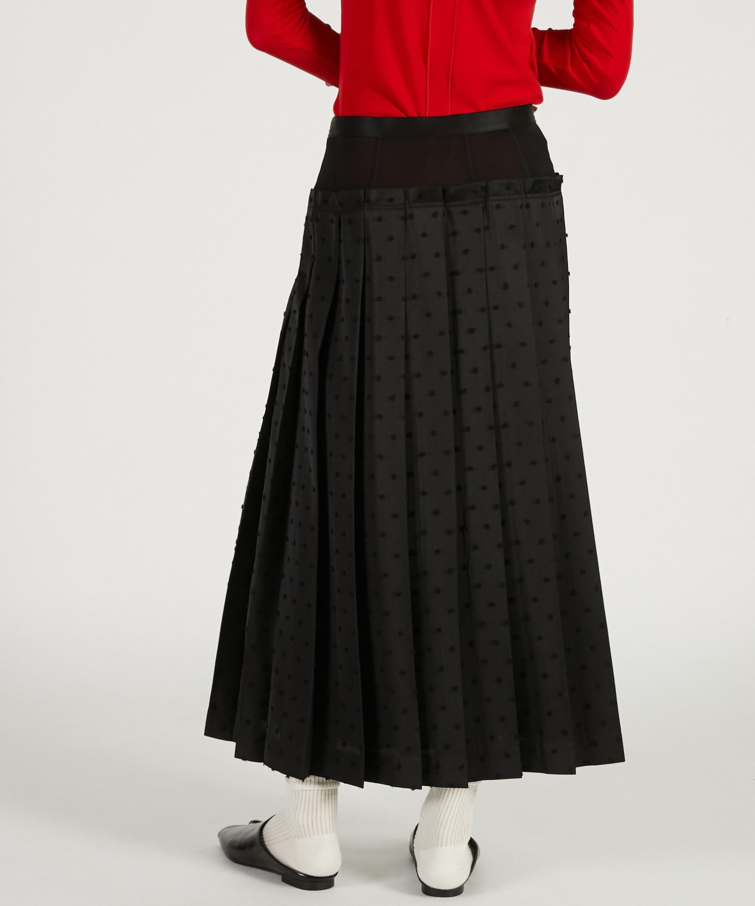 Ключевой момент — контраст между жаккардовым атласом в горошек и прозрачной сетчатой тканью.